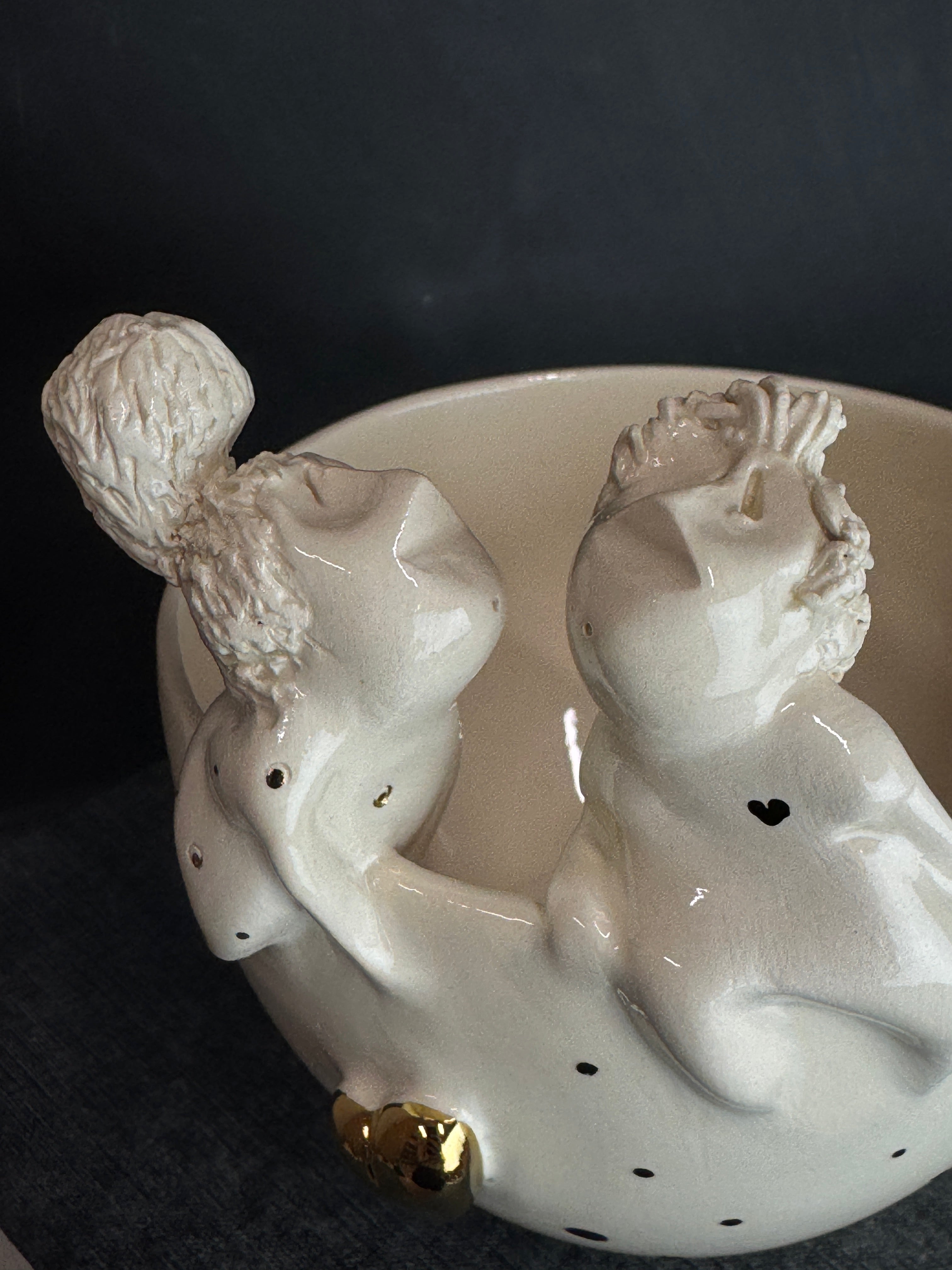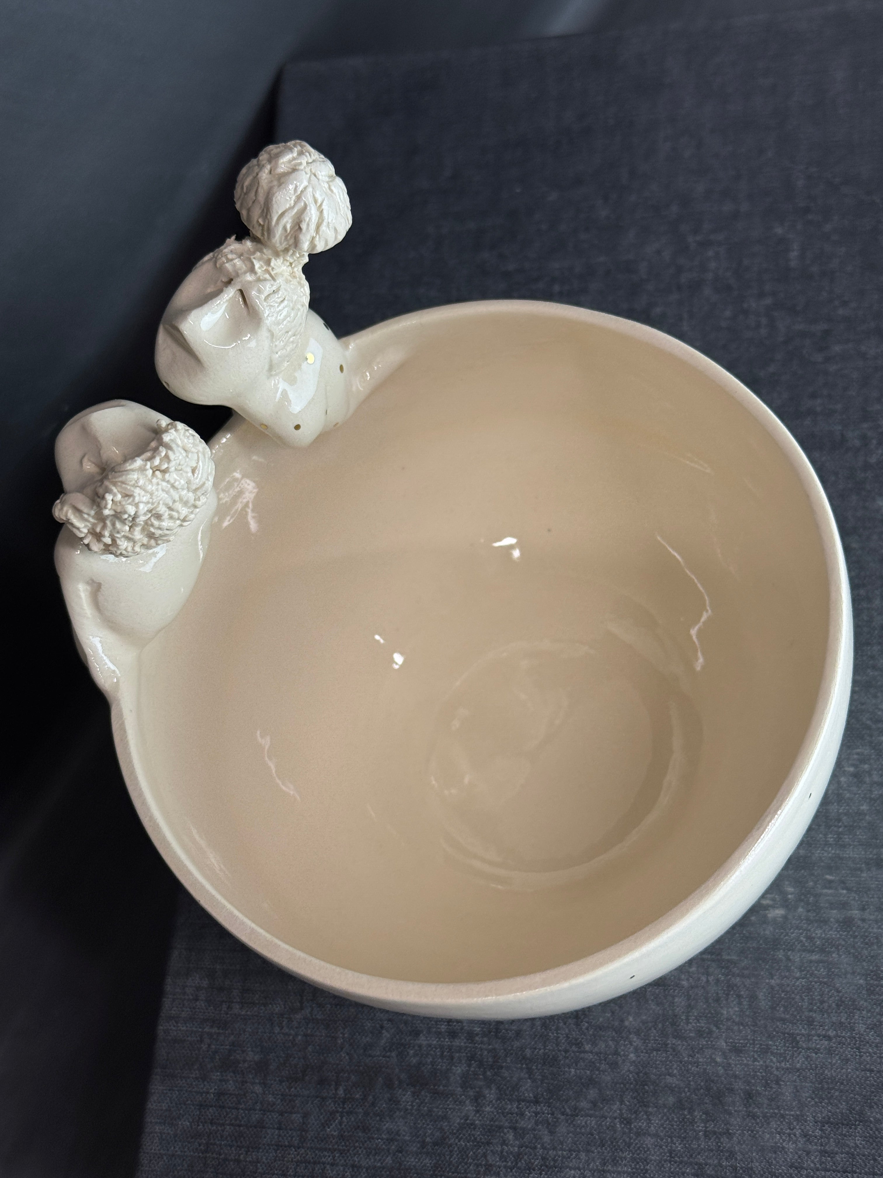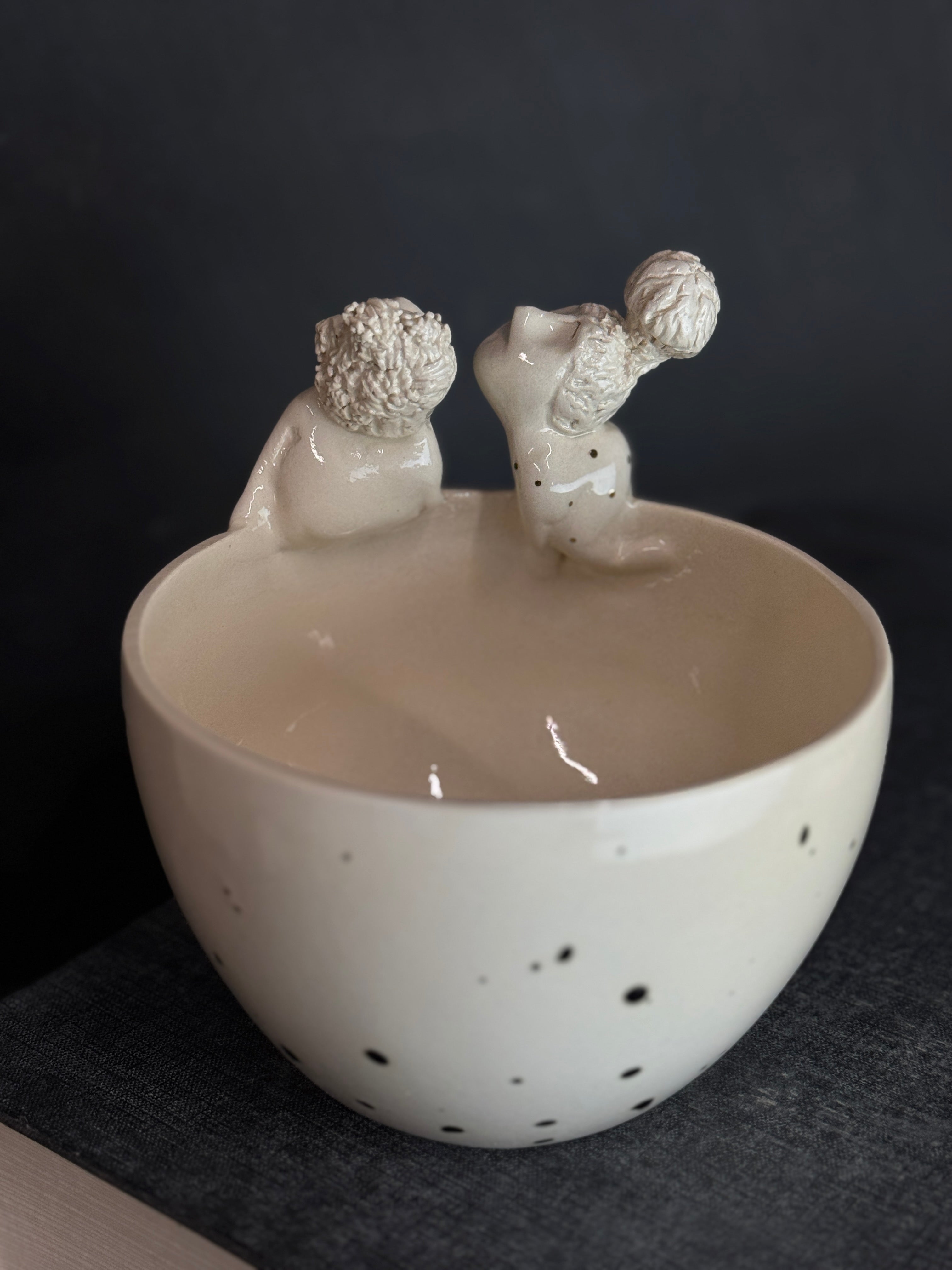 Rankų darbo balto molio dubenėlis su žmogučiais ant krašto. Dengtas skaidria glazūra su juodais taškeliais.