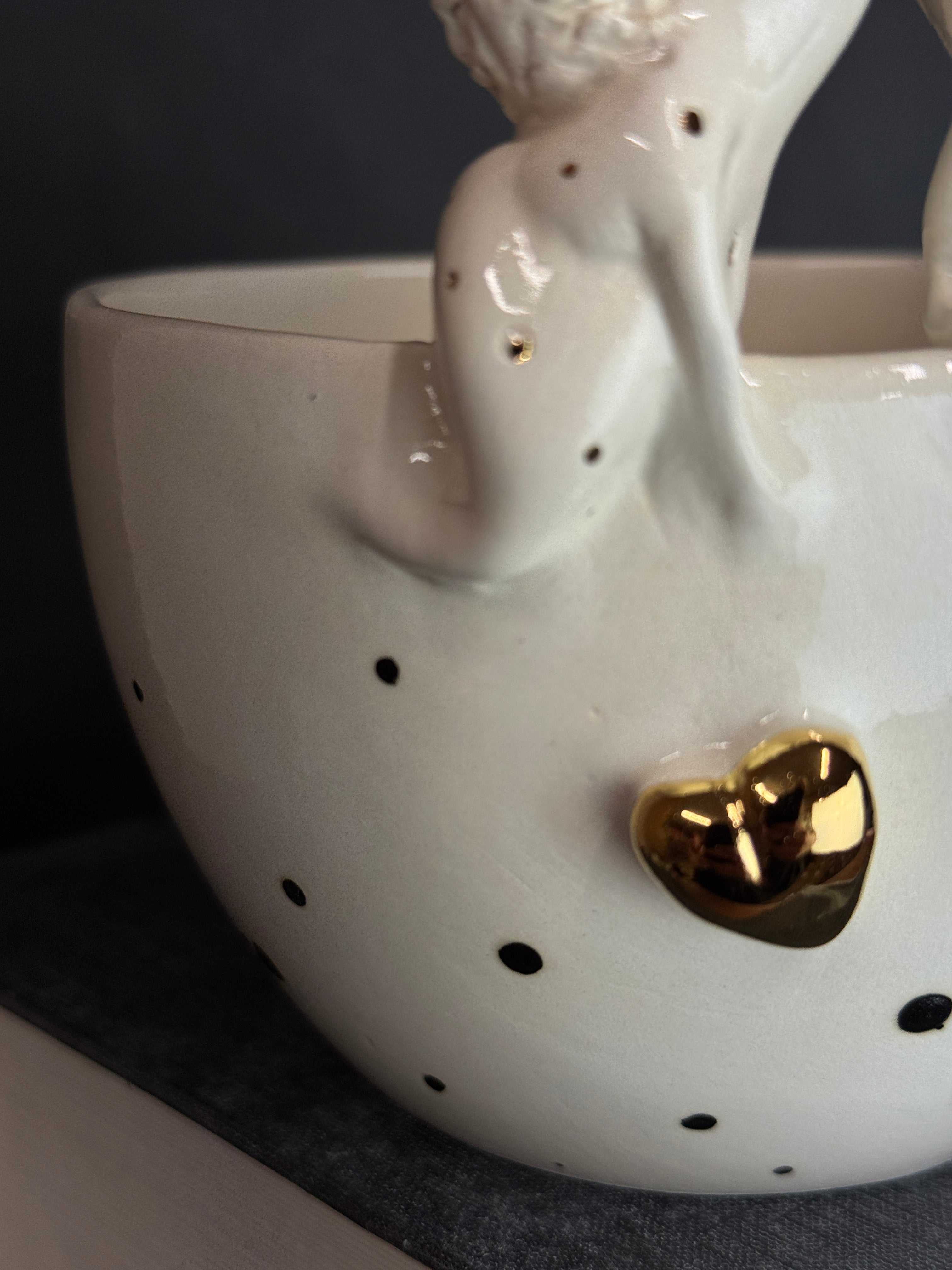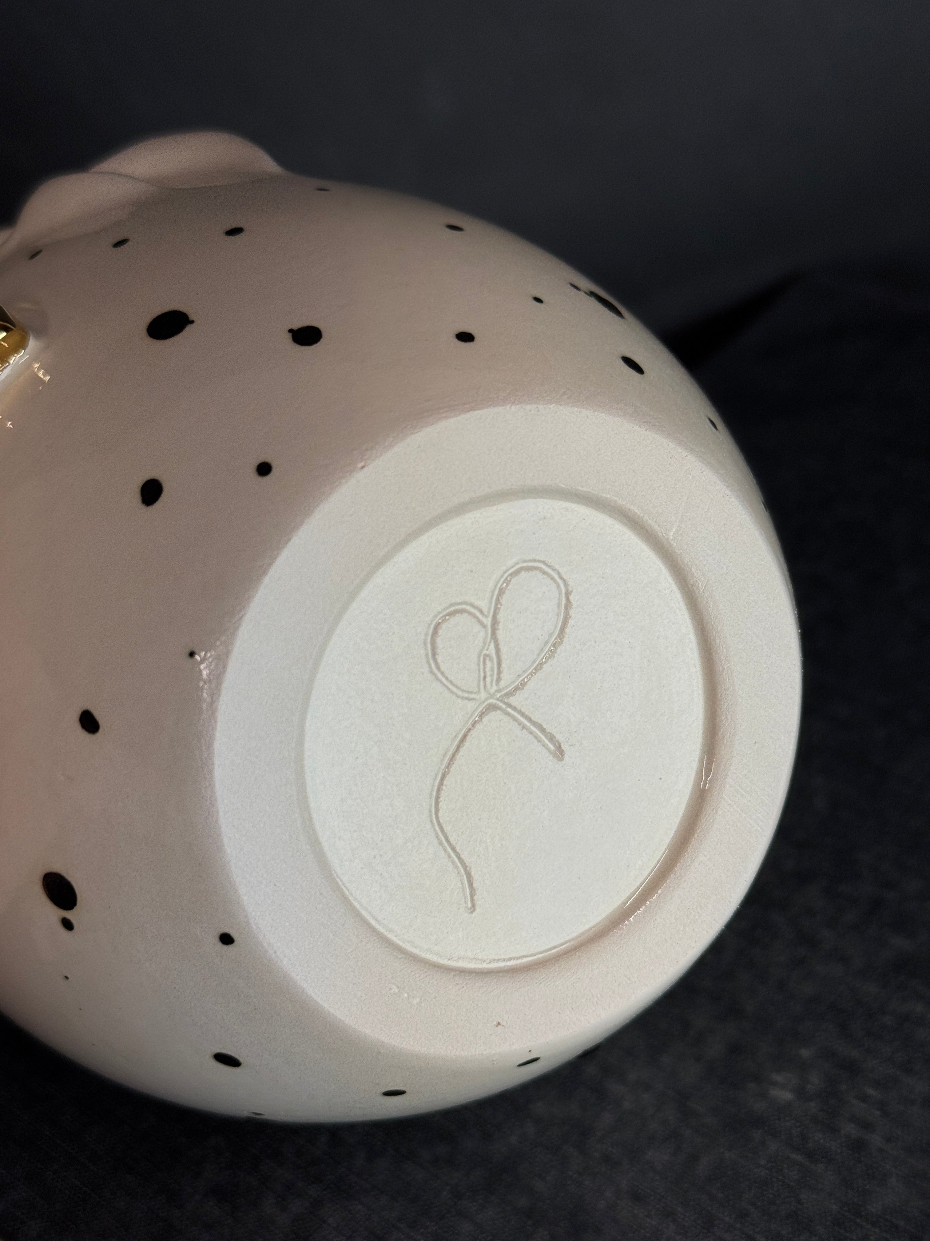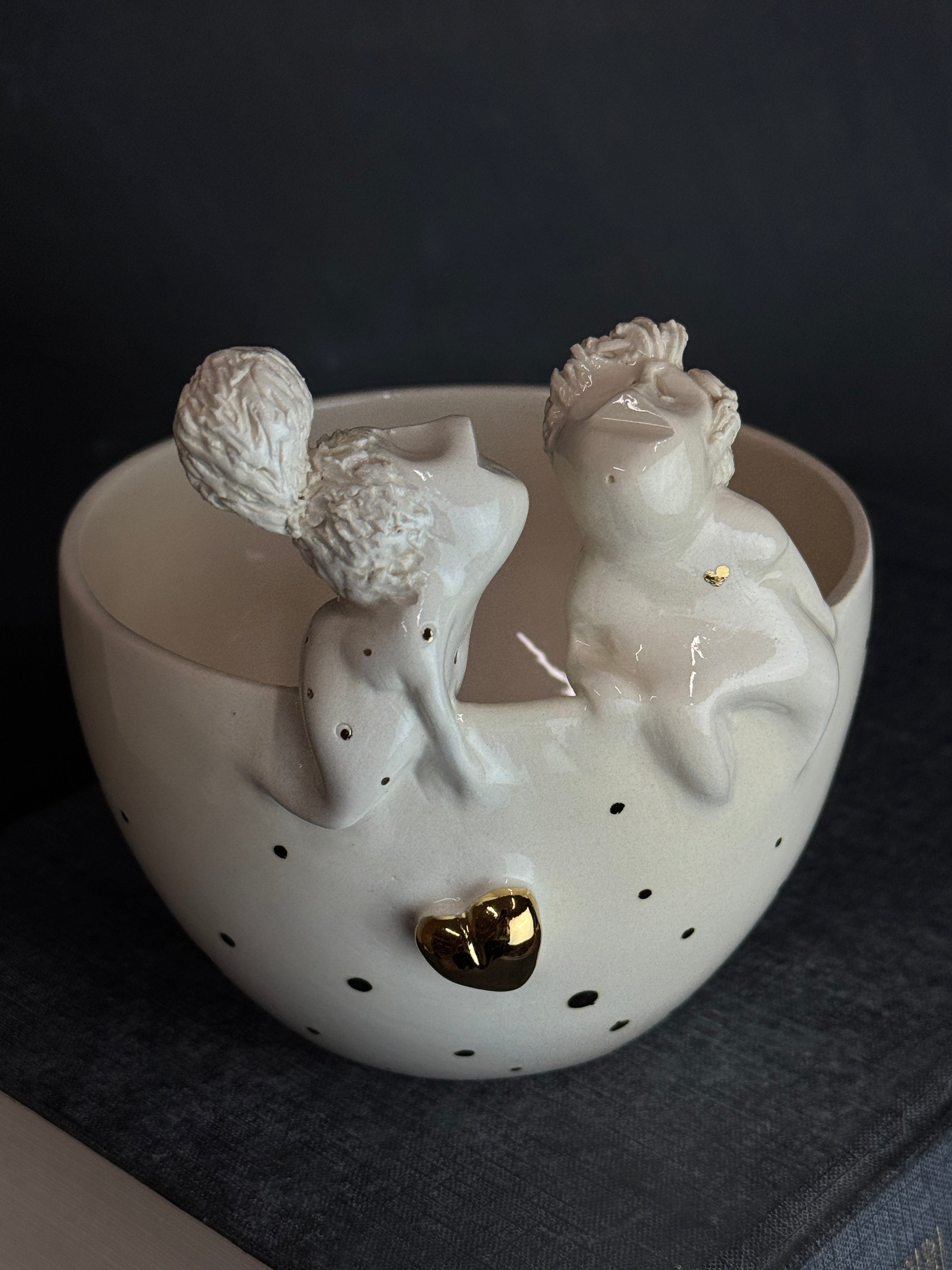 Rankų darbo balto molio dubenėlis su žmogučiais ant krašto. Dengtas skaidria glazūra su juodais taškeliais.