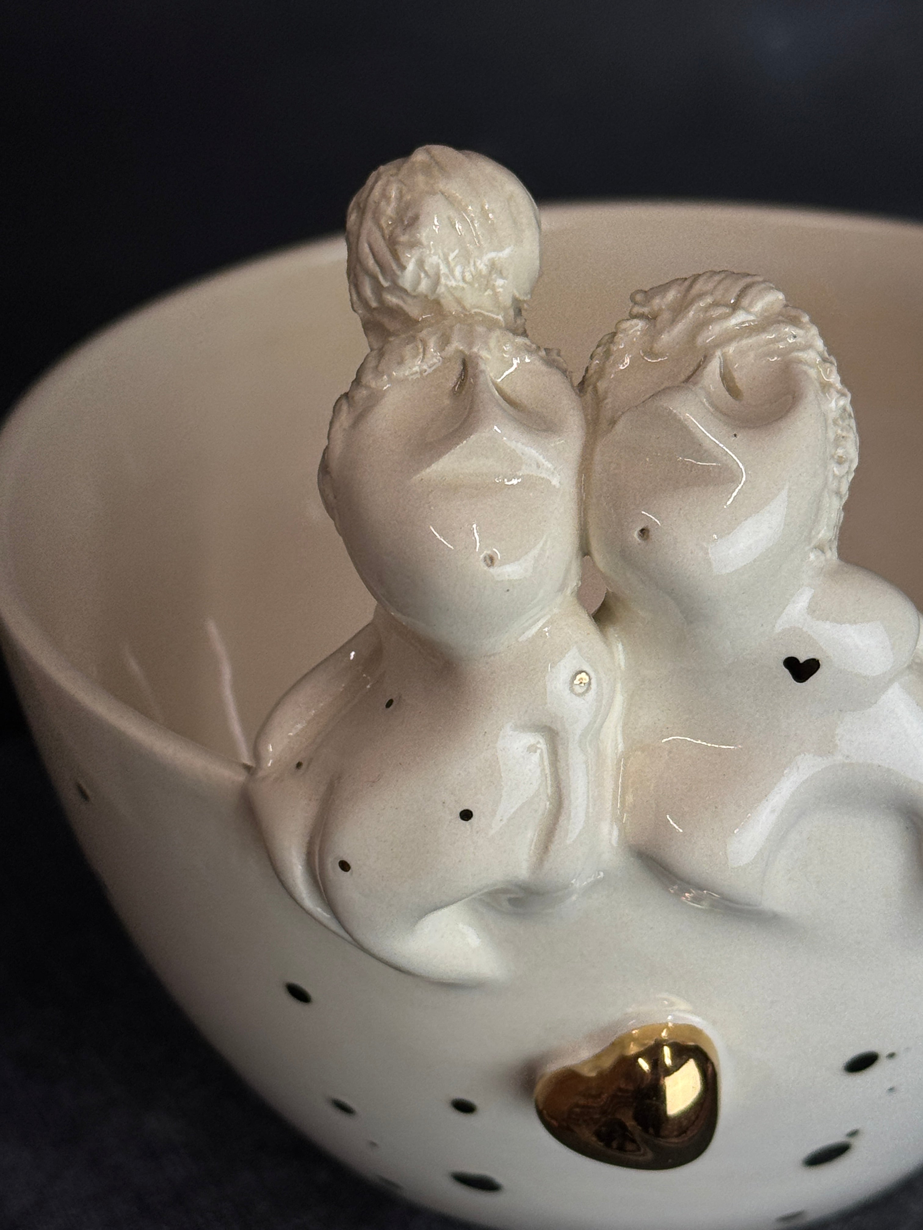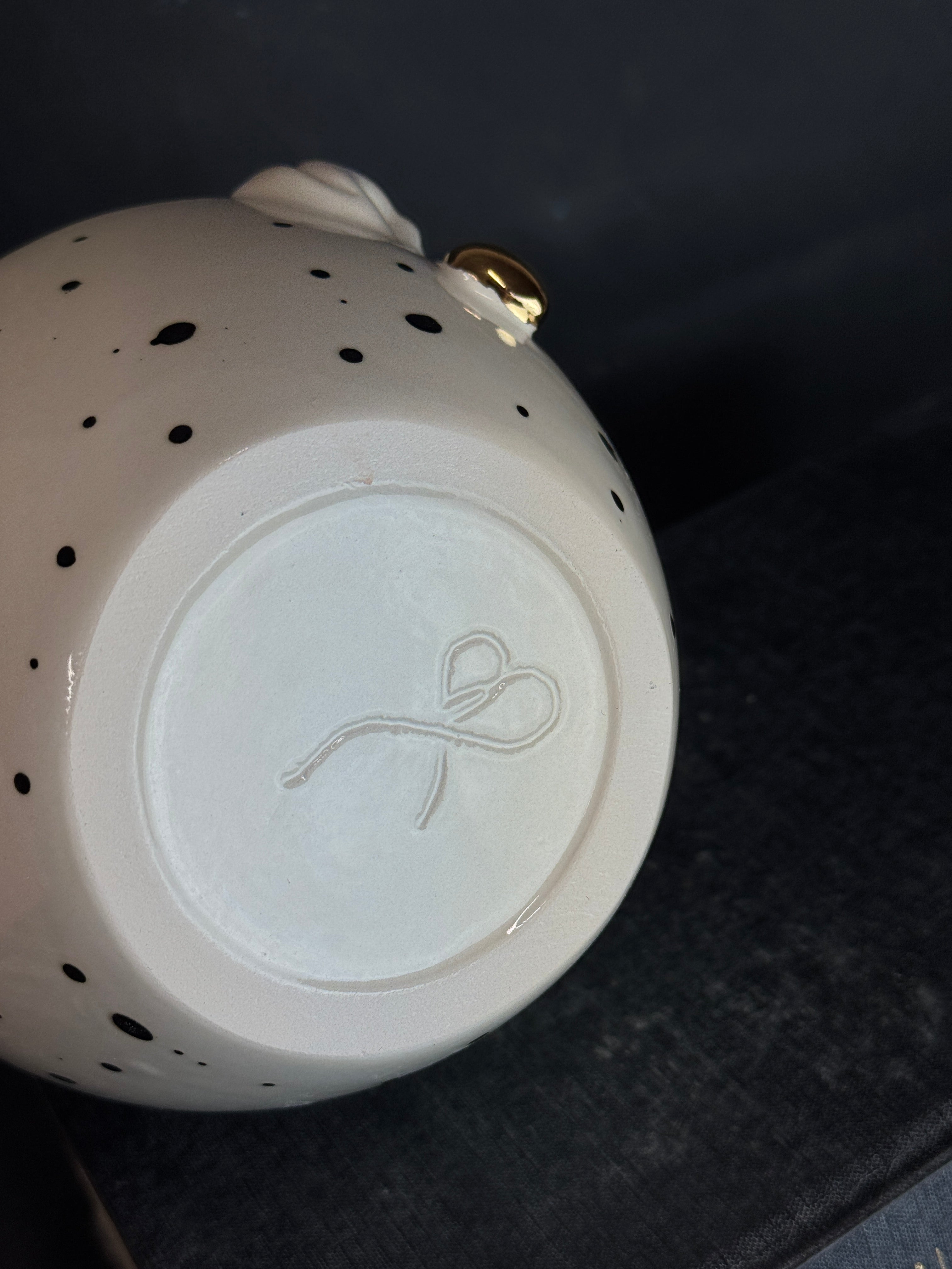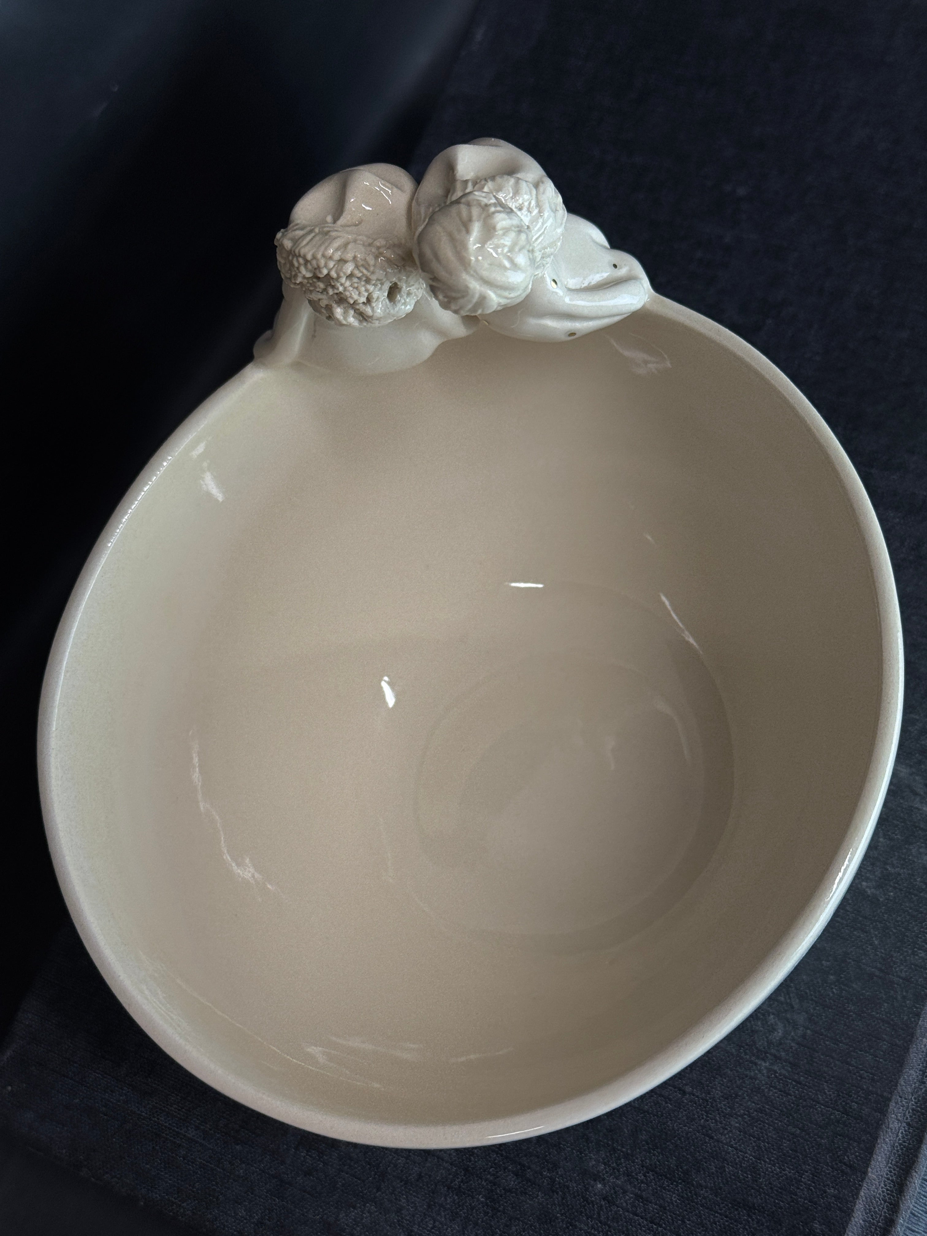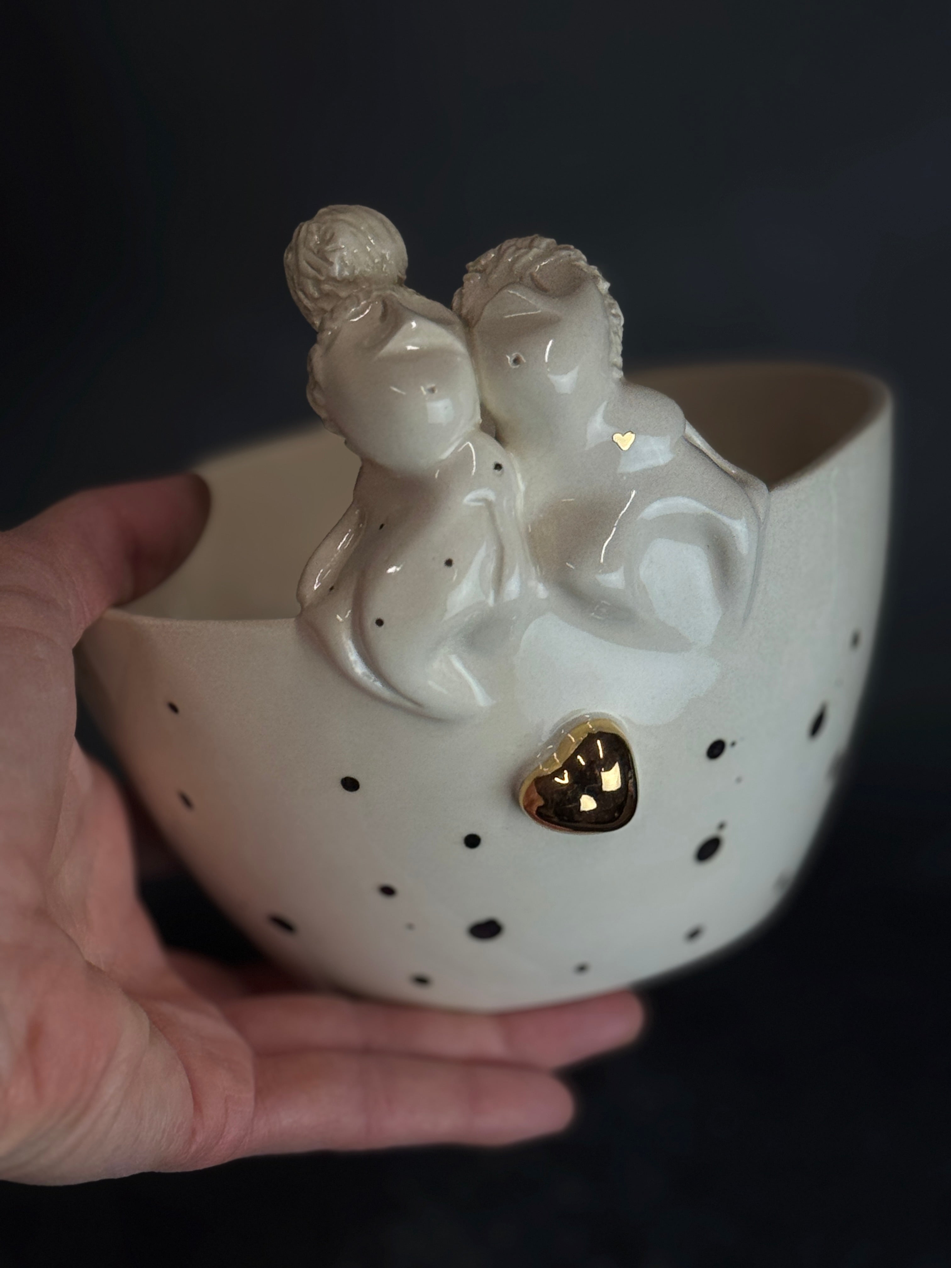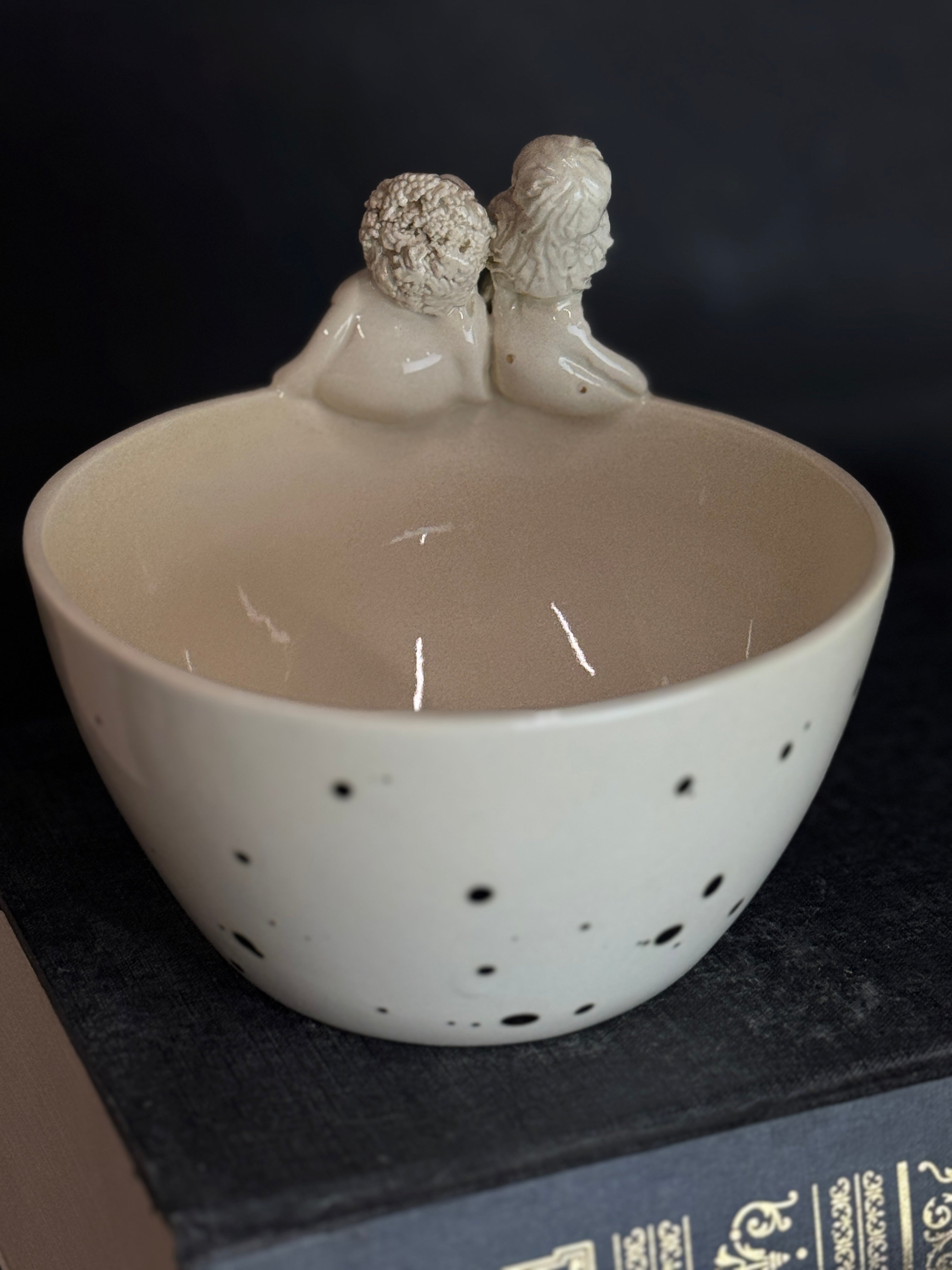 Rankų darbo balto molio dubenėlis su žmogučiais ant krašto. Dengtas skaidria glazūra su juodais taškais.