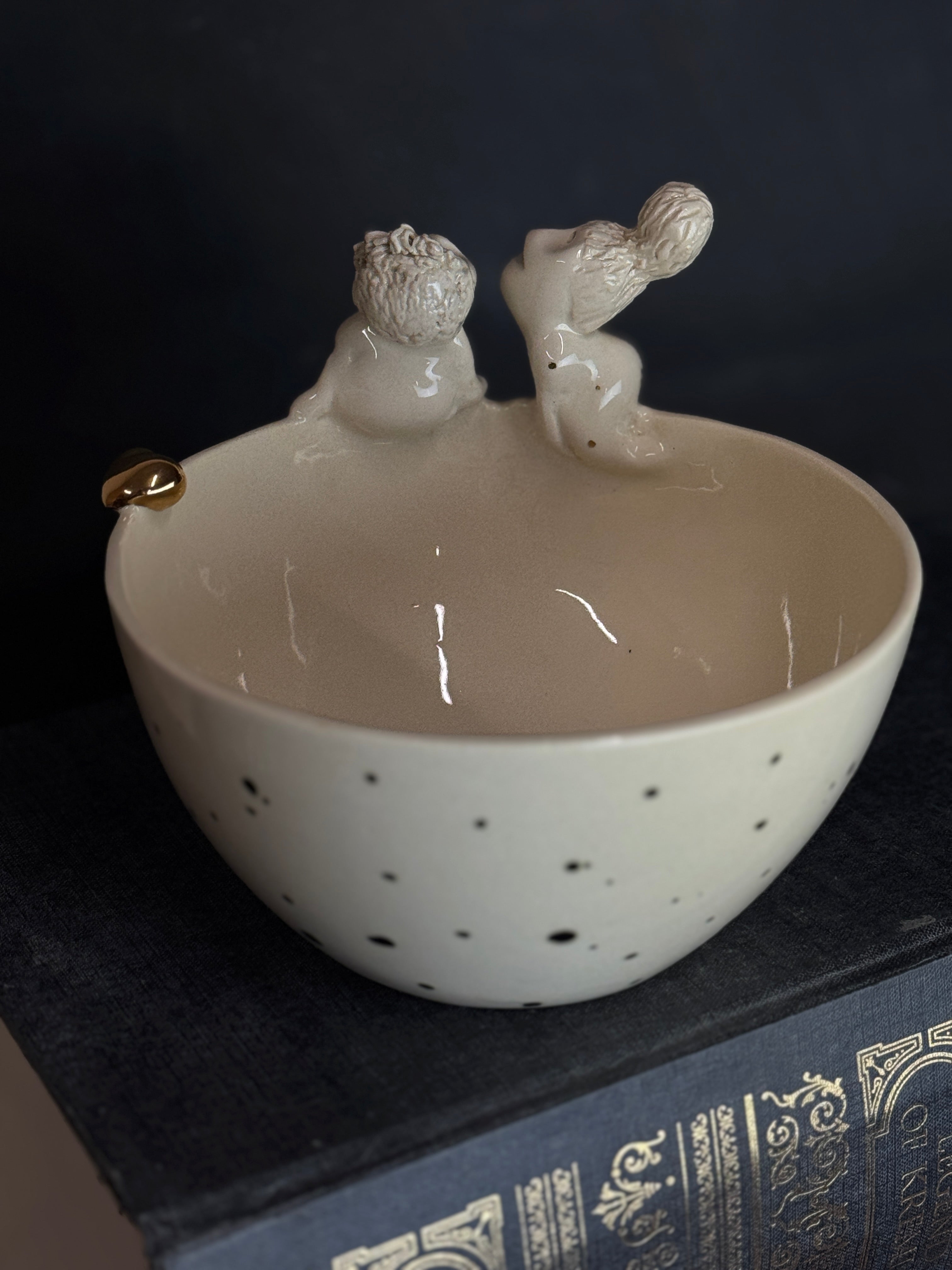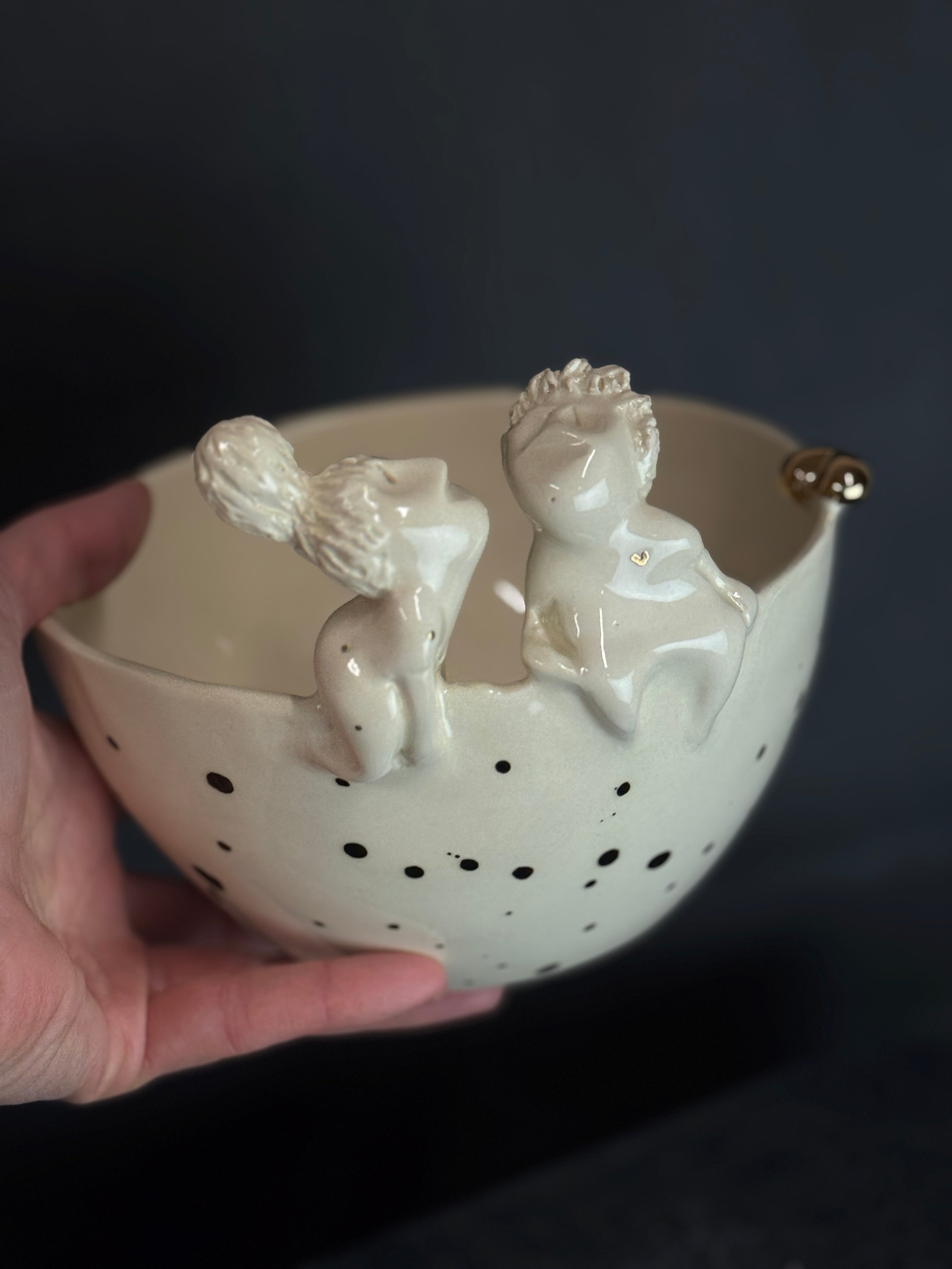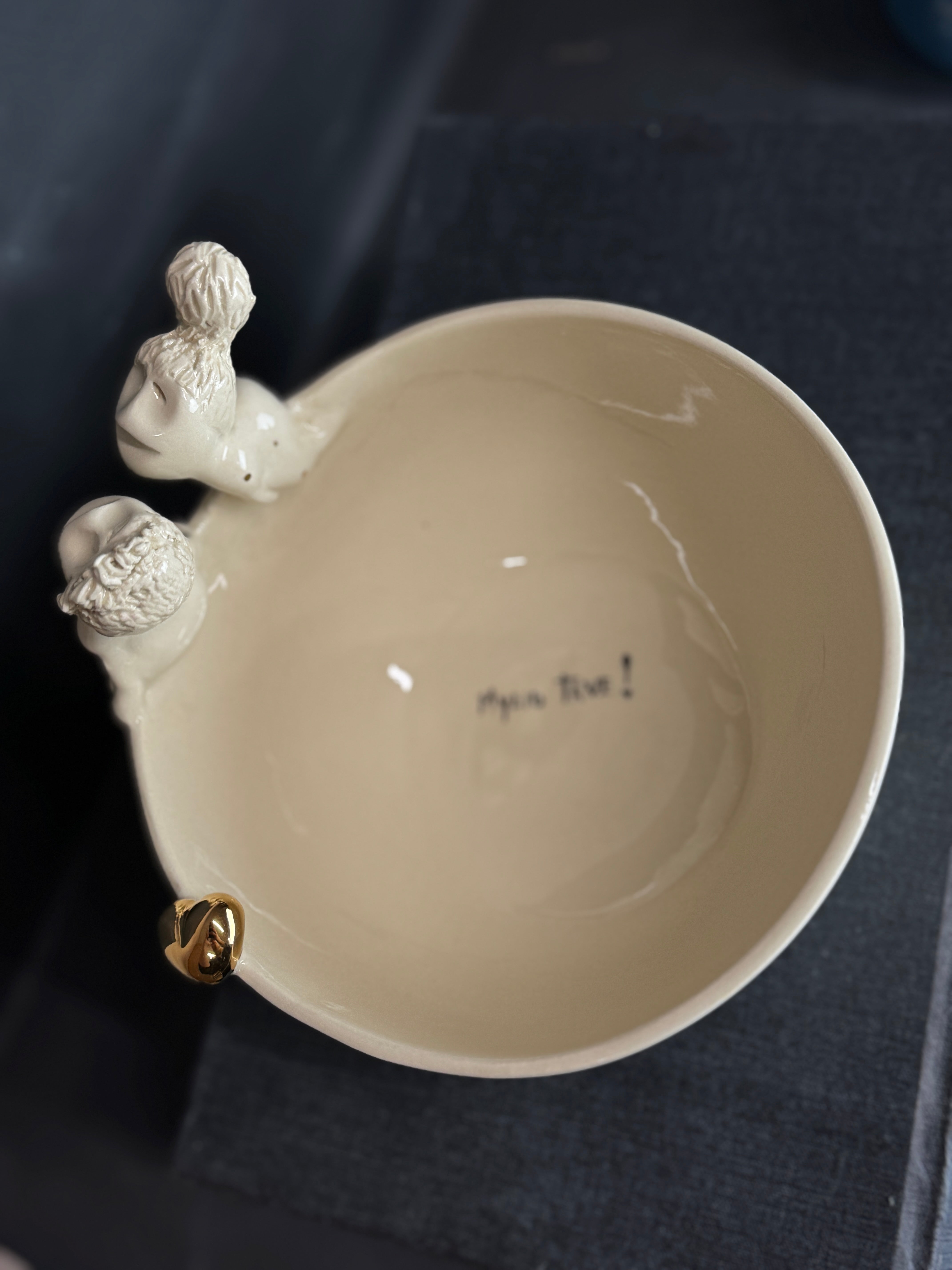 Rankų darbo balto molio dubenėlis su žmogučiais ant krašto. Dengtas skaidria glazūra su juodais taškais. Su užrašu “Myliu Tave!”