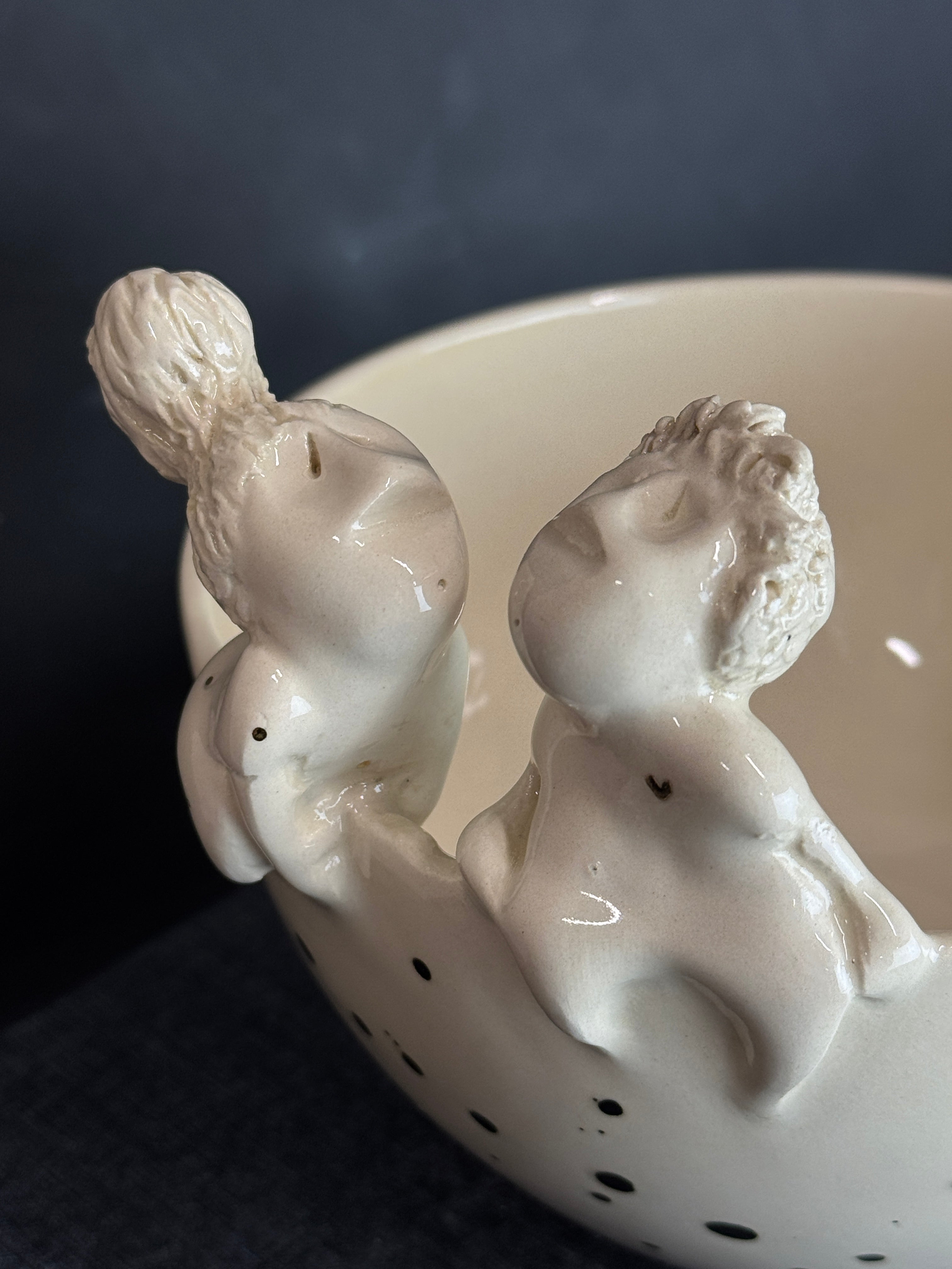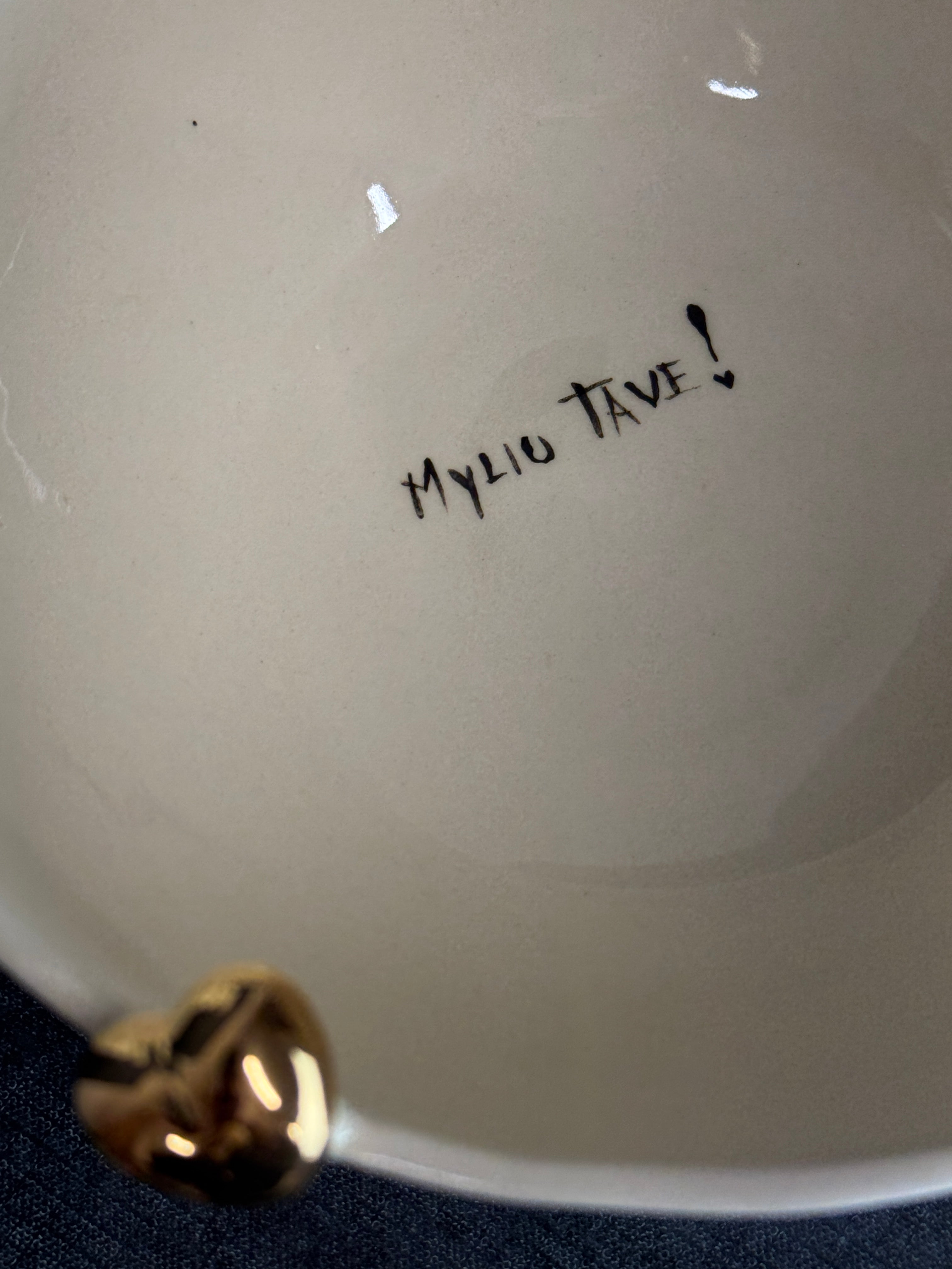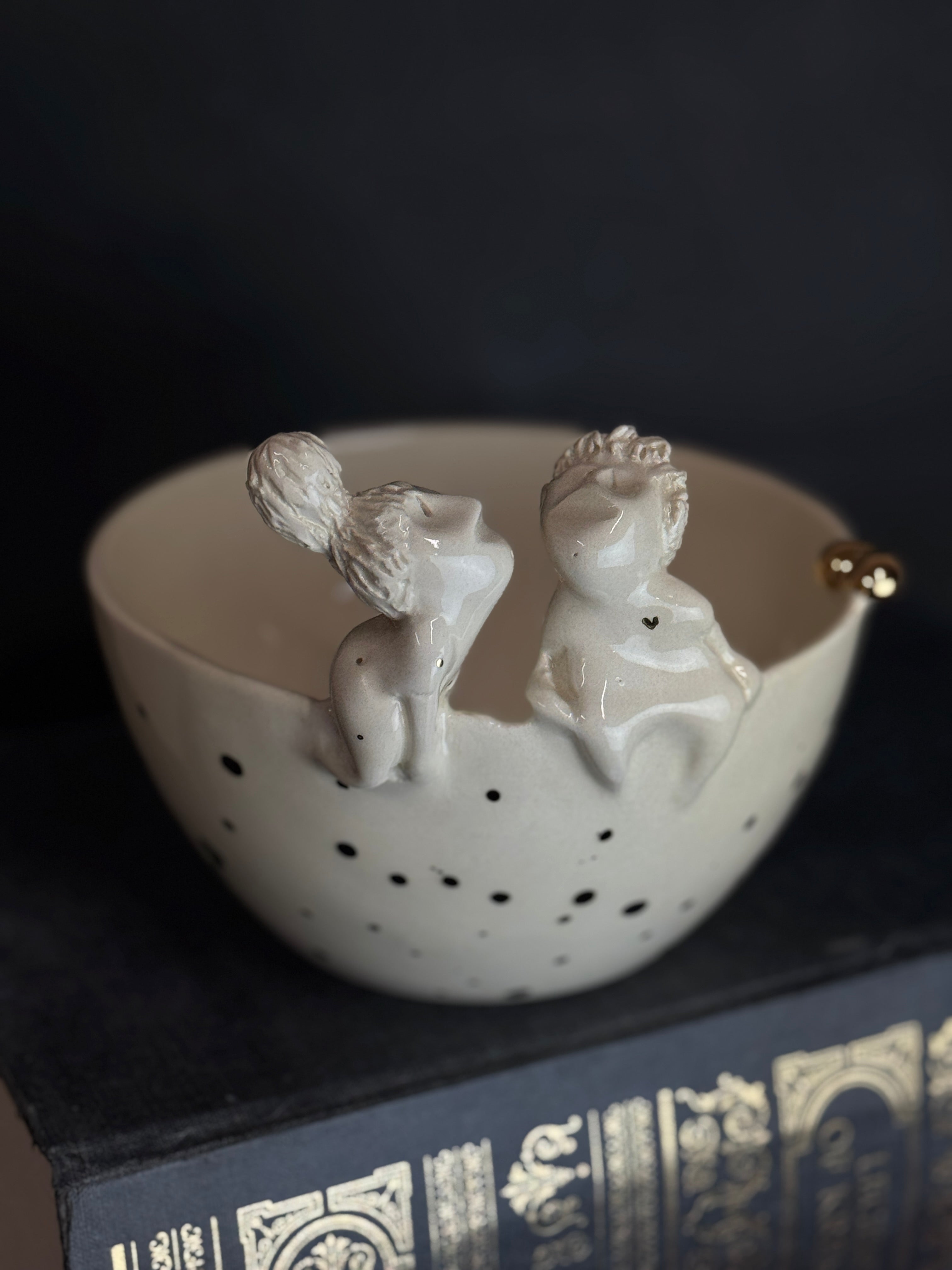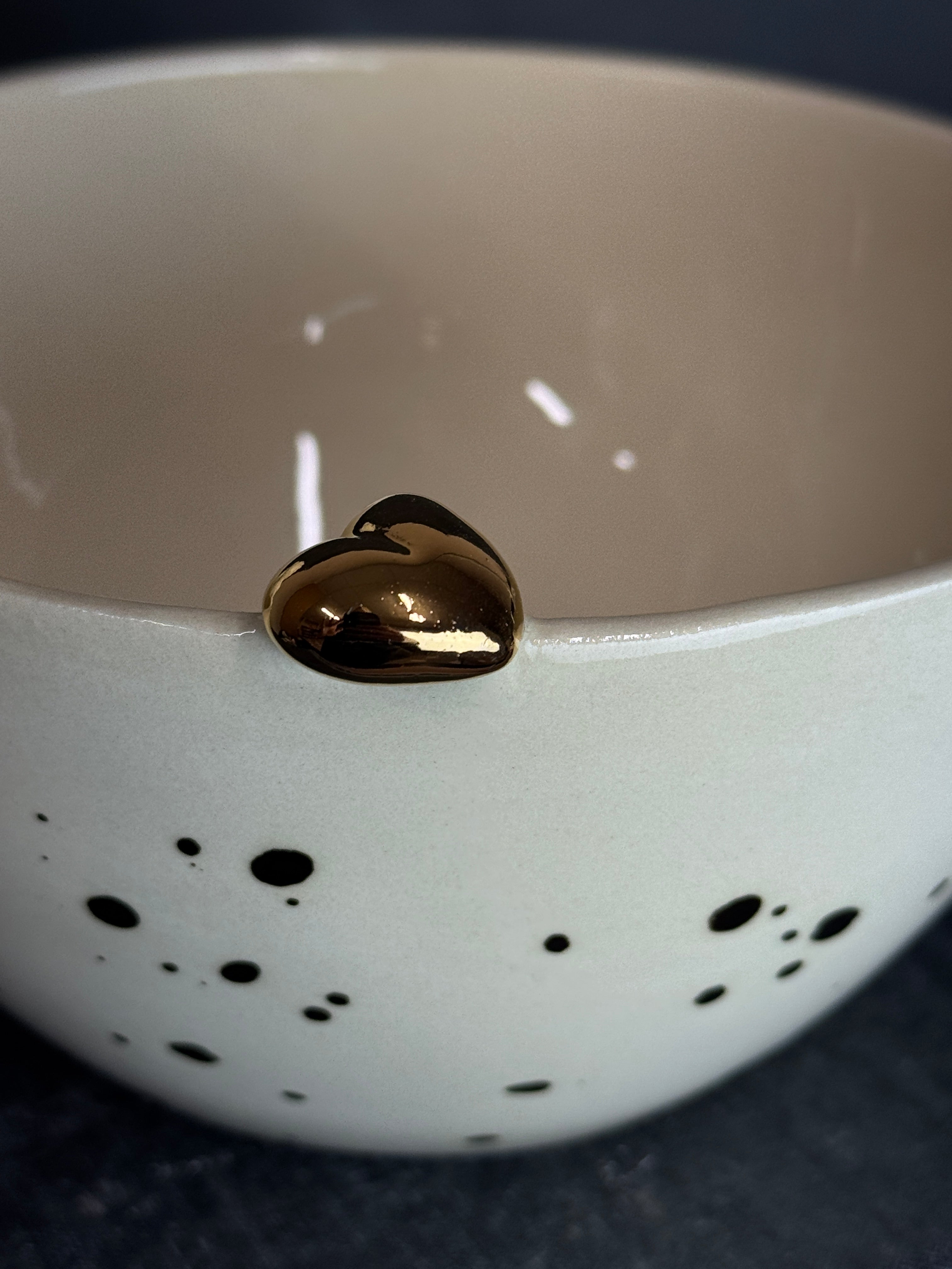 Rankų darbo balto molio dubenėlis su žmogučiais ant krašto. Dengtas skaidria glazūra su juodais taškais. Su užrašu “Myliu Tave!”