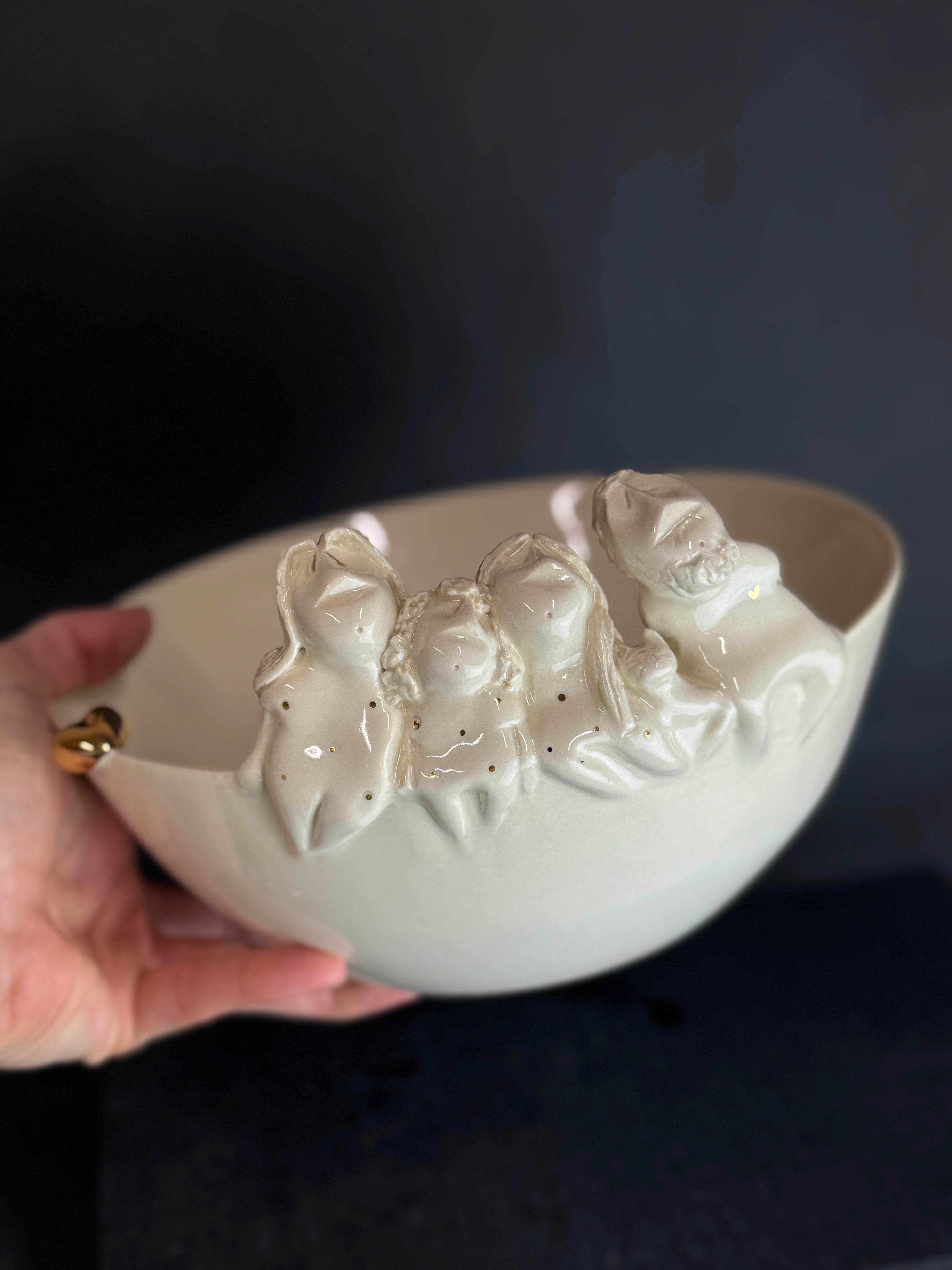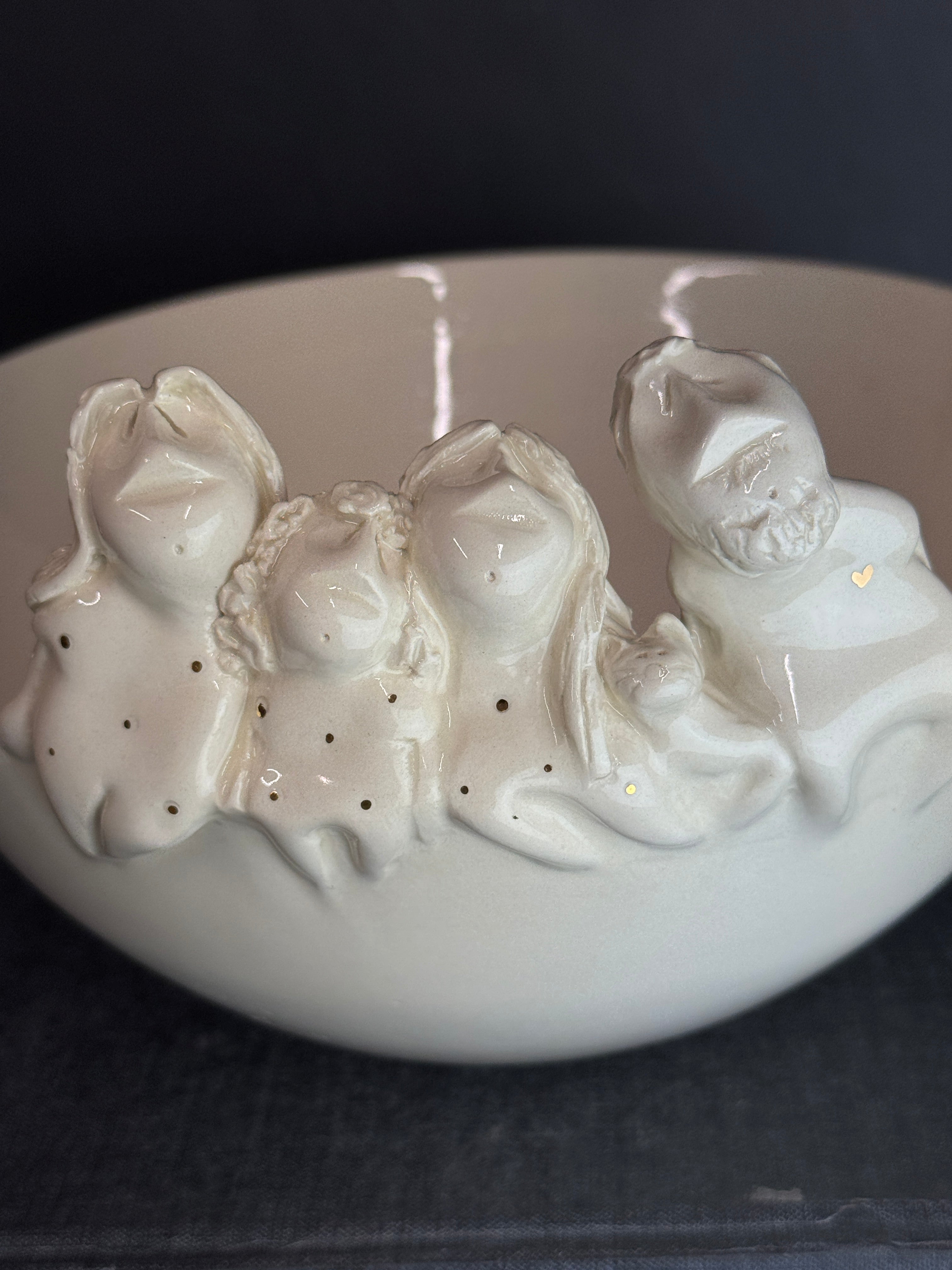 Balto molio dubenėlis, su šeimos nariais ant krašto (mama, barzdotas tėtis, dvi dukrytės ir kačiukas).