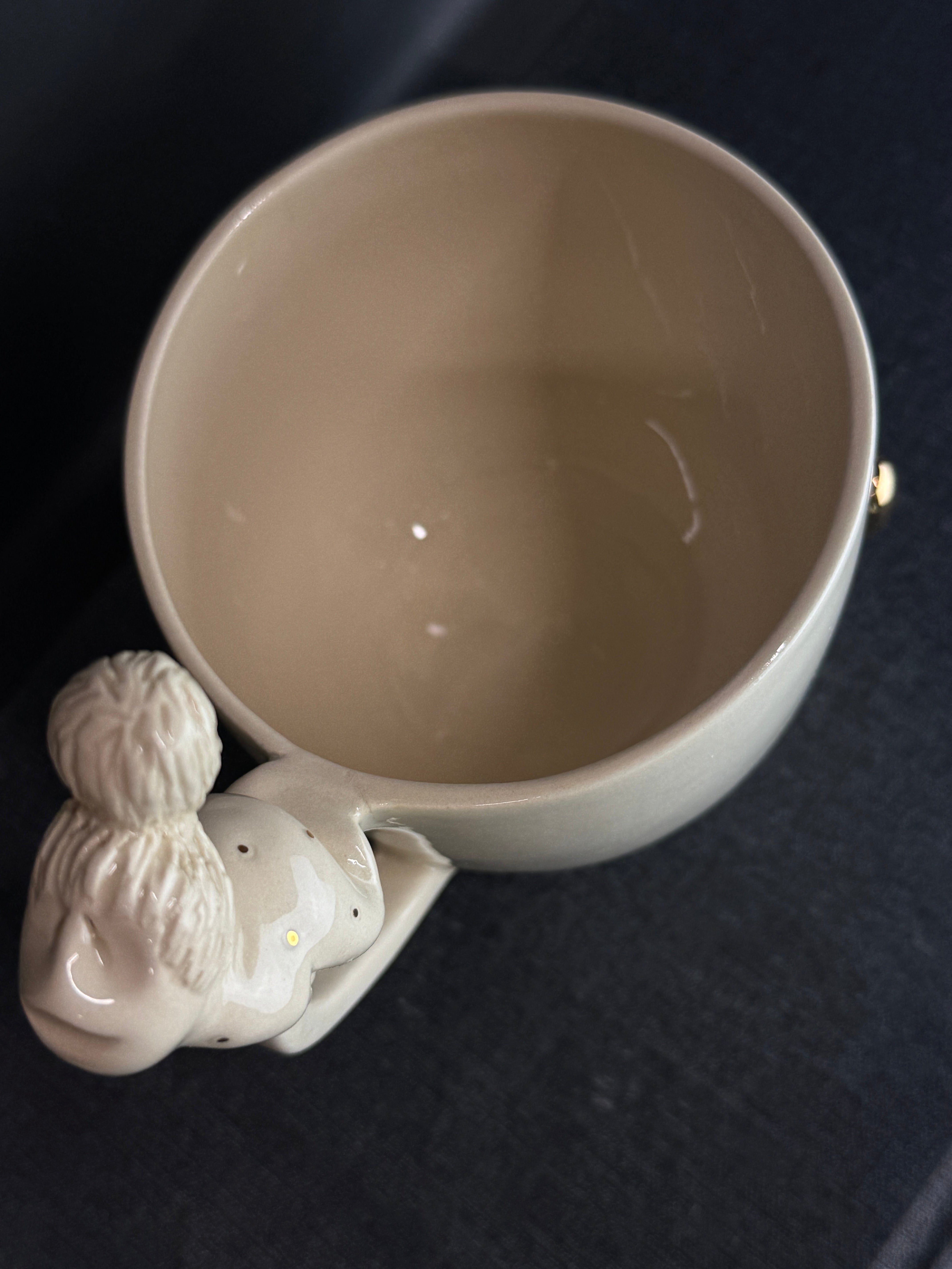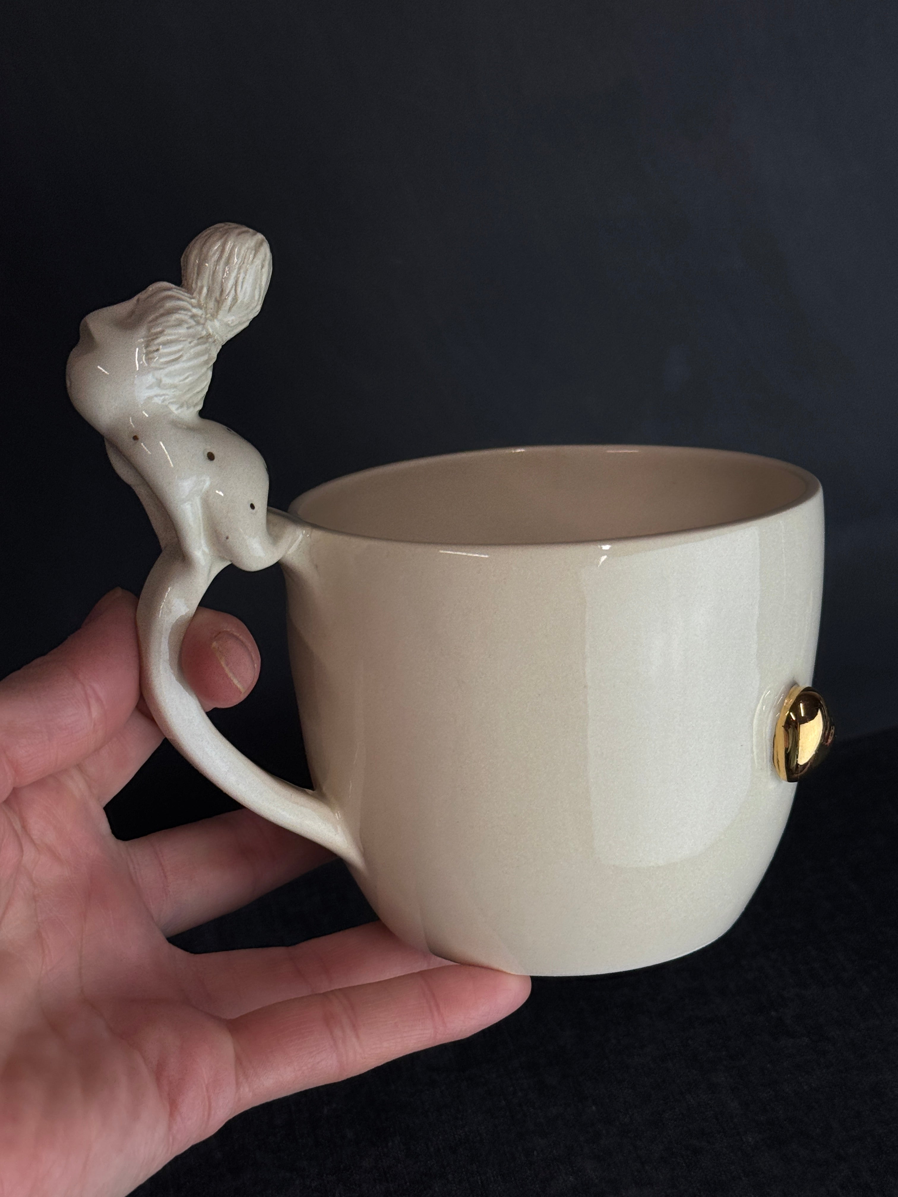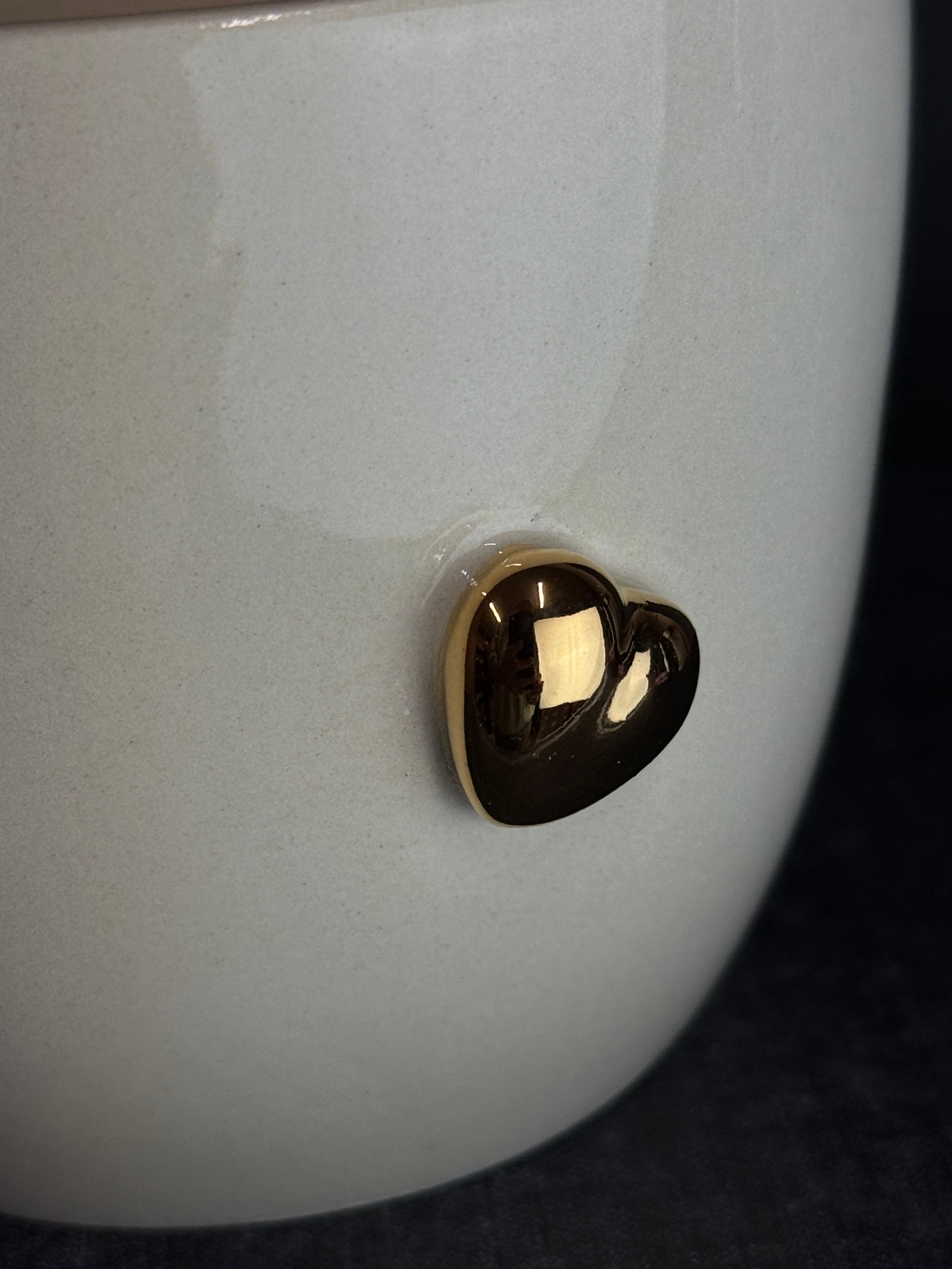 Balto molio puodelis su skulptūrėle ant ąselės ir auksine širdute. Dengtas skaidria glazūra. Dekoruotas 12% aukso tirpalu.