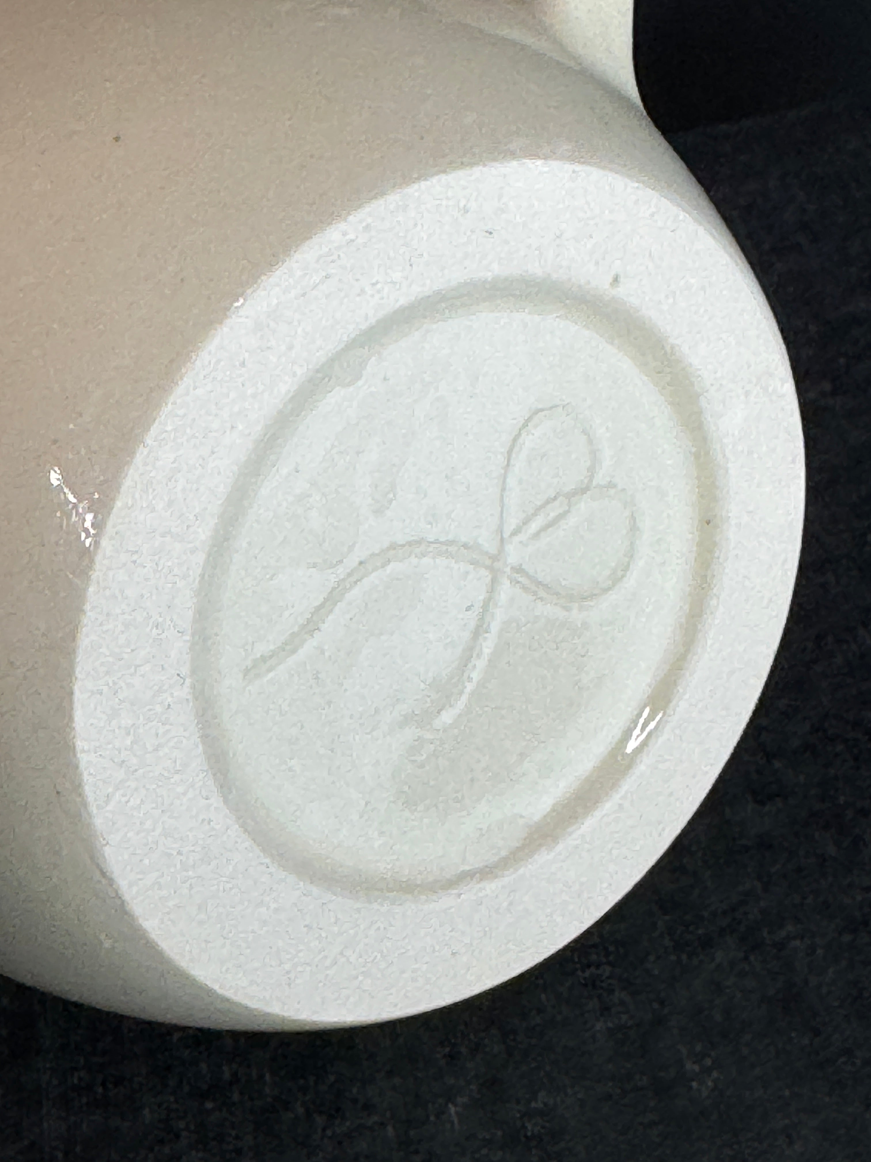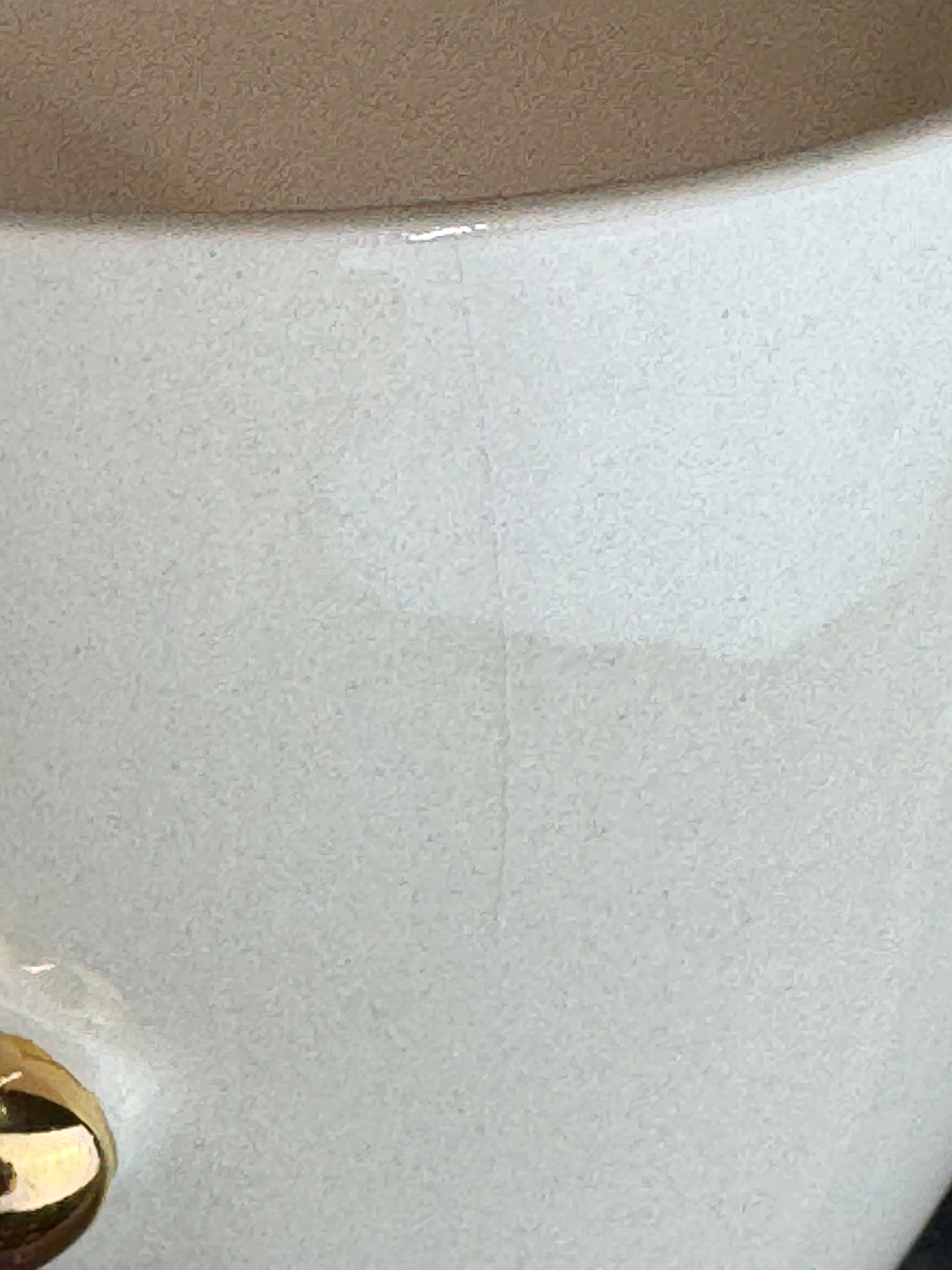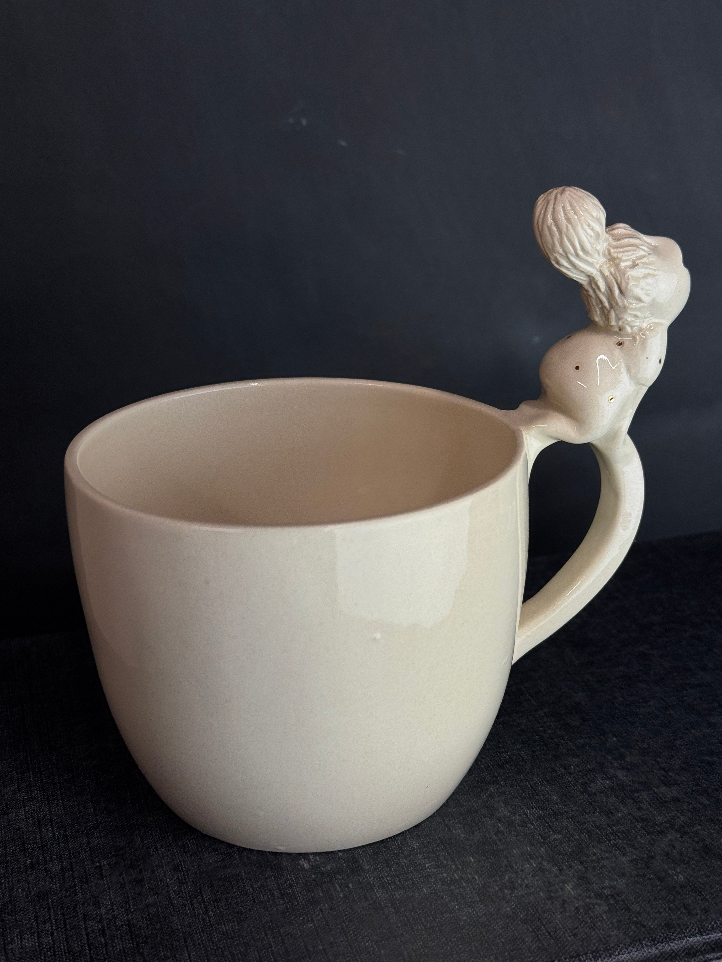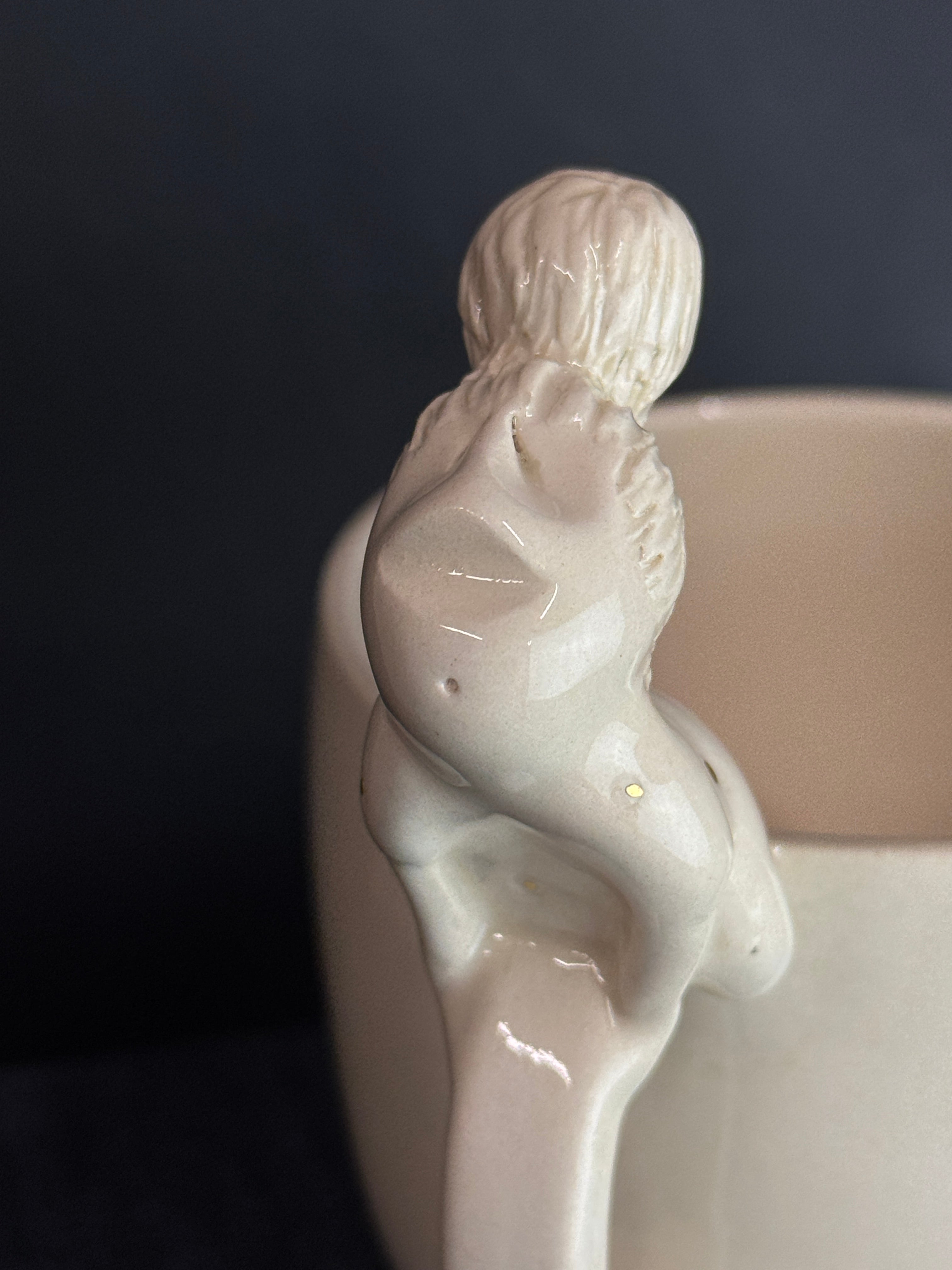 Balto molio puodelis su skulptūrėle ant ąselės ir auksine širdute. Dengtas skaidria glazūra. Dekoruotas 12% aukso tirpalu.