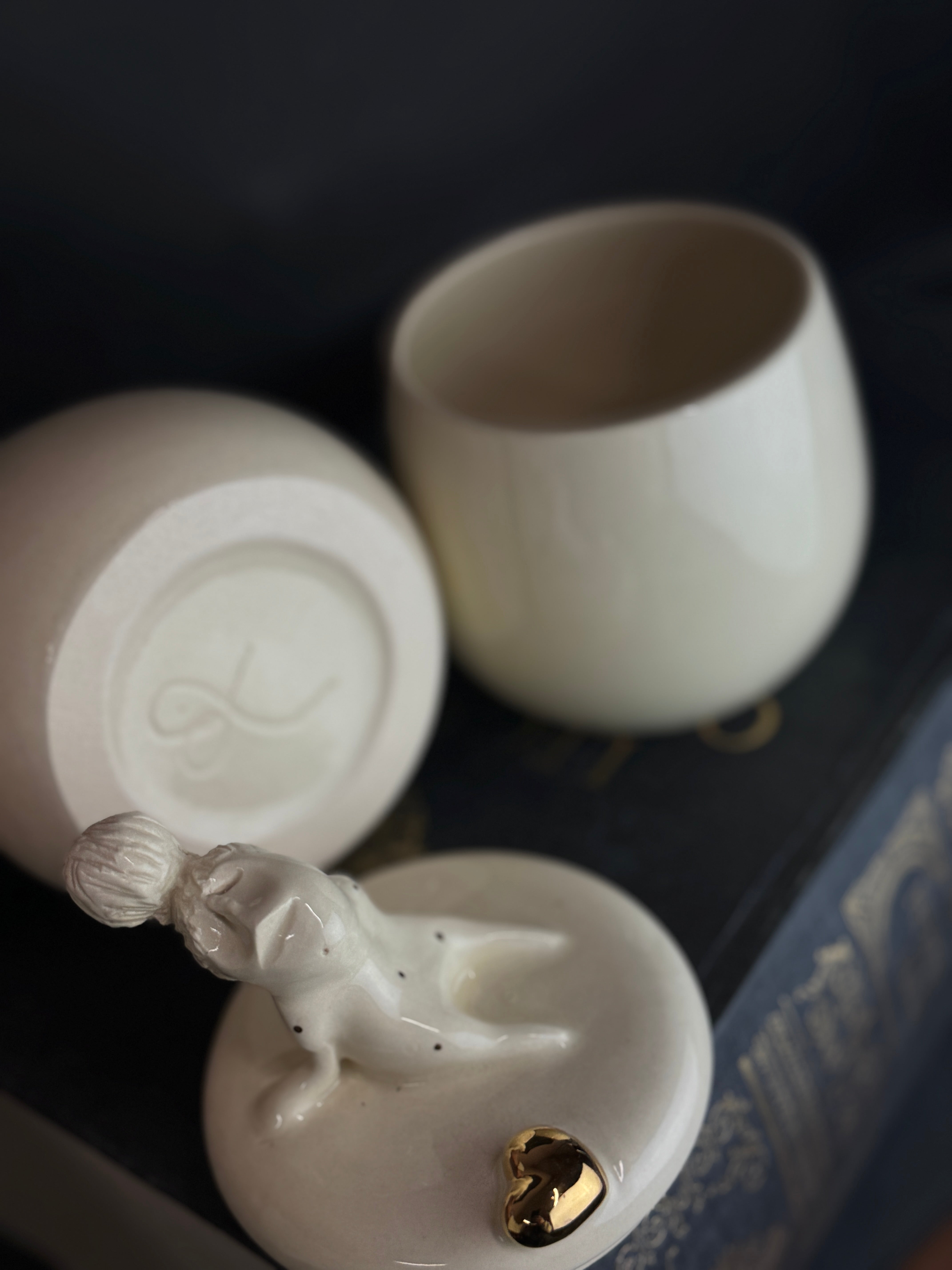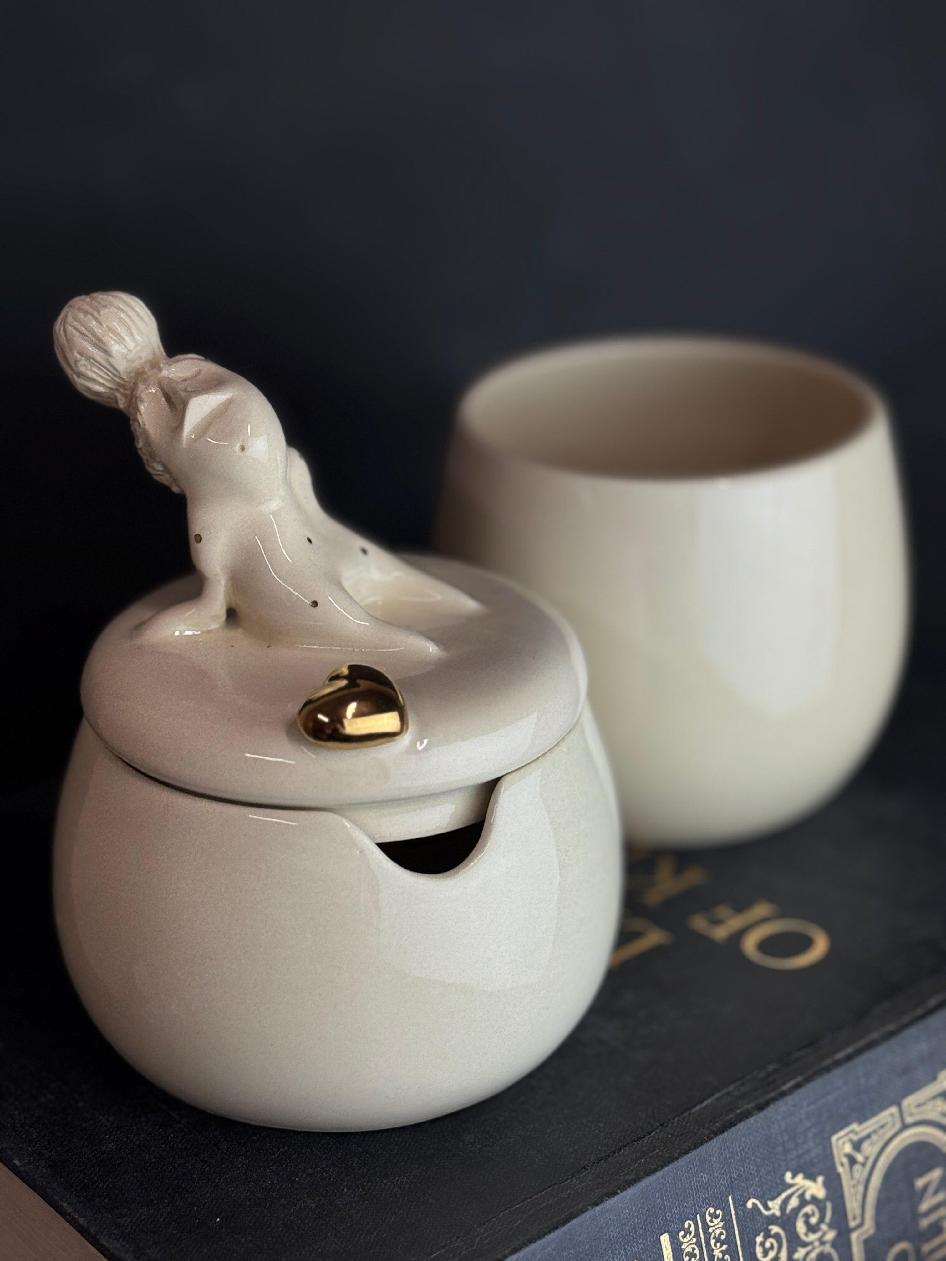 Indelių rinkinys su svajojančia Gražina. Balto molio cukrinė ir druskinė, dengti skaidria glazūra.