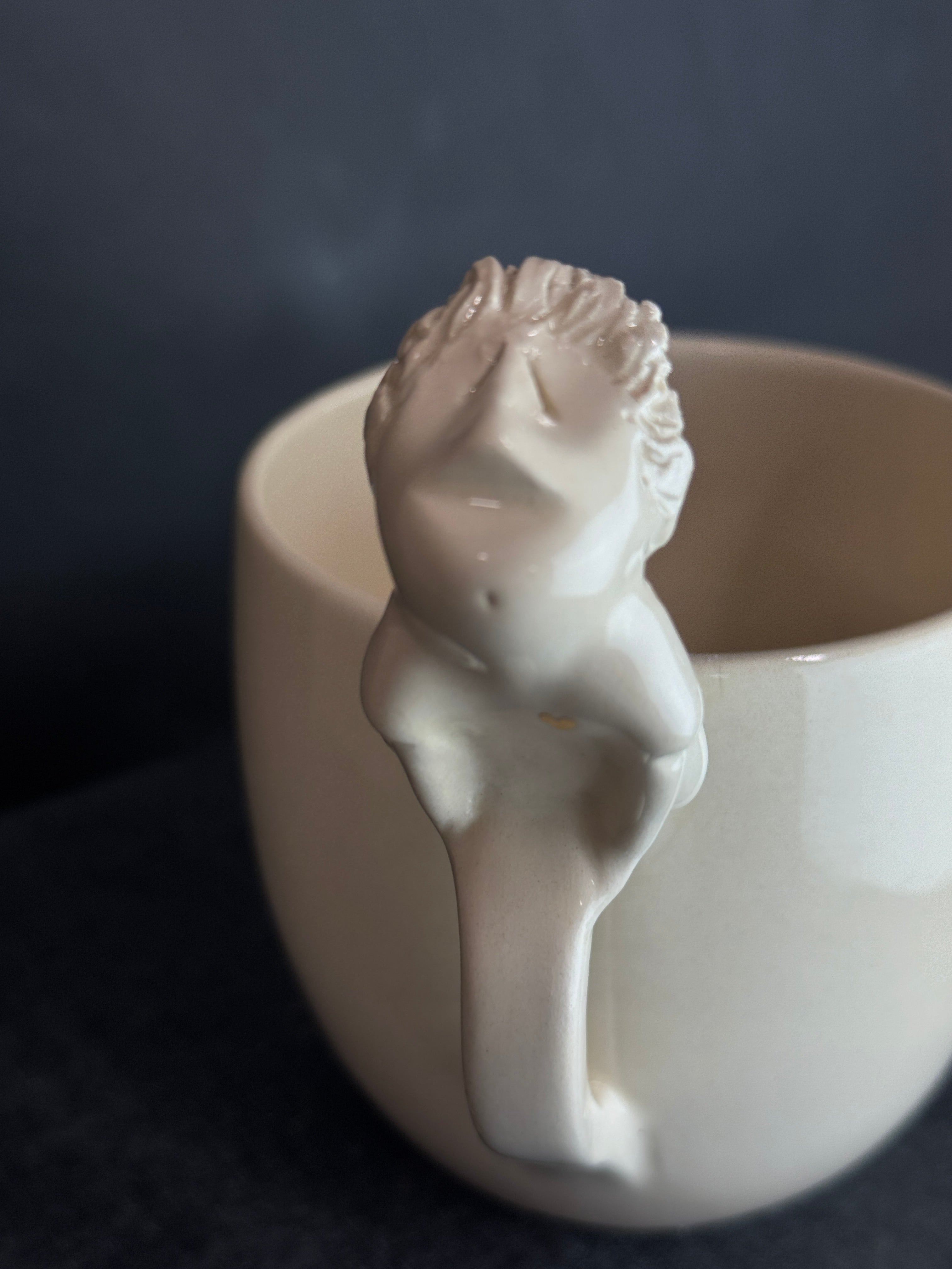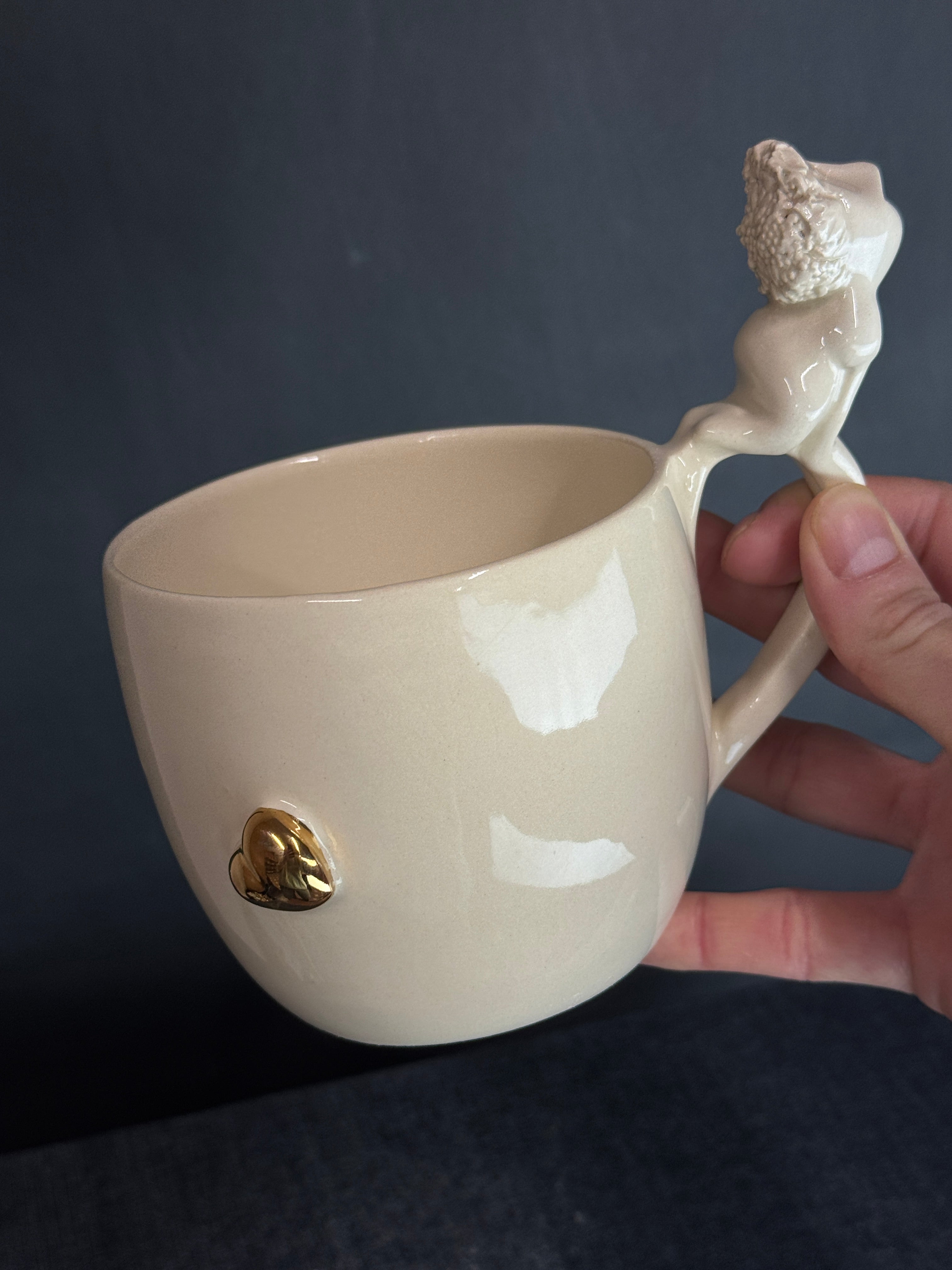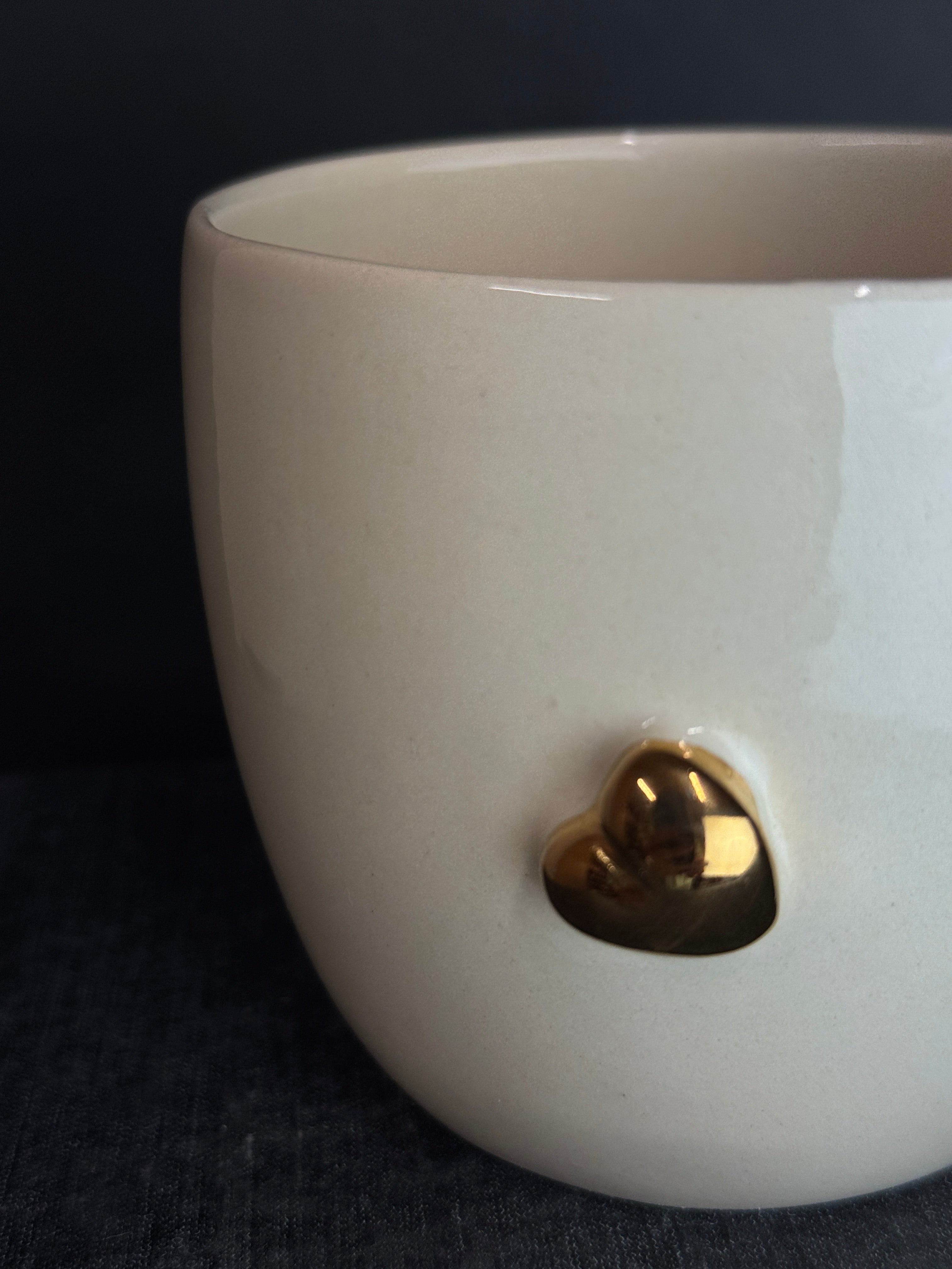 Balto molio puodelis, dengtas skaidria glazūra. Dekoruotas 12% aukso tirpalu.