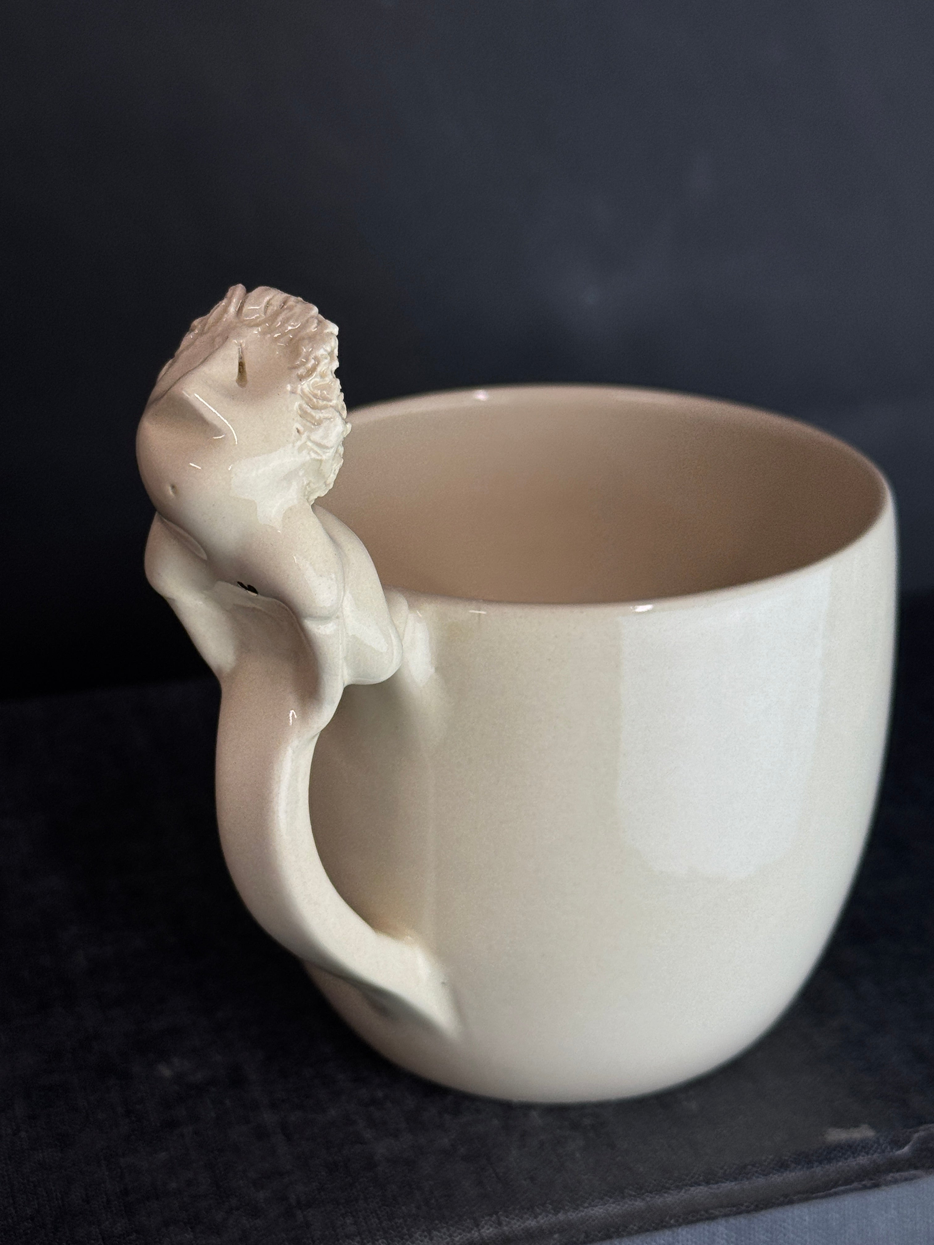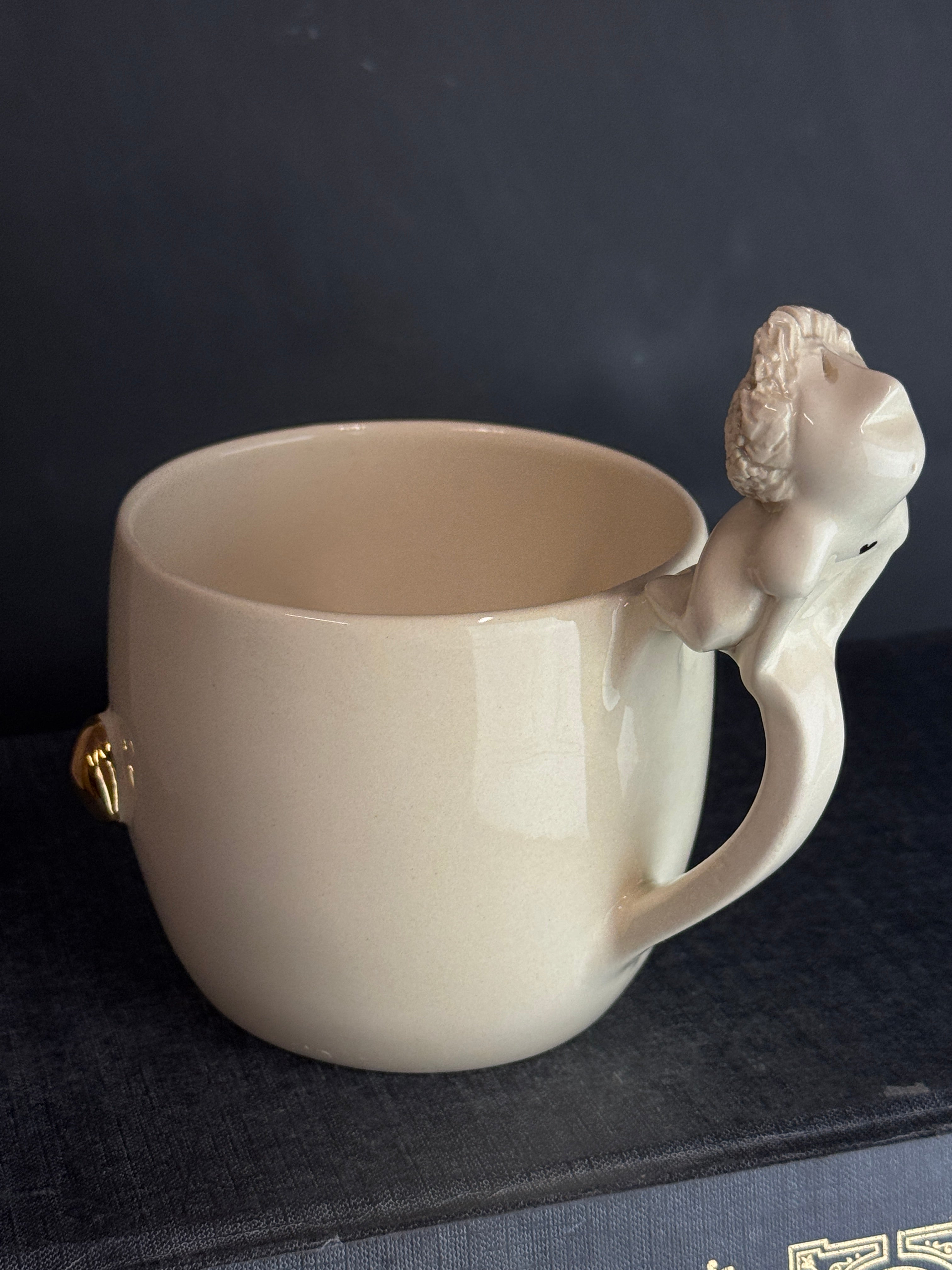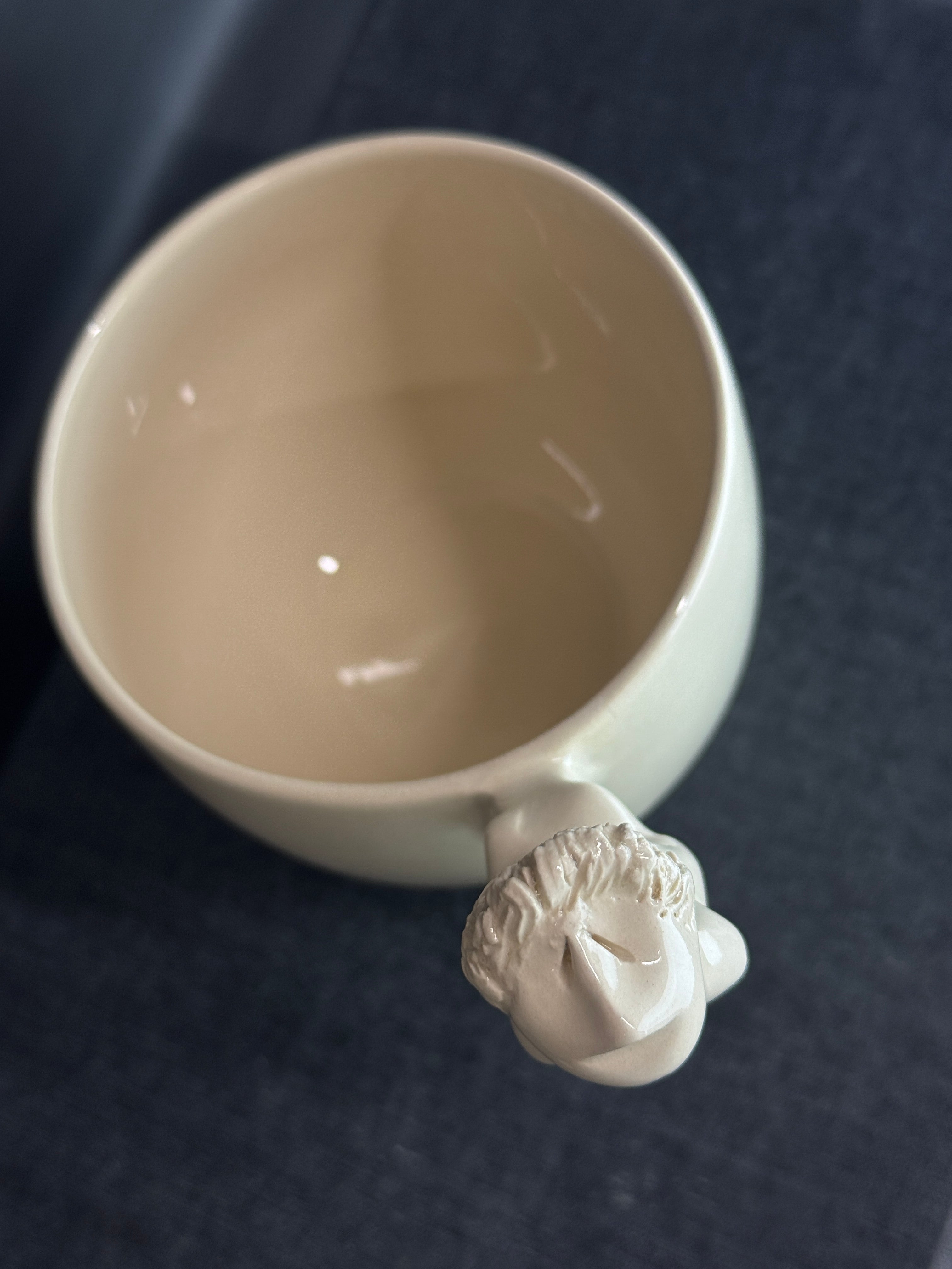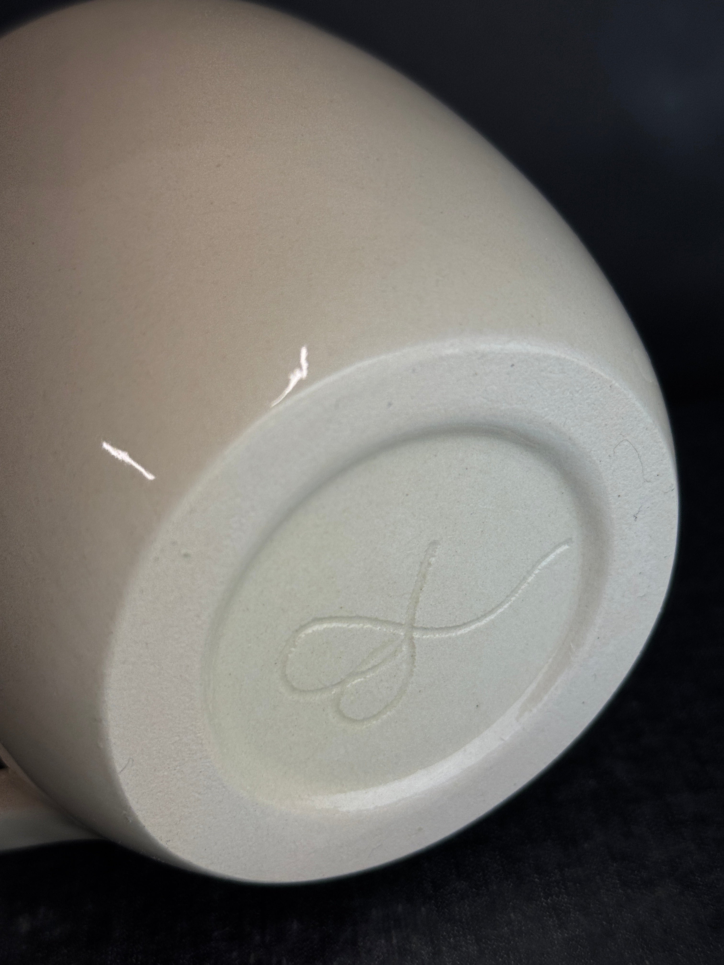 Balto molio puodelis, dengtas skaidria glazūra. Dekoruotas 12% aukso tirpalu.