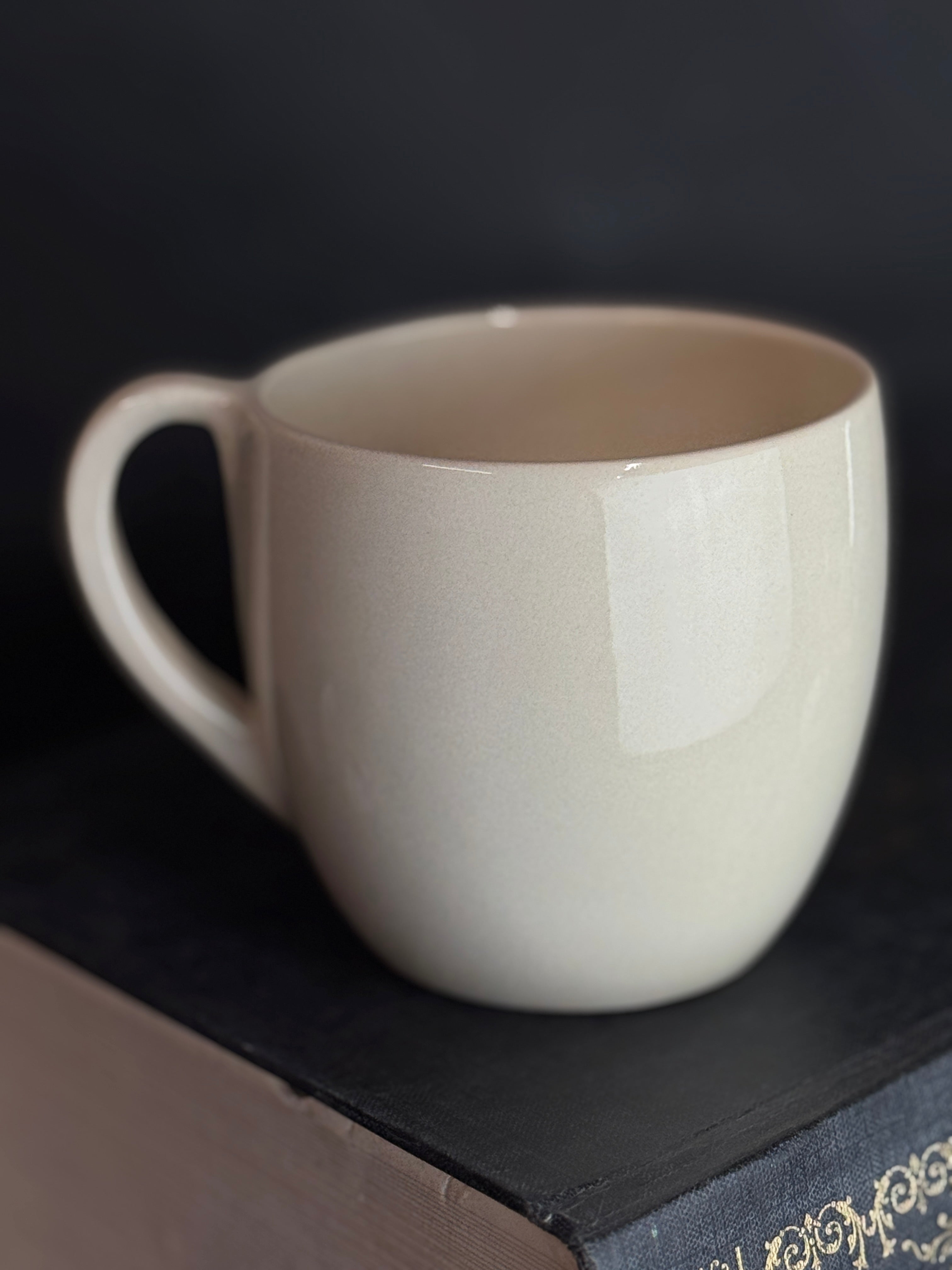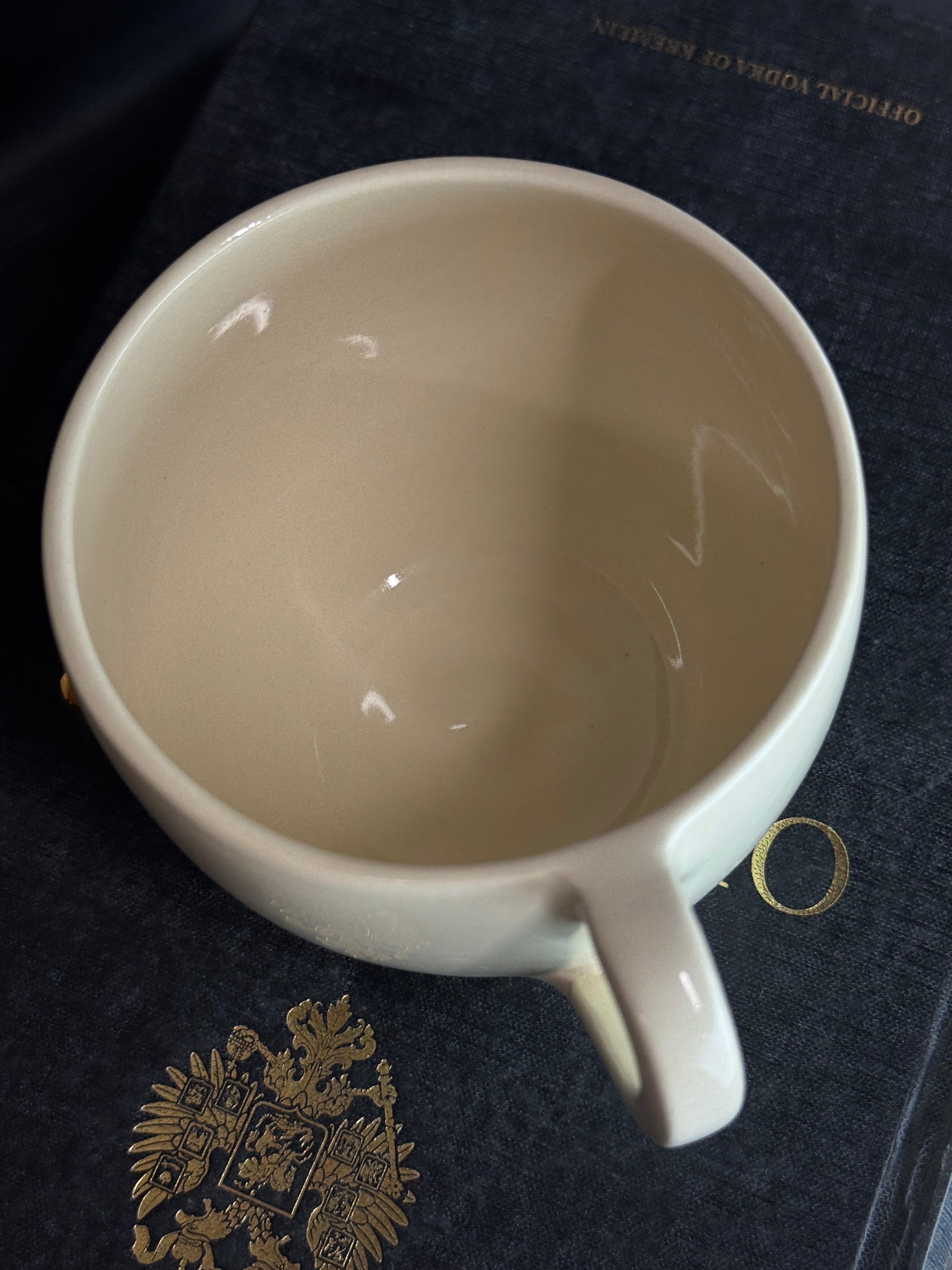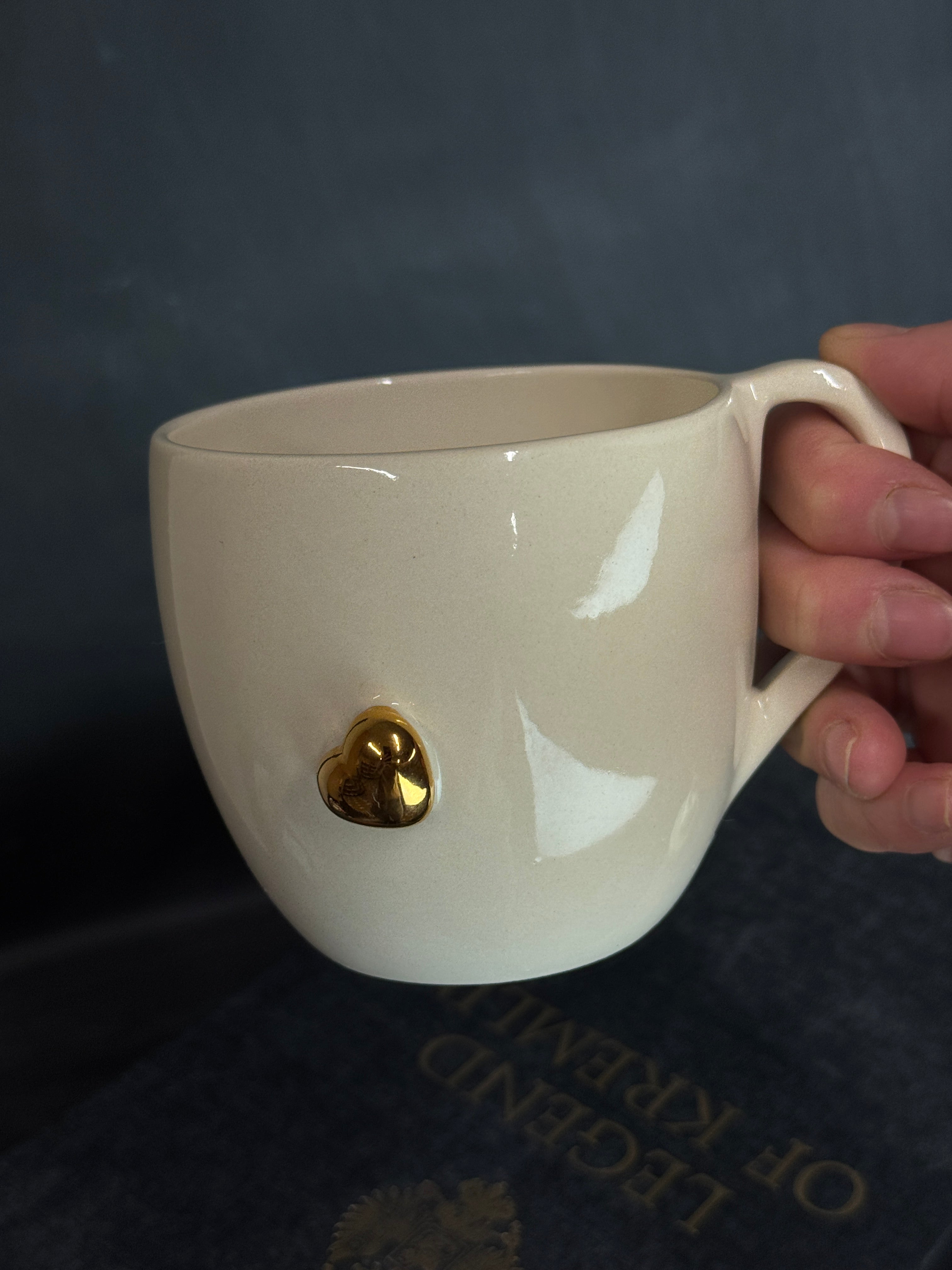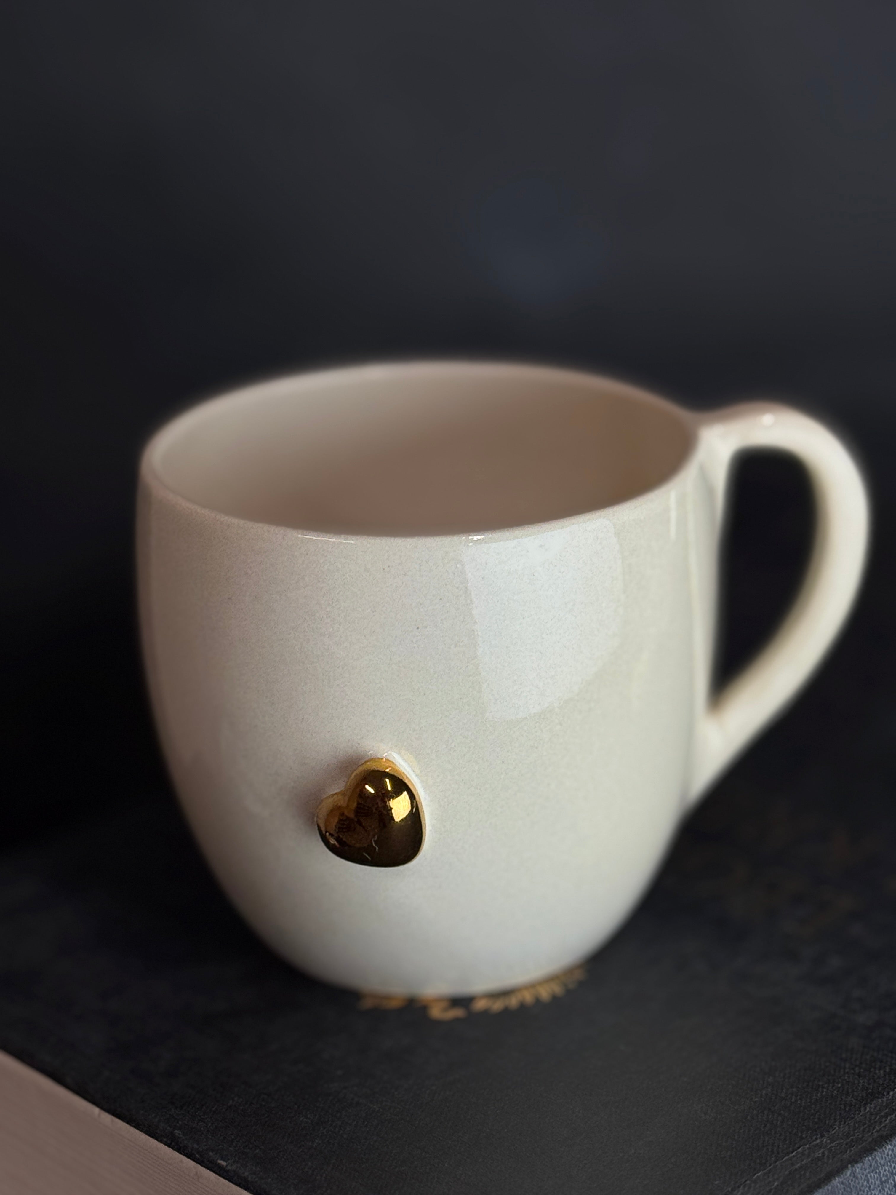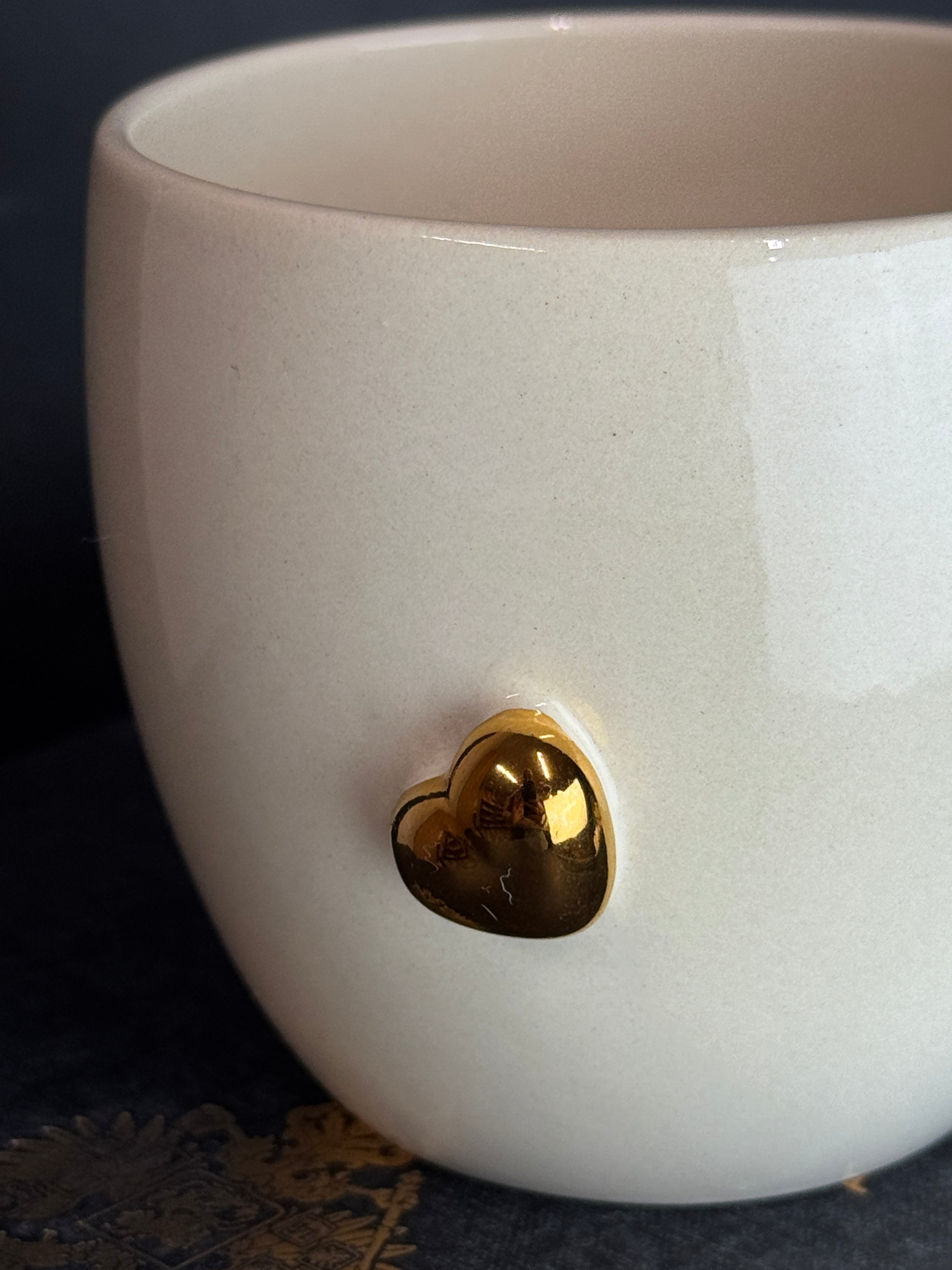 Rankų darbo balto molio elegantiškas arbatos puodelis su auksine širdele, dengtas skaidria glazūra.