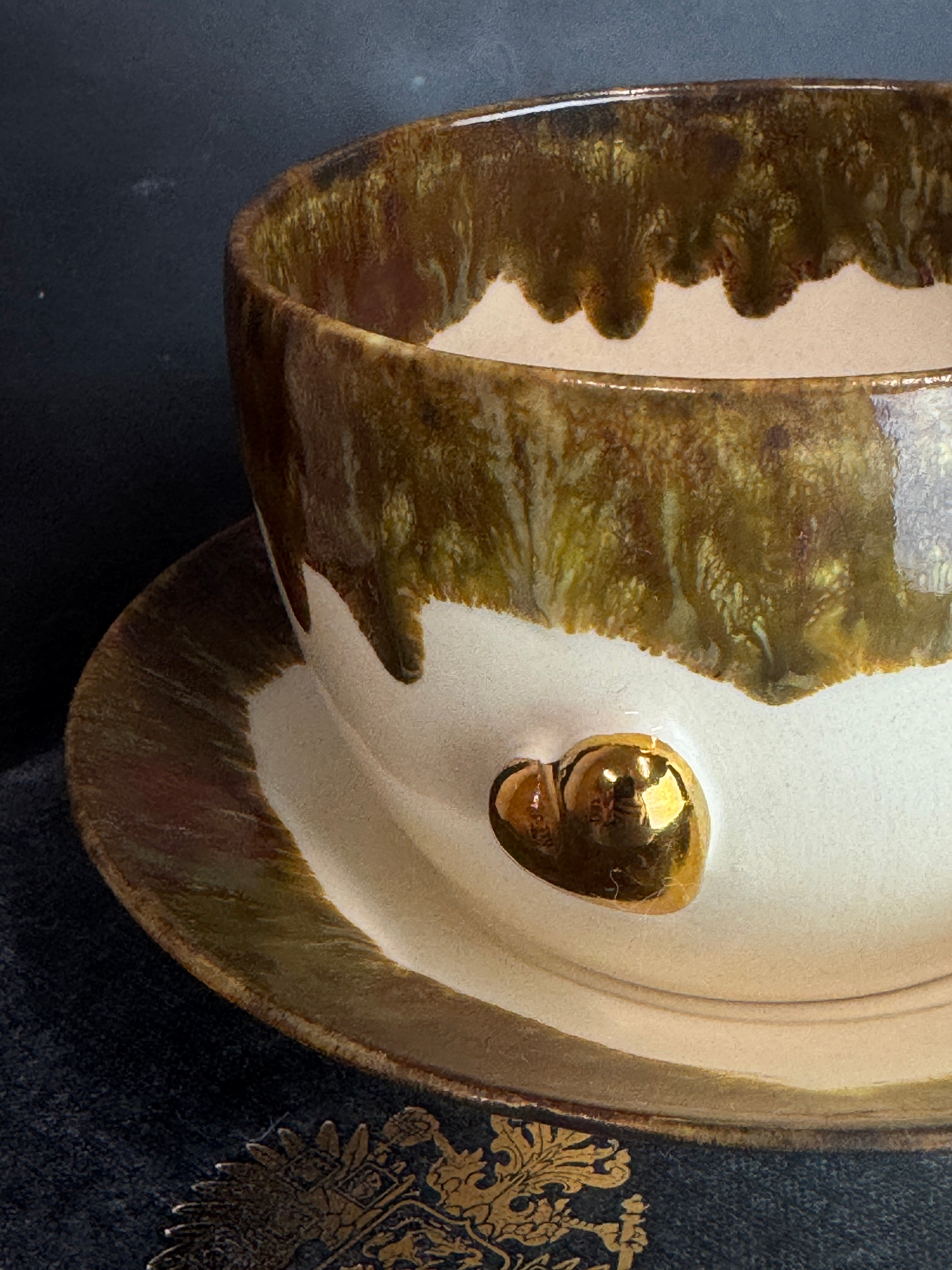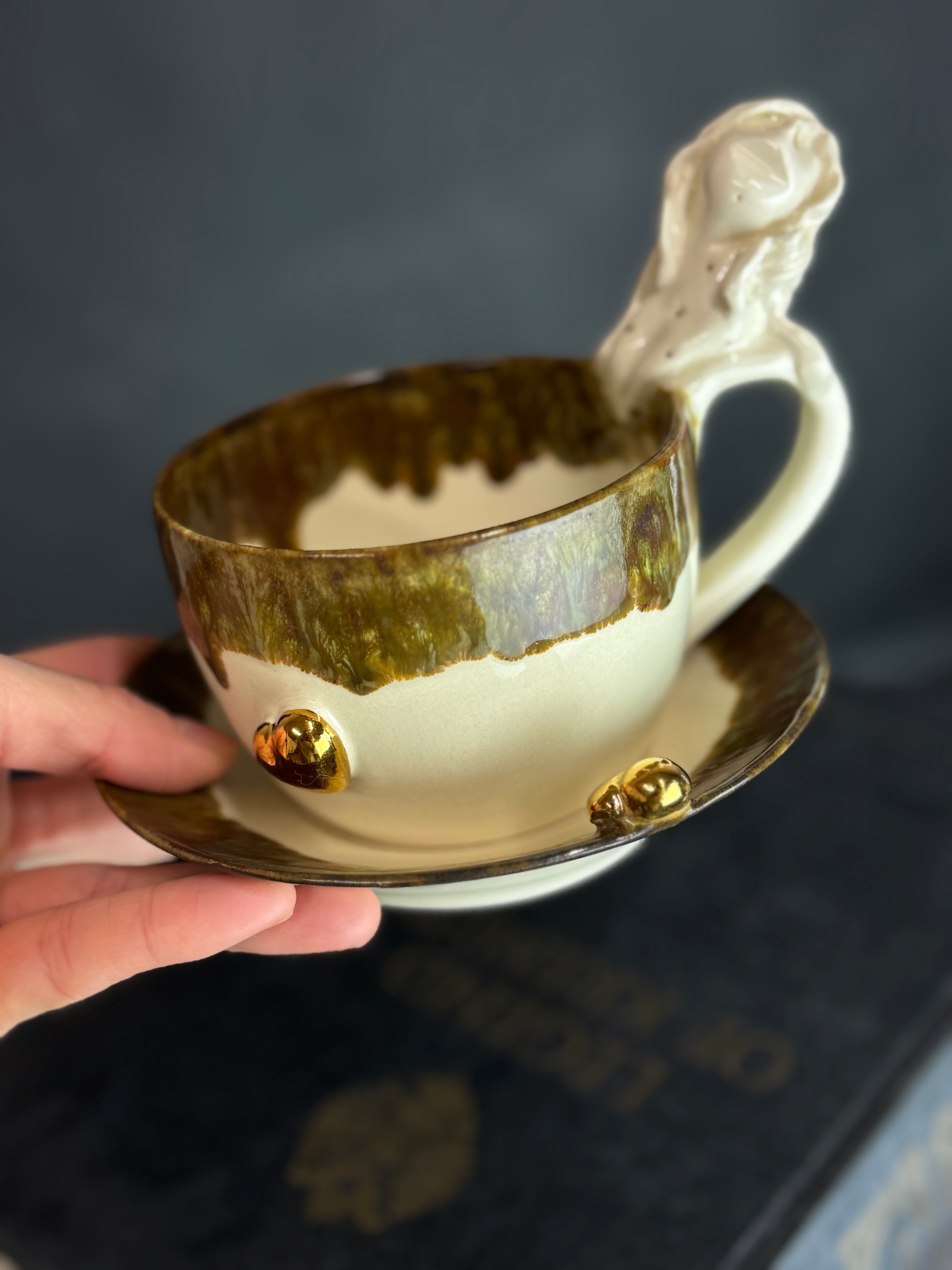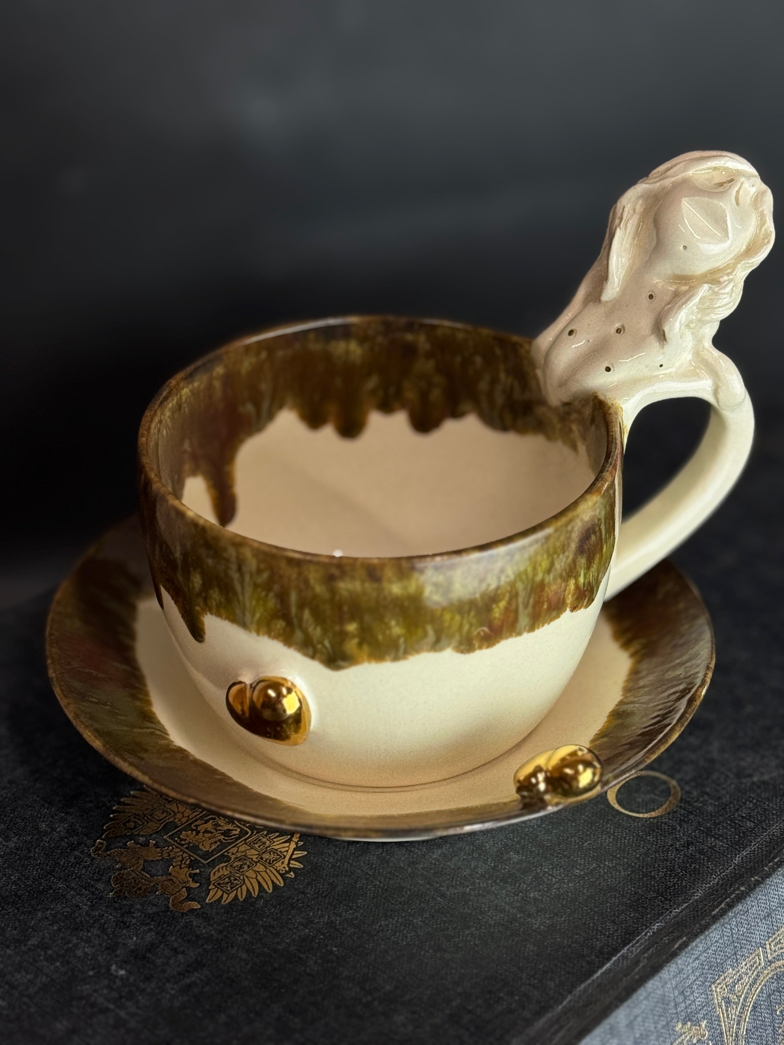 Rankų darbo balto molio kavos puodelis su lėkštute, dengtas skaidria glazūra su rudai žaliu samanų efektu.