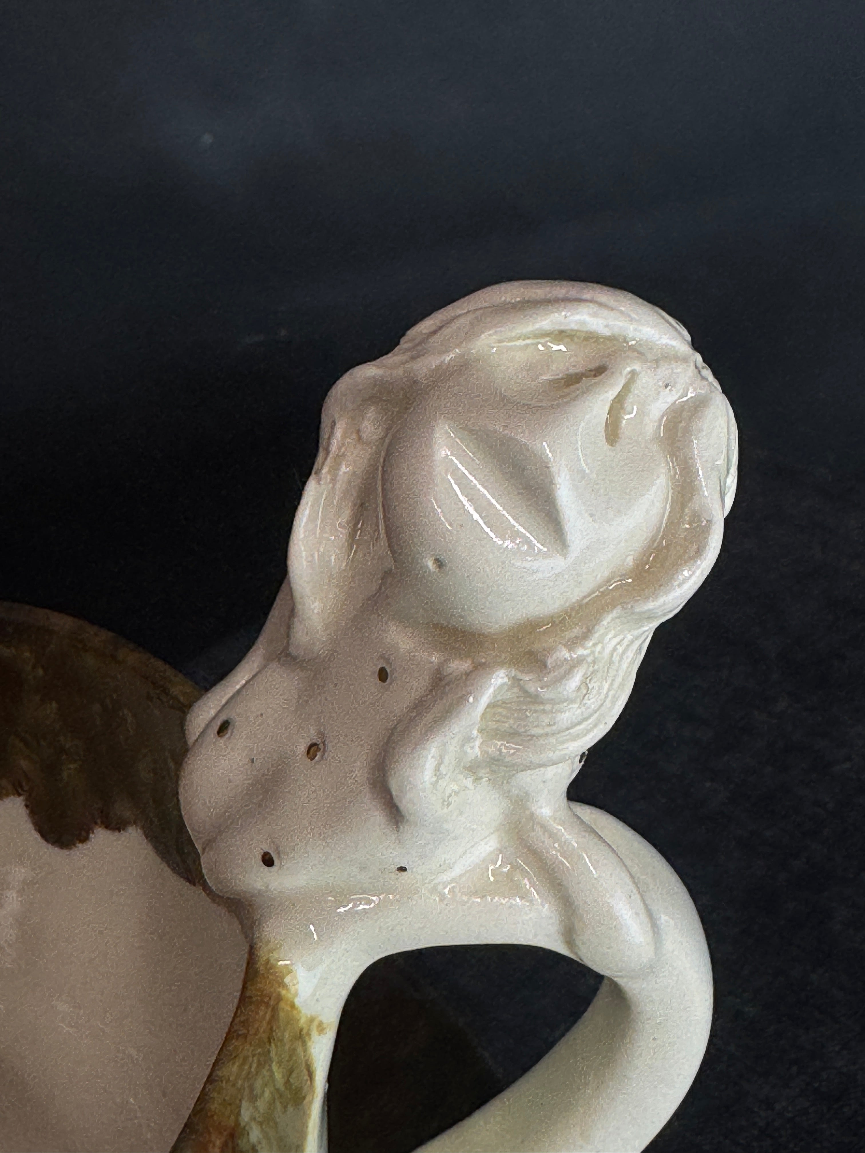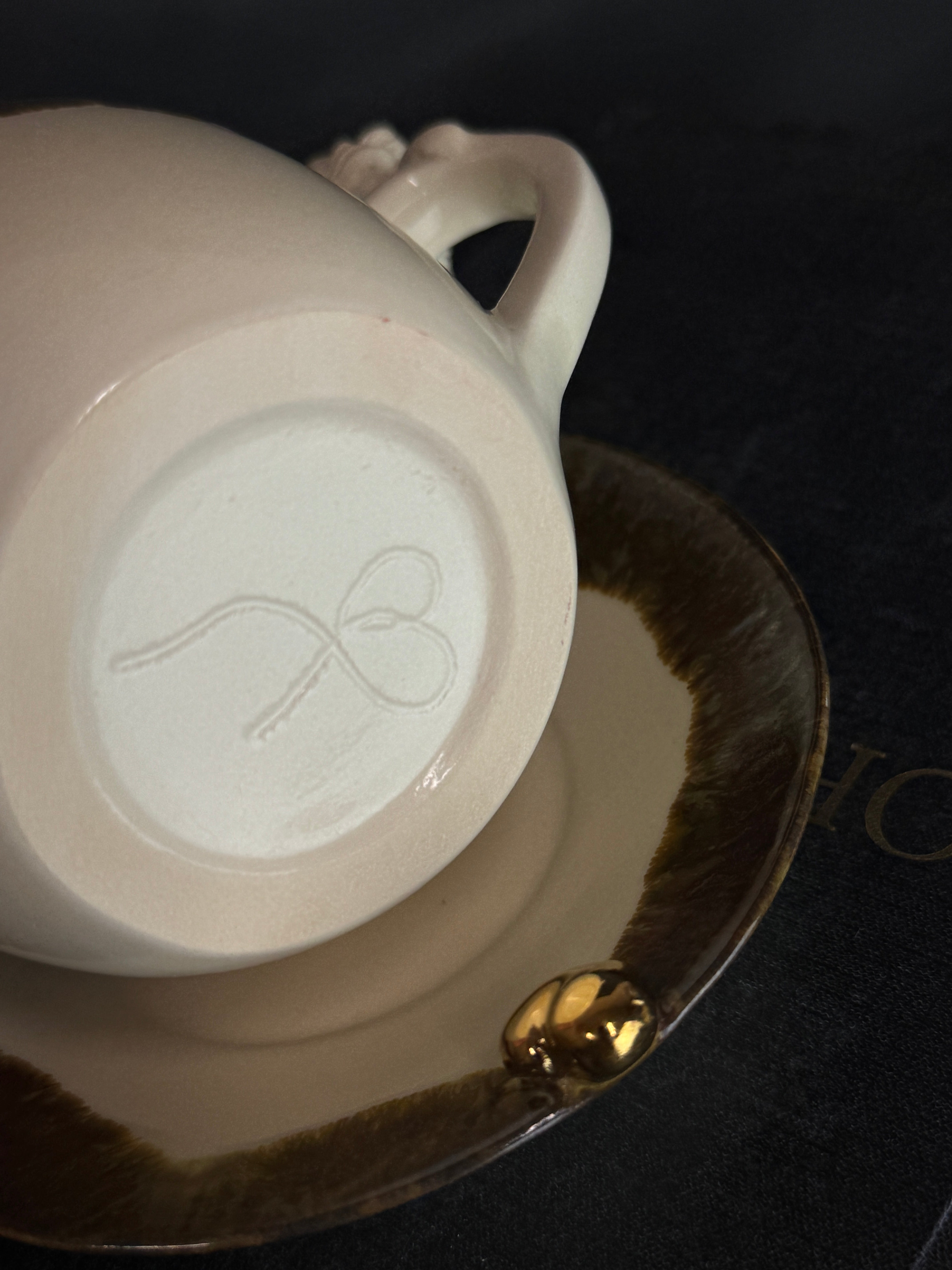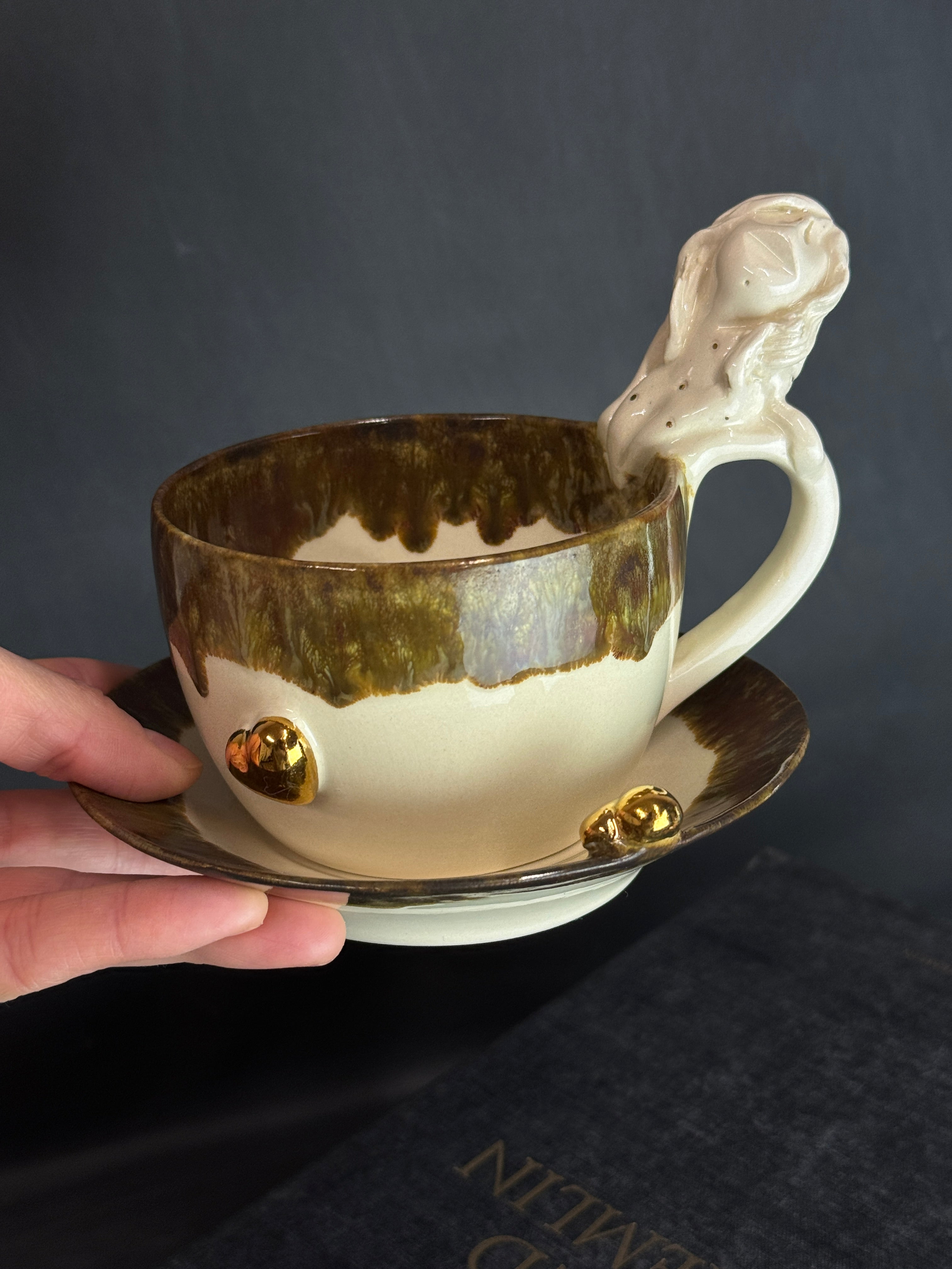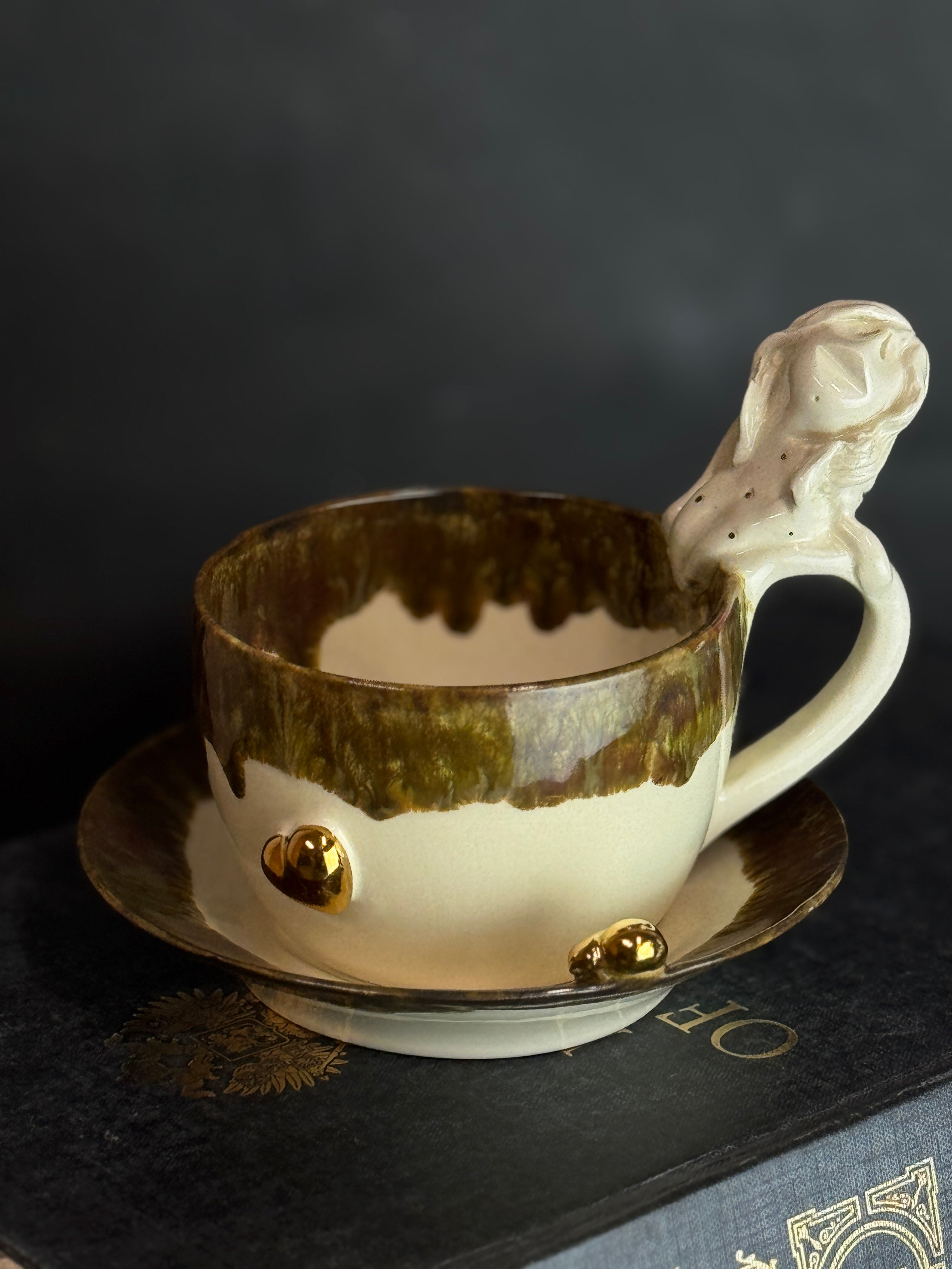 Rankų darbo balto molio kavos puodelis su lėkštute, dengtas skaidria glazūra su rudai žaliu samanų efektu.