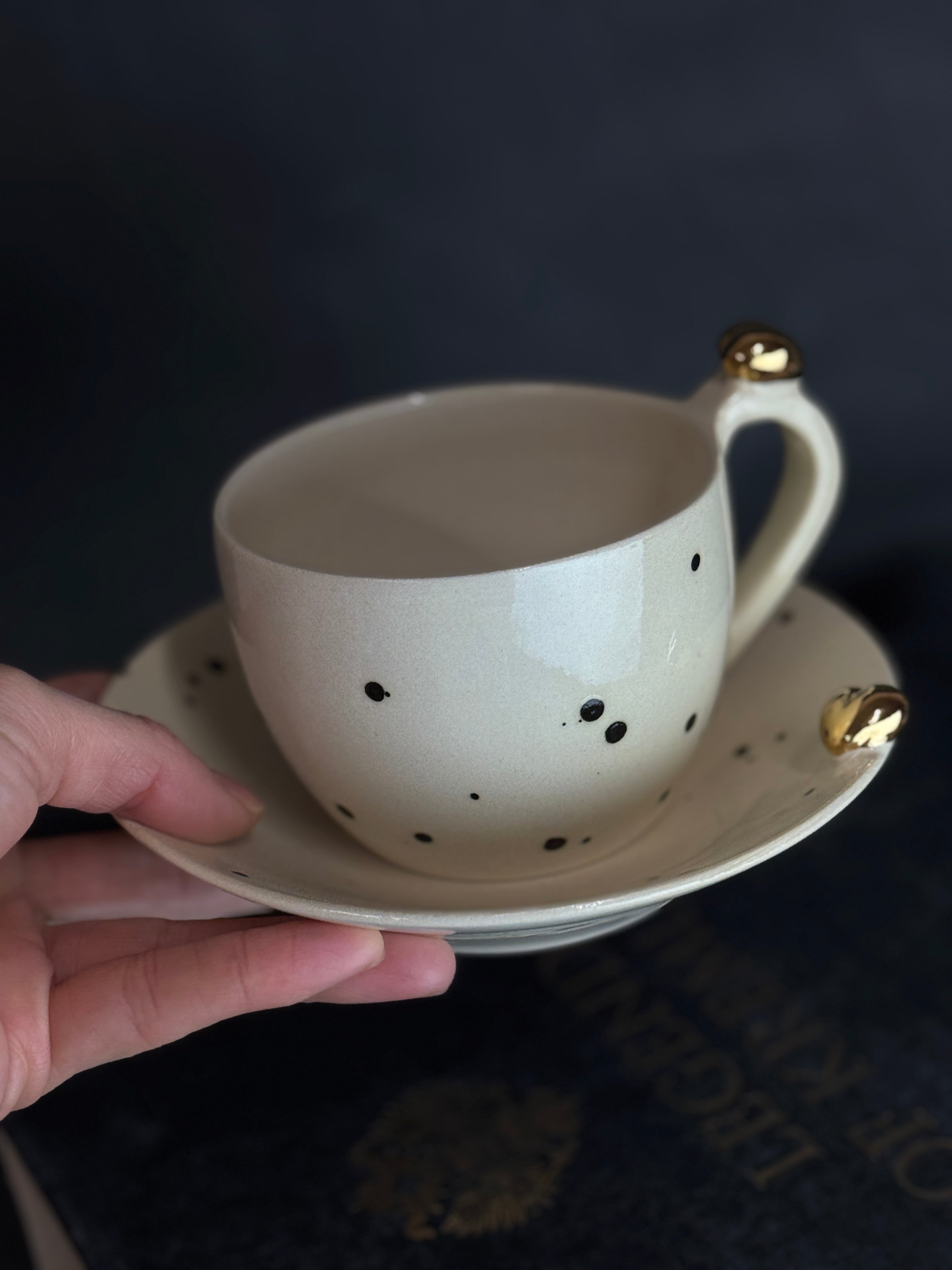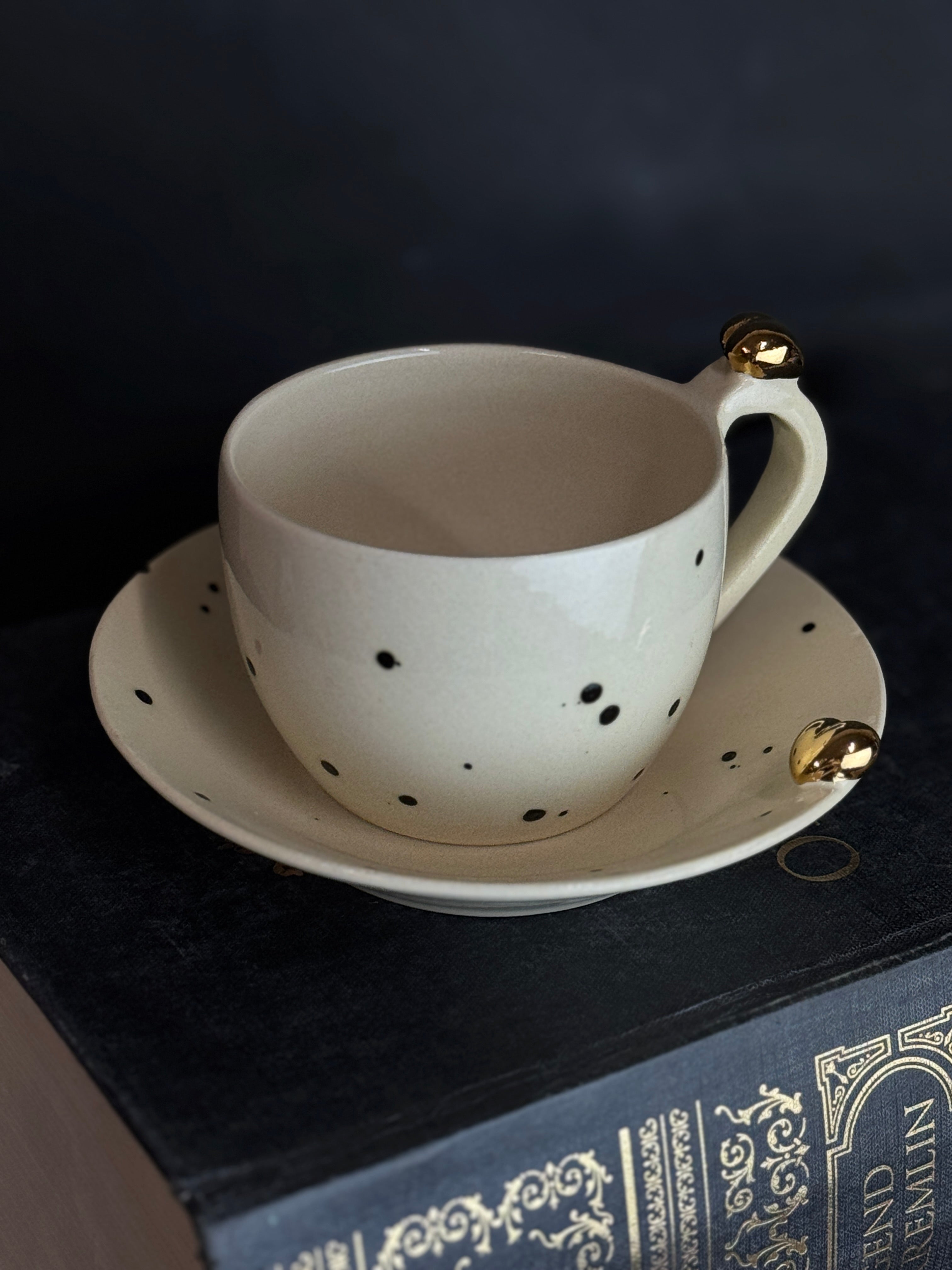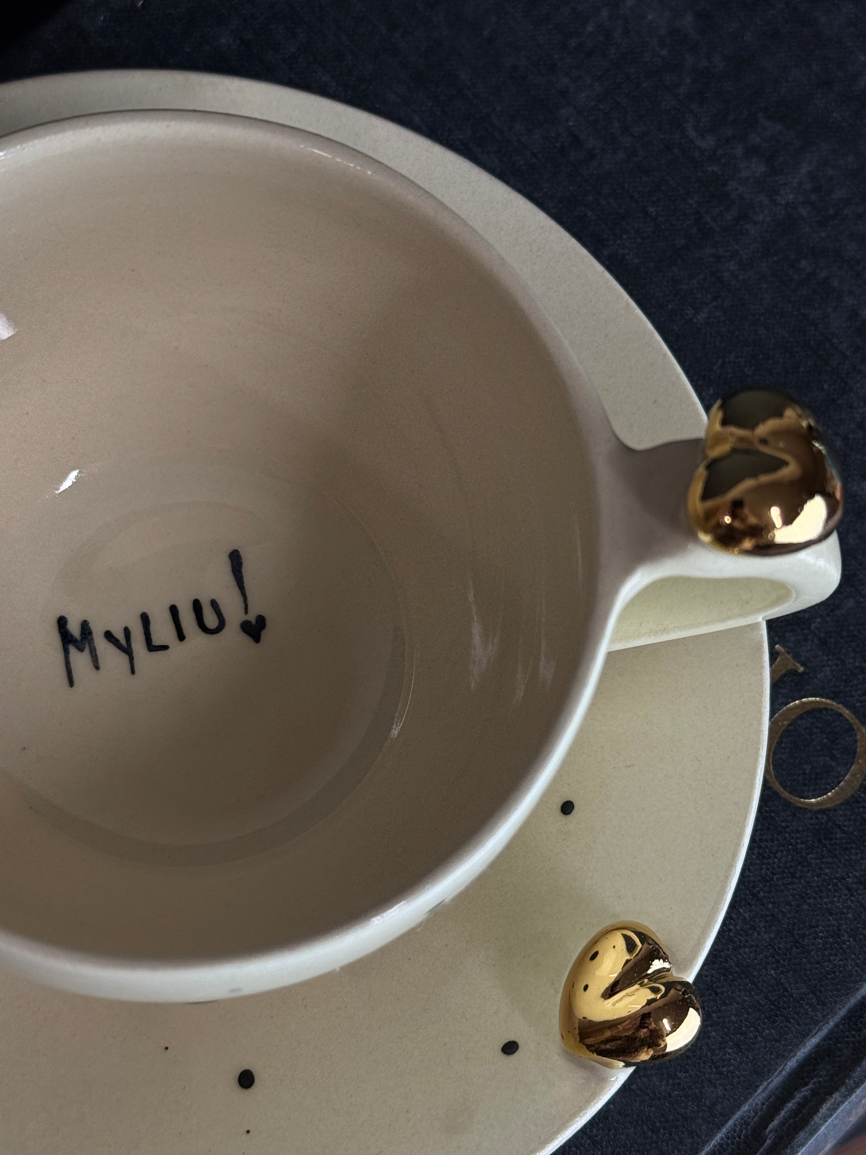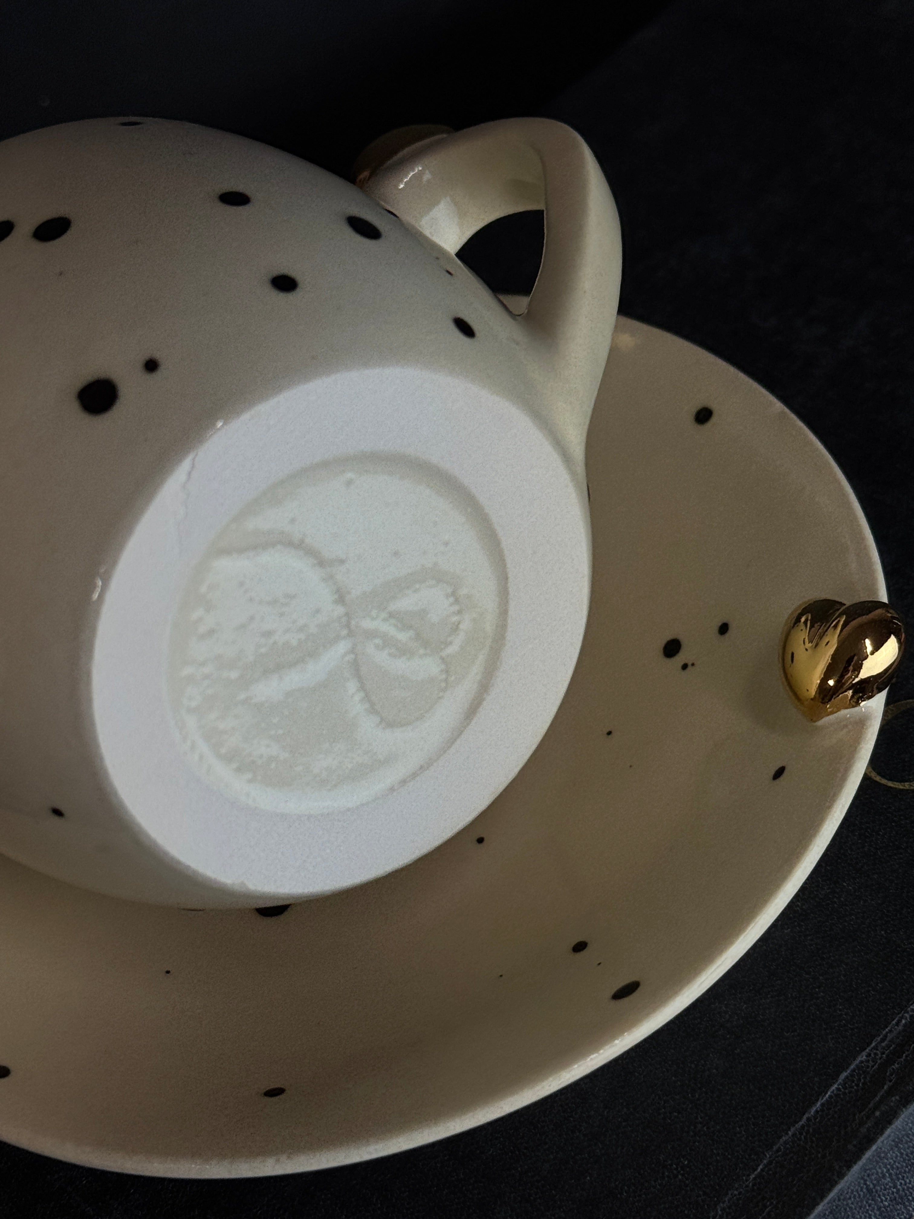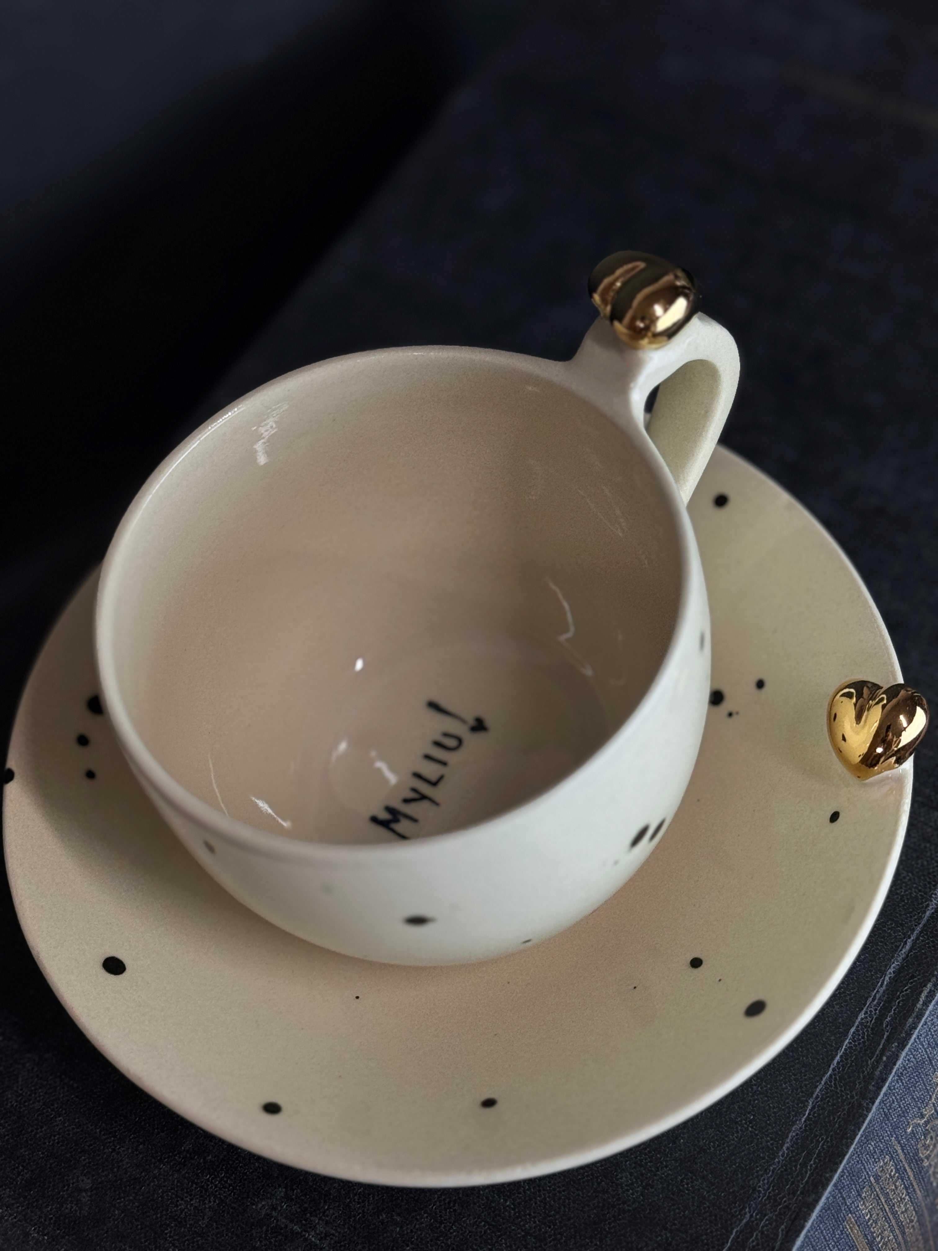 Balto molio elegantiškas kavos puodelis su širdute, su užrašu “Myliu!”, dengtas skaidria glazūra su juodais tškais. Dekoruotas 12 % aukso tirpalu.