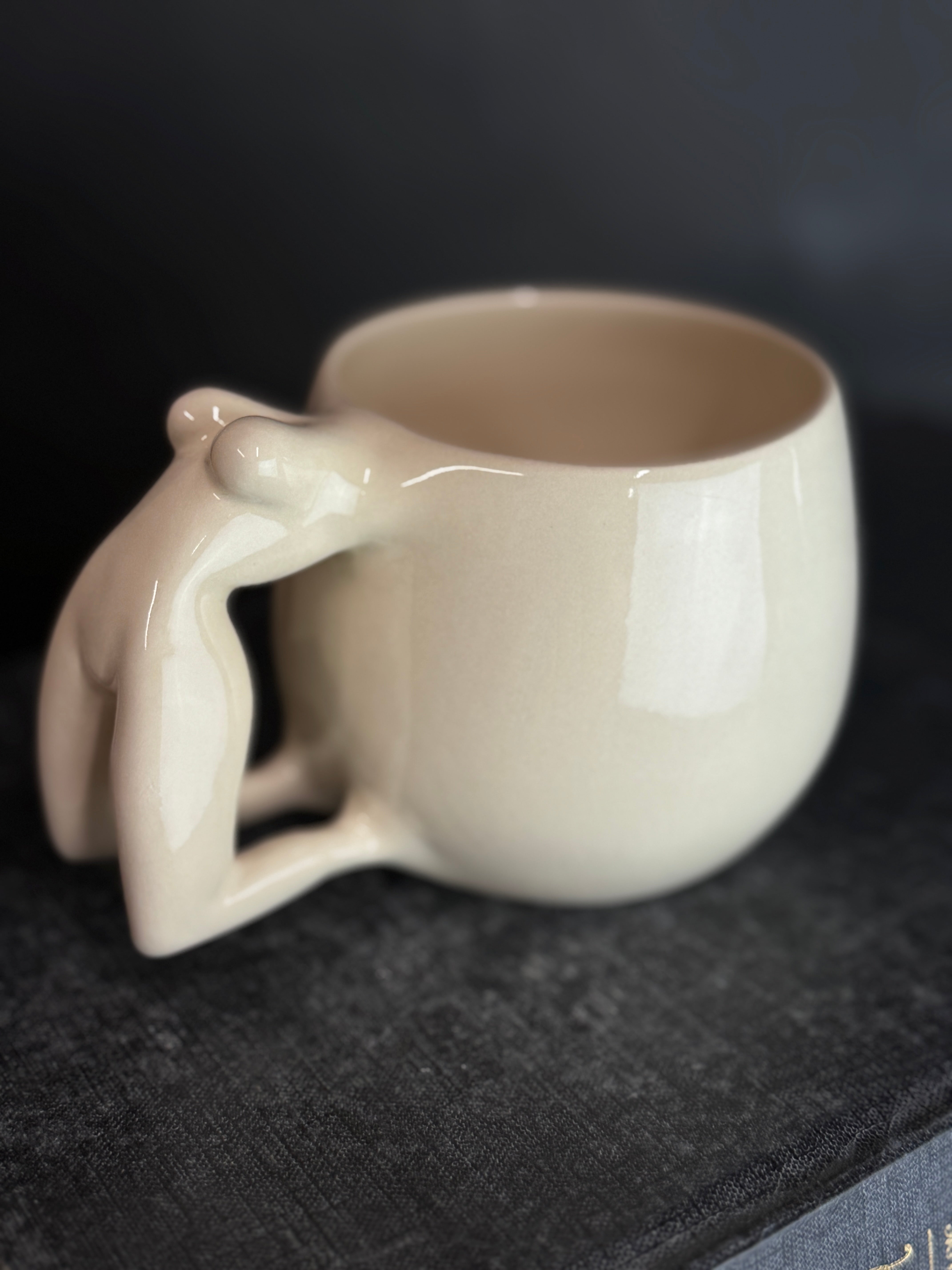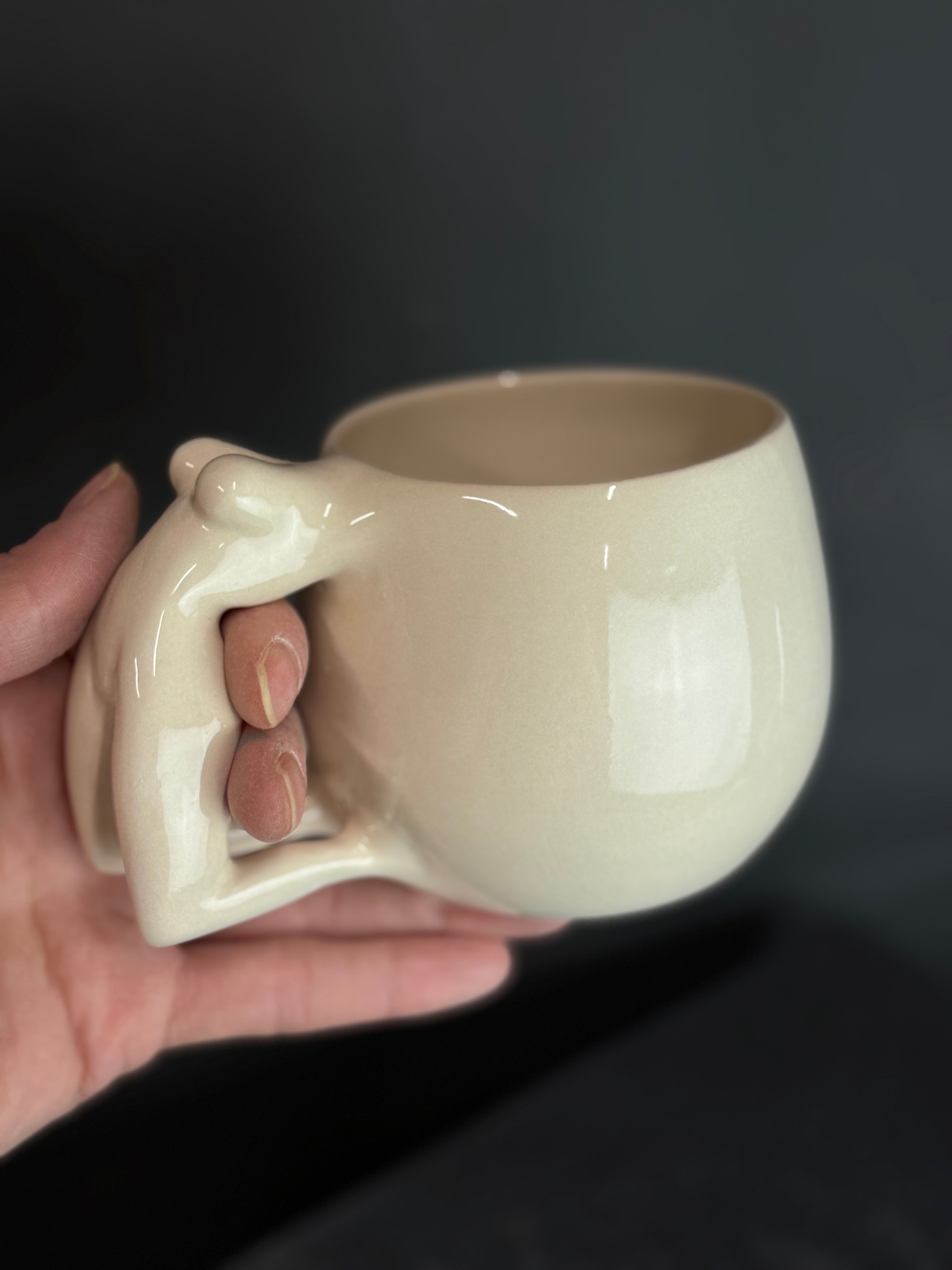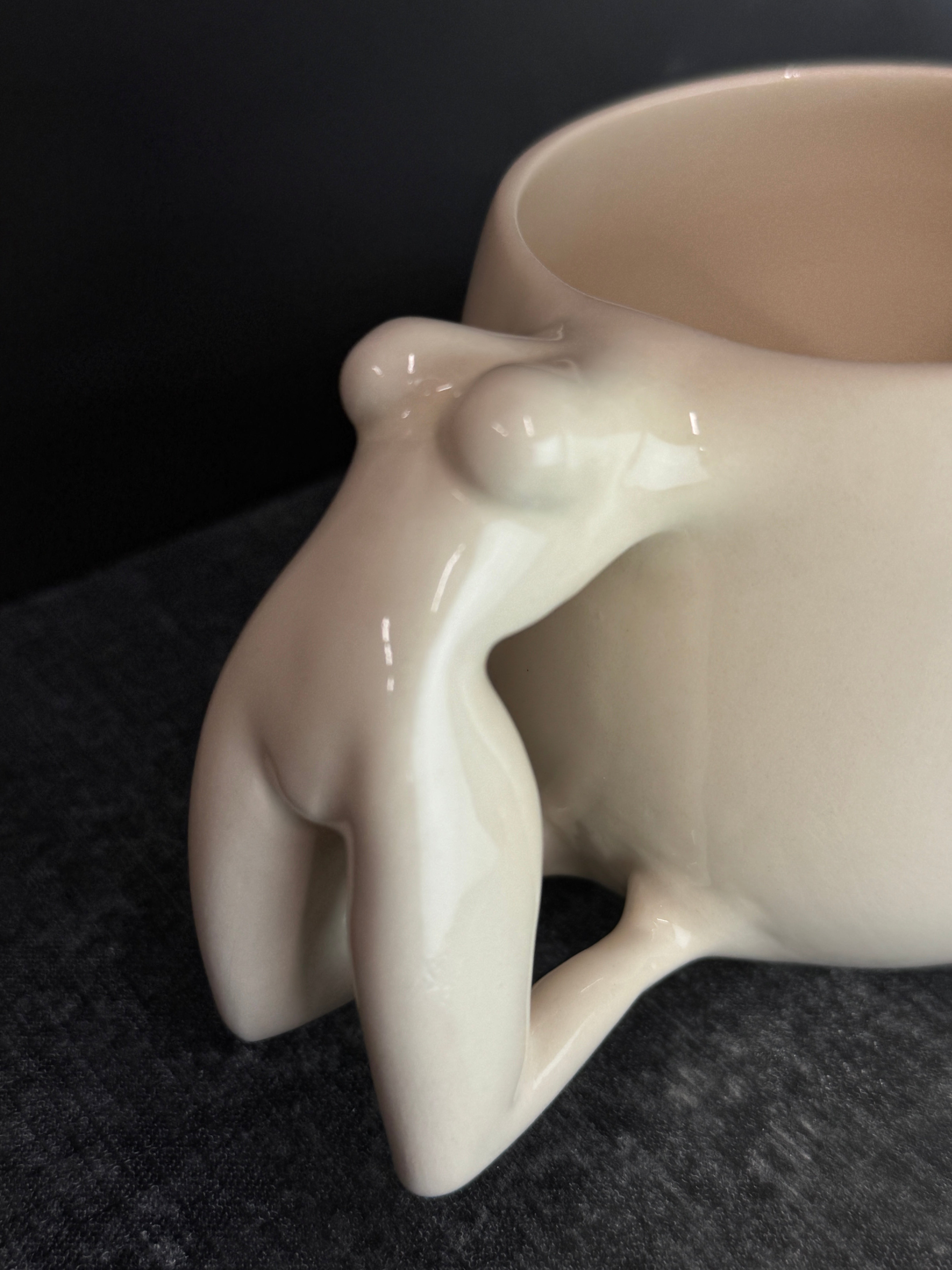 Balto molio puodelis su moters figūra. Dengtas skaidria glazūra.