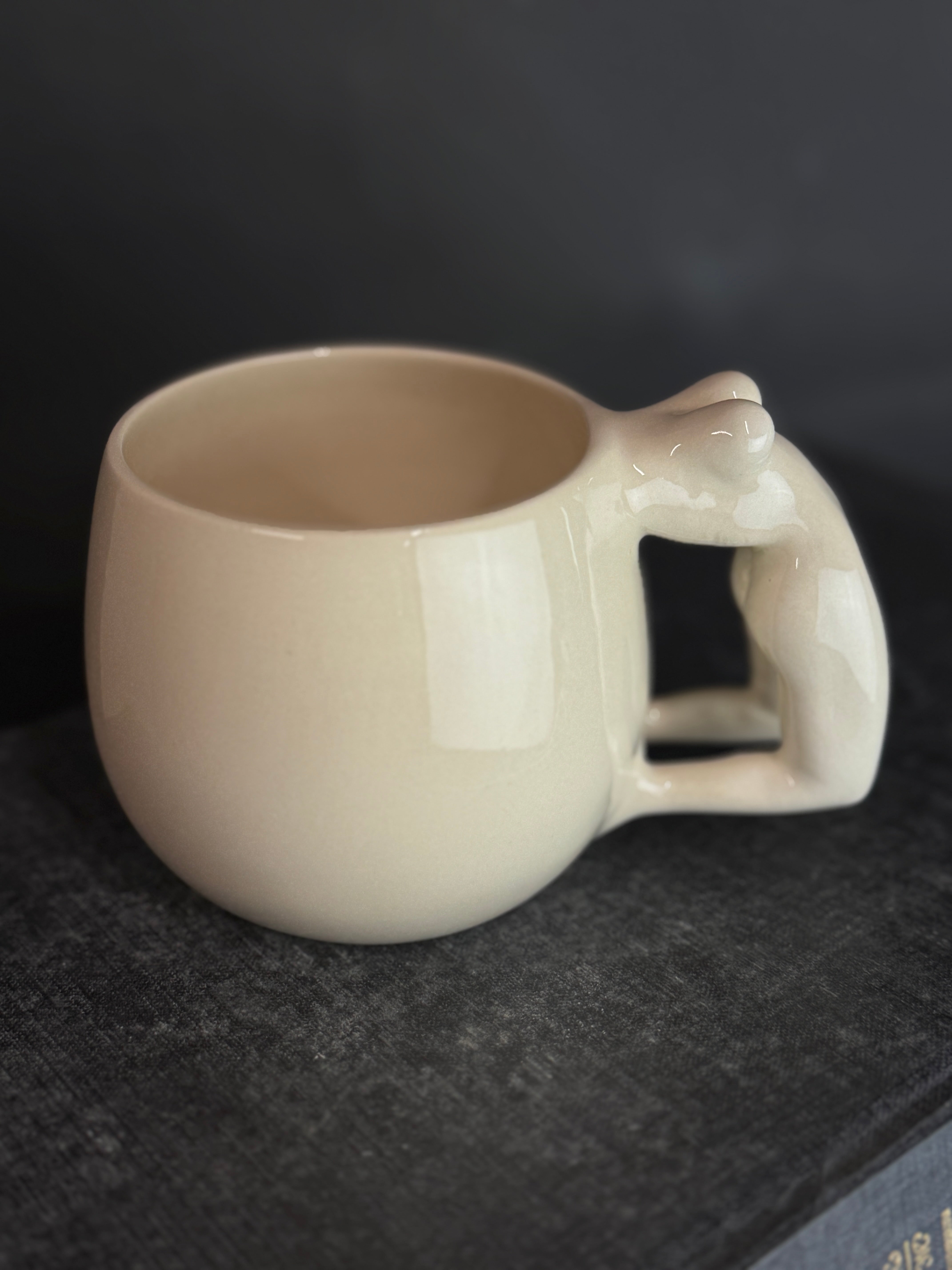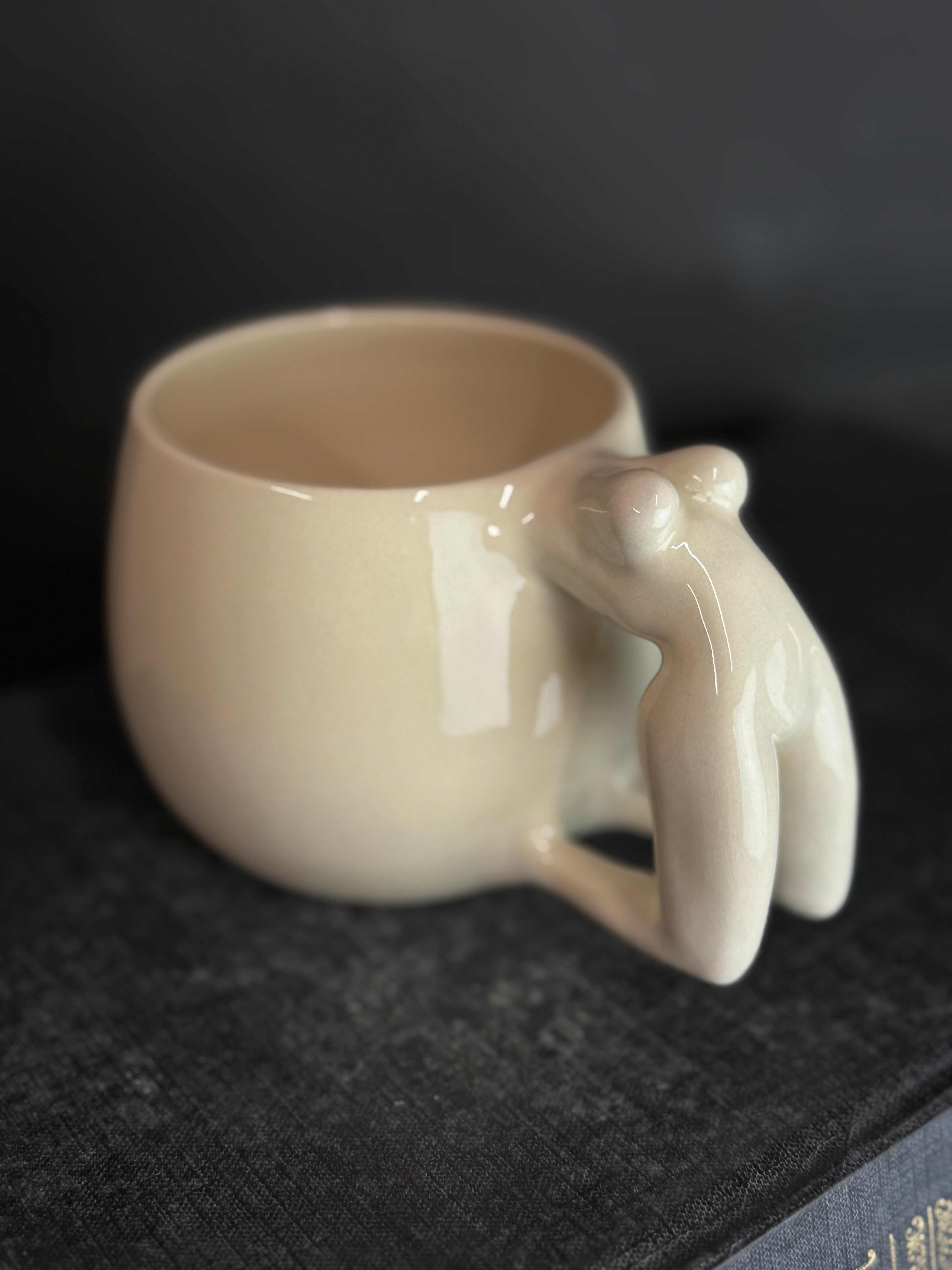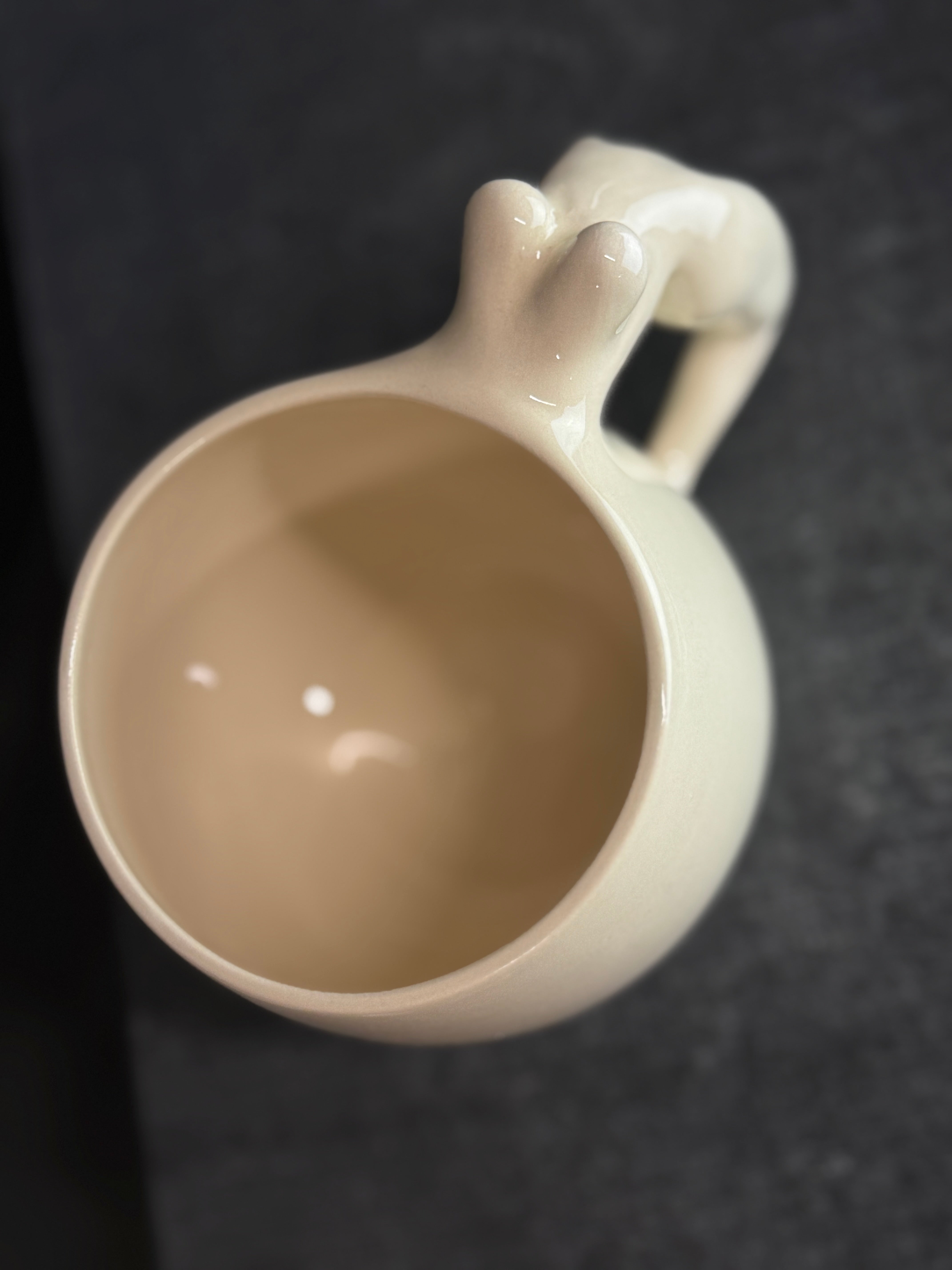 Balto molio puodelis su moters figūra. Dengtas skaidria glazūra.