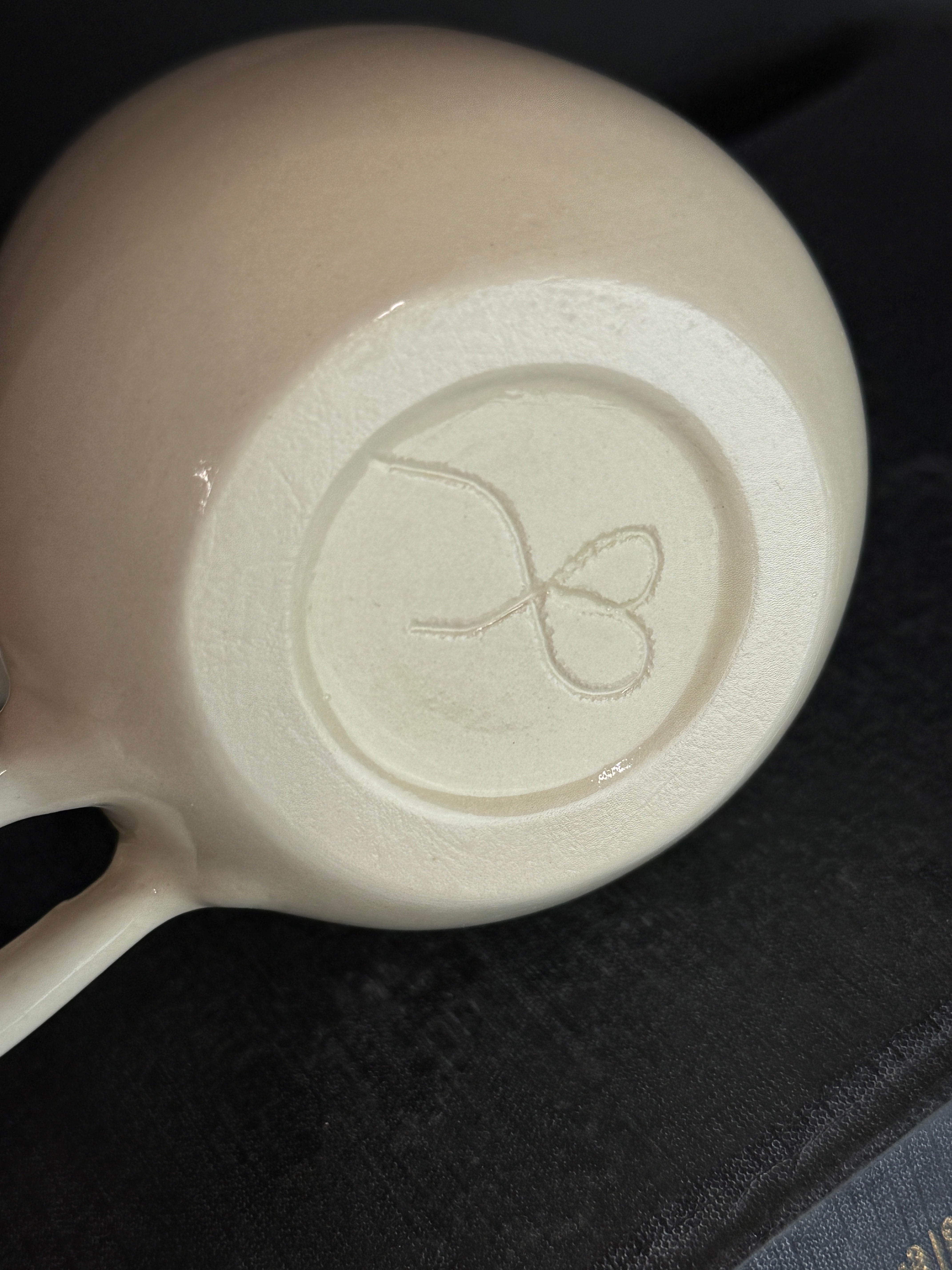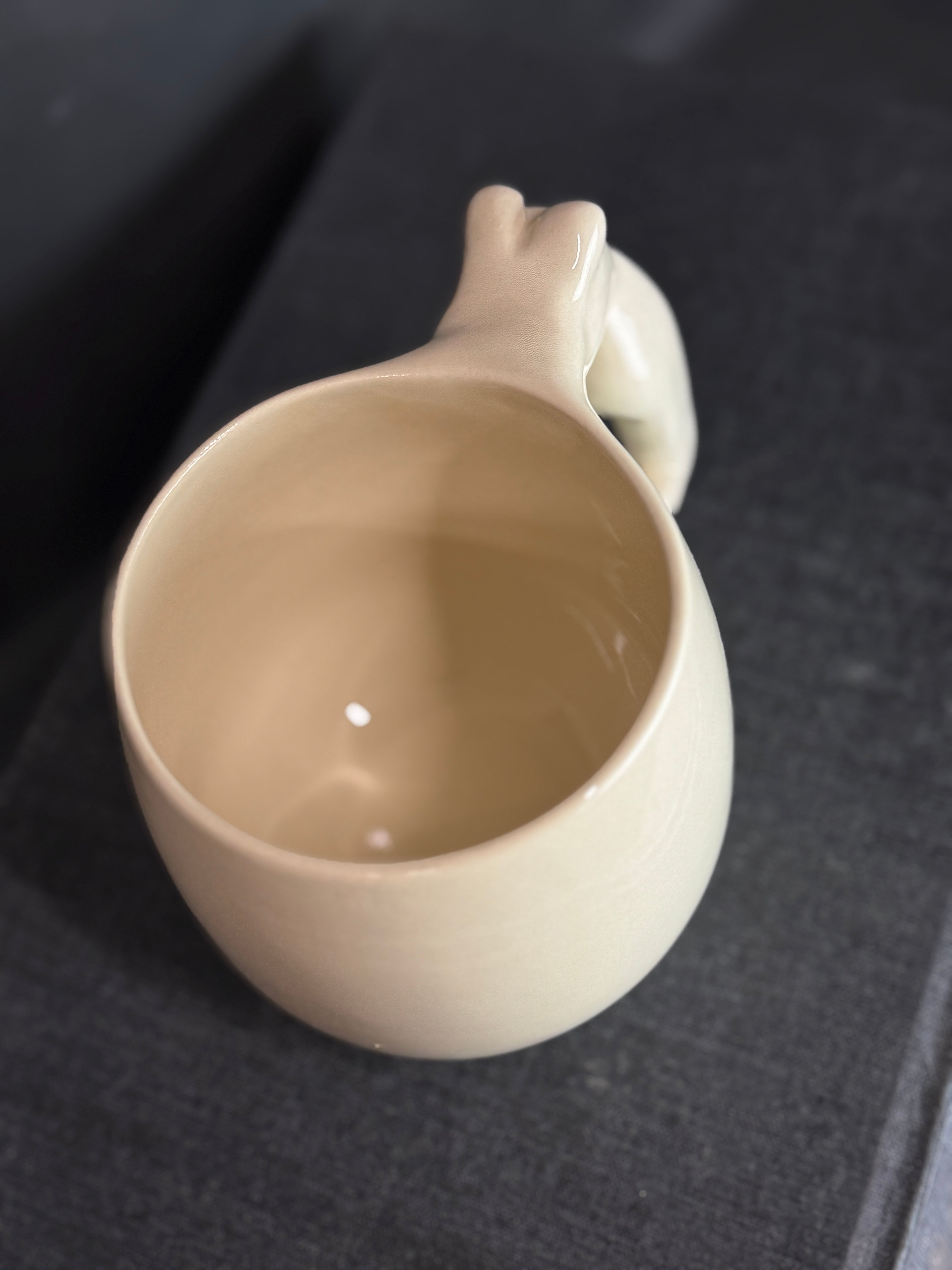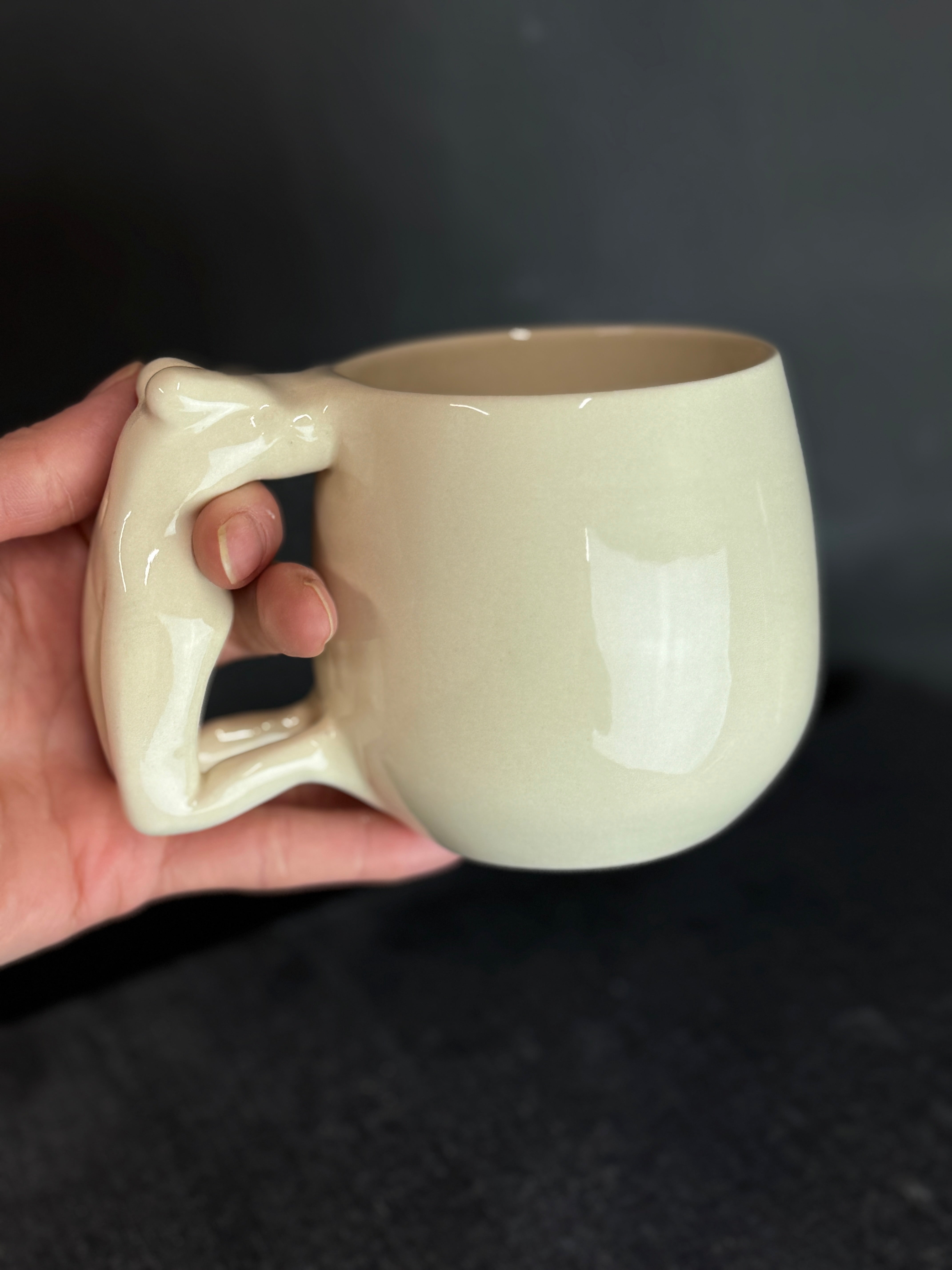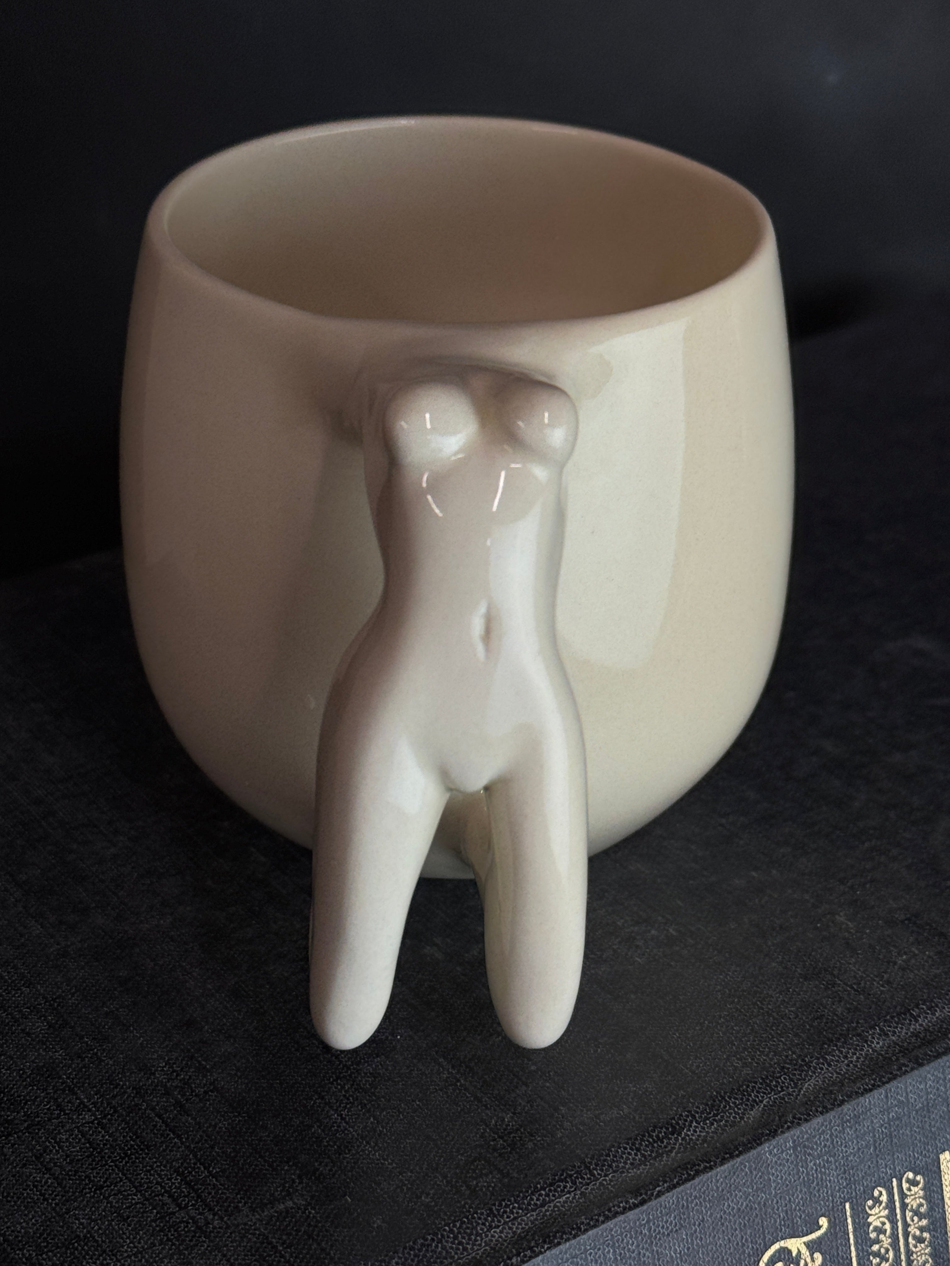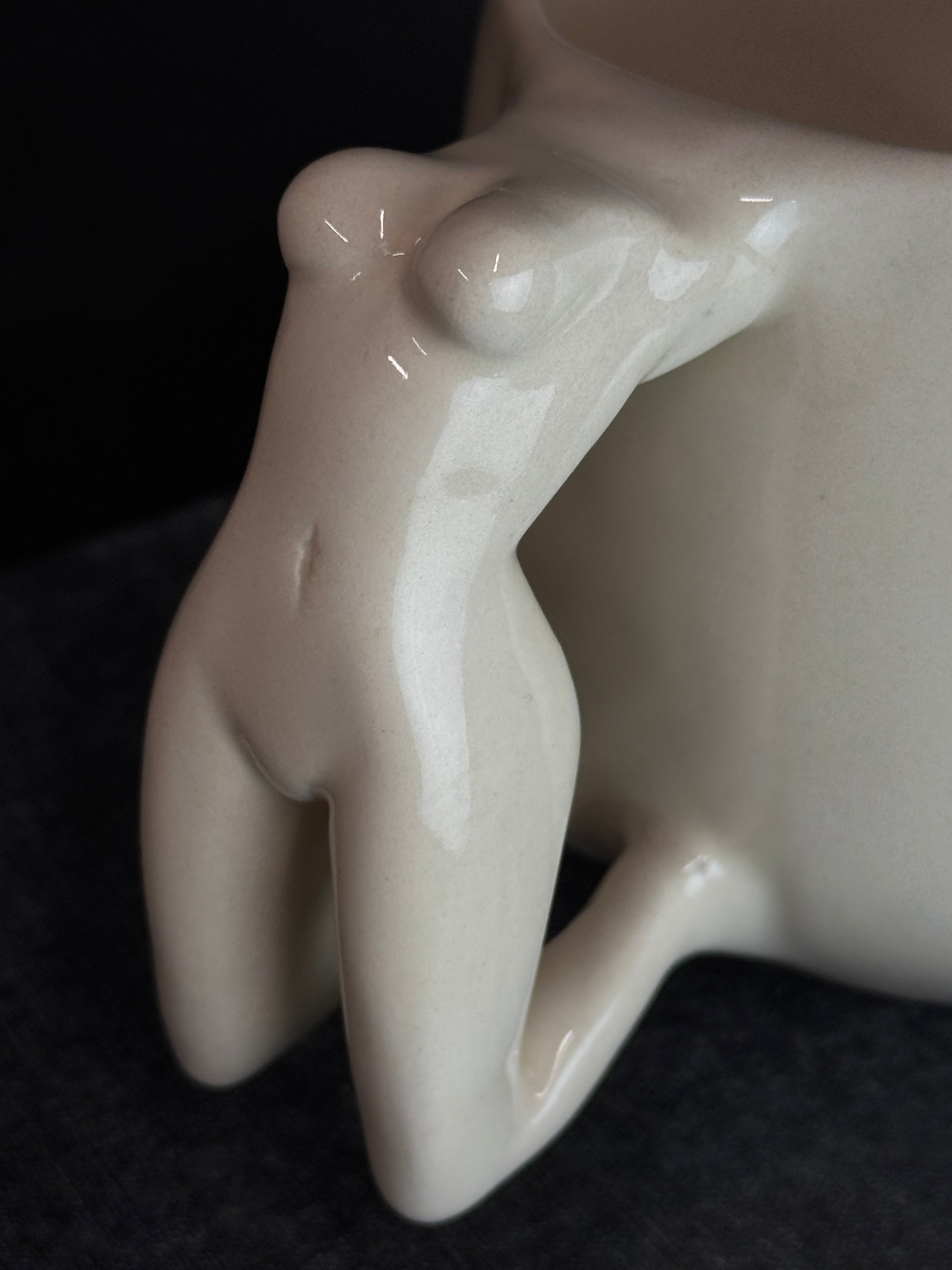 Balto molio puodelis su moters figūra. Dengtas skaidria glazūra.