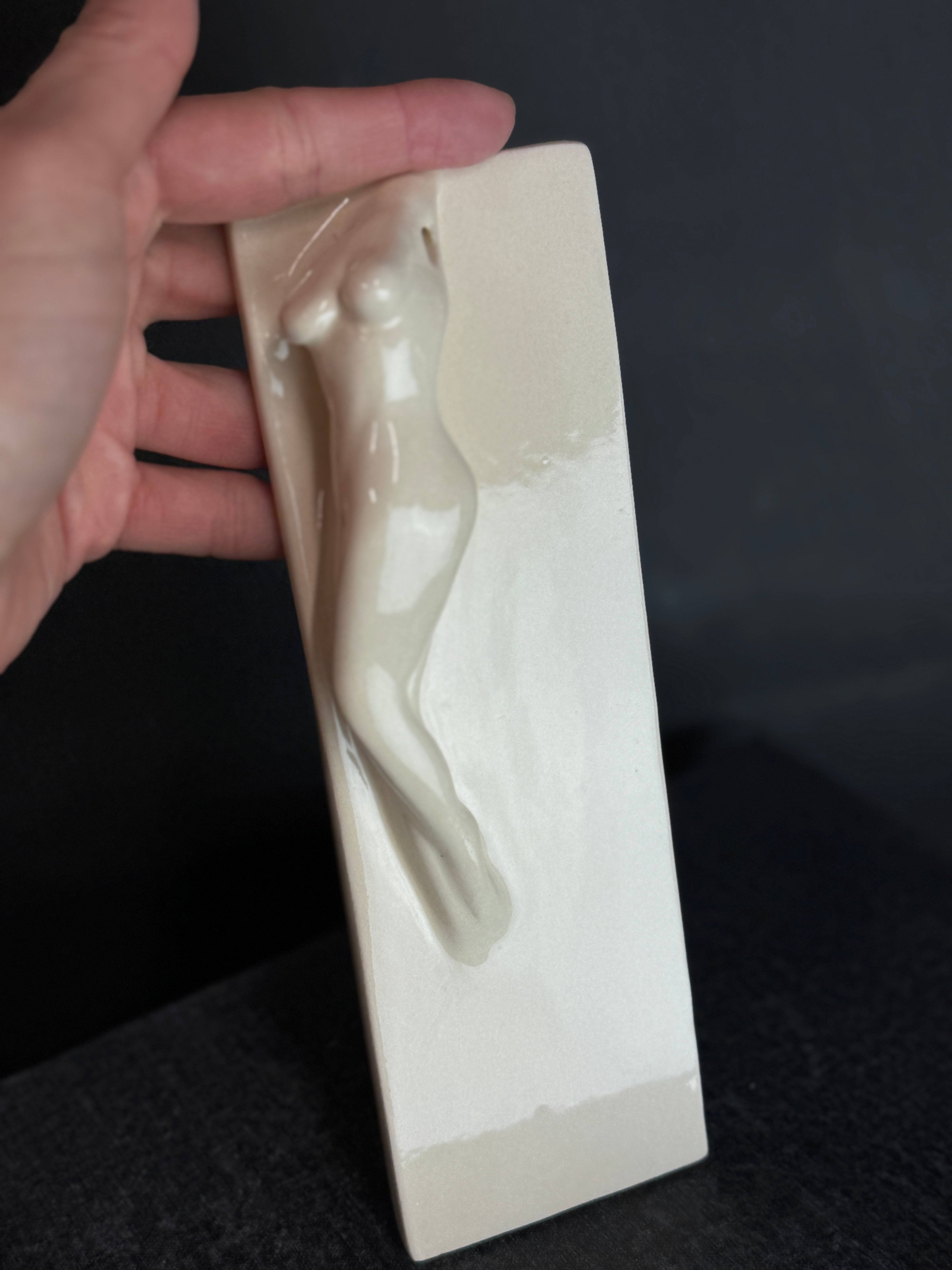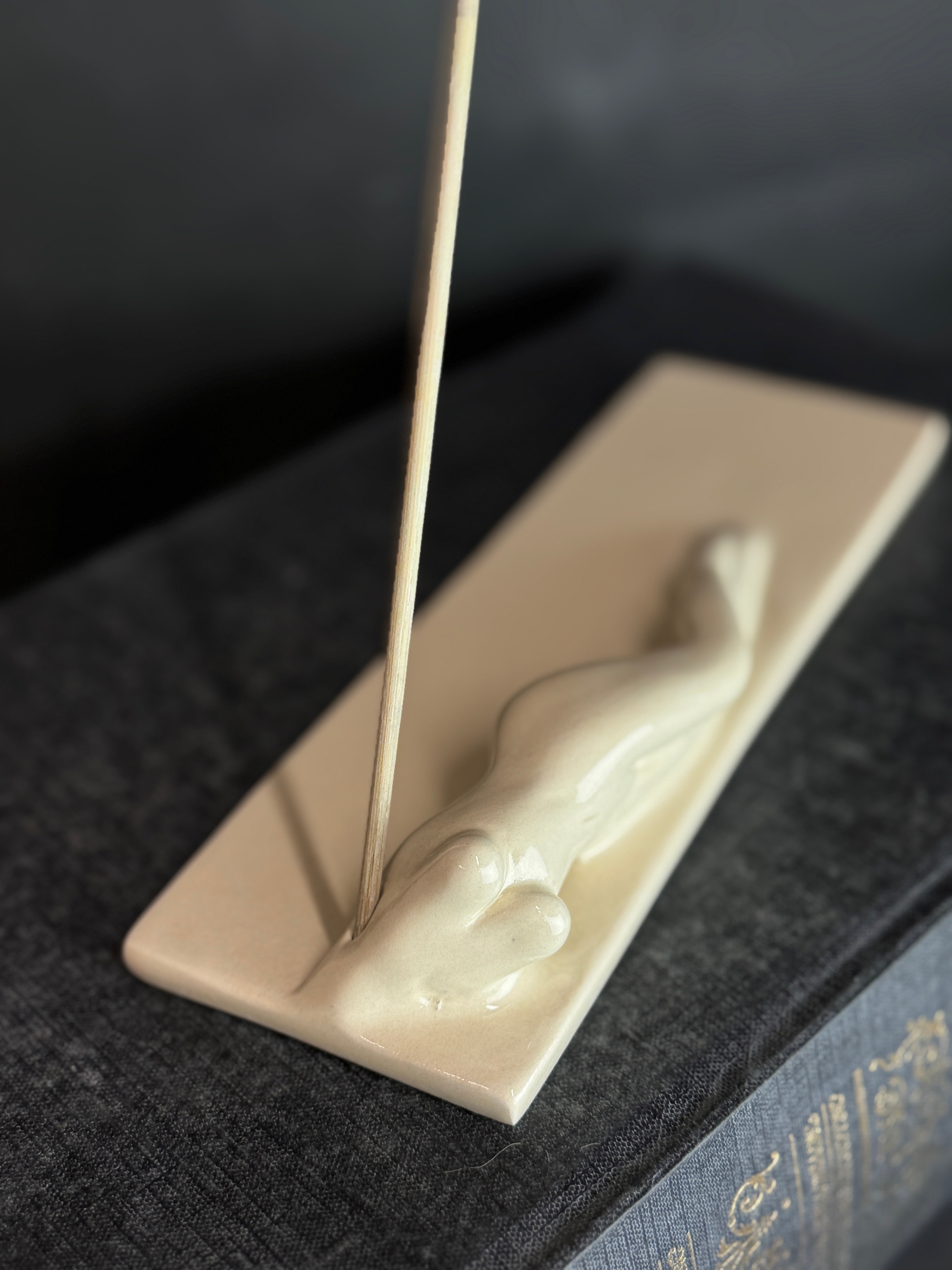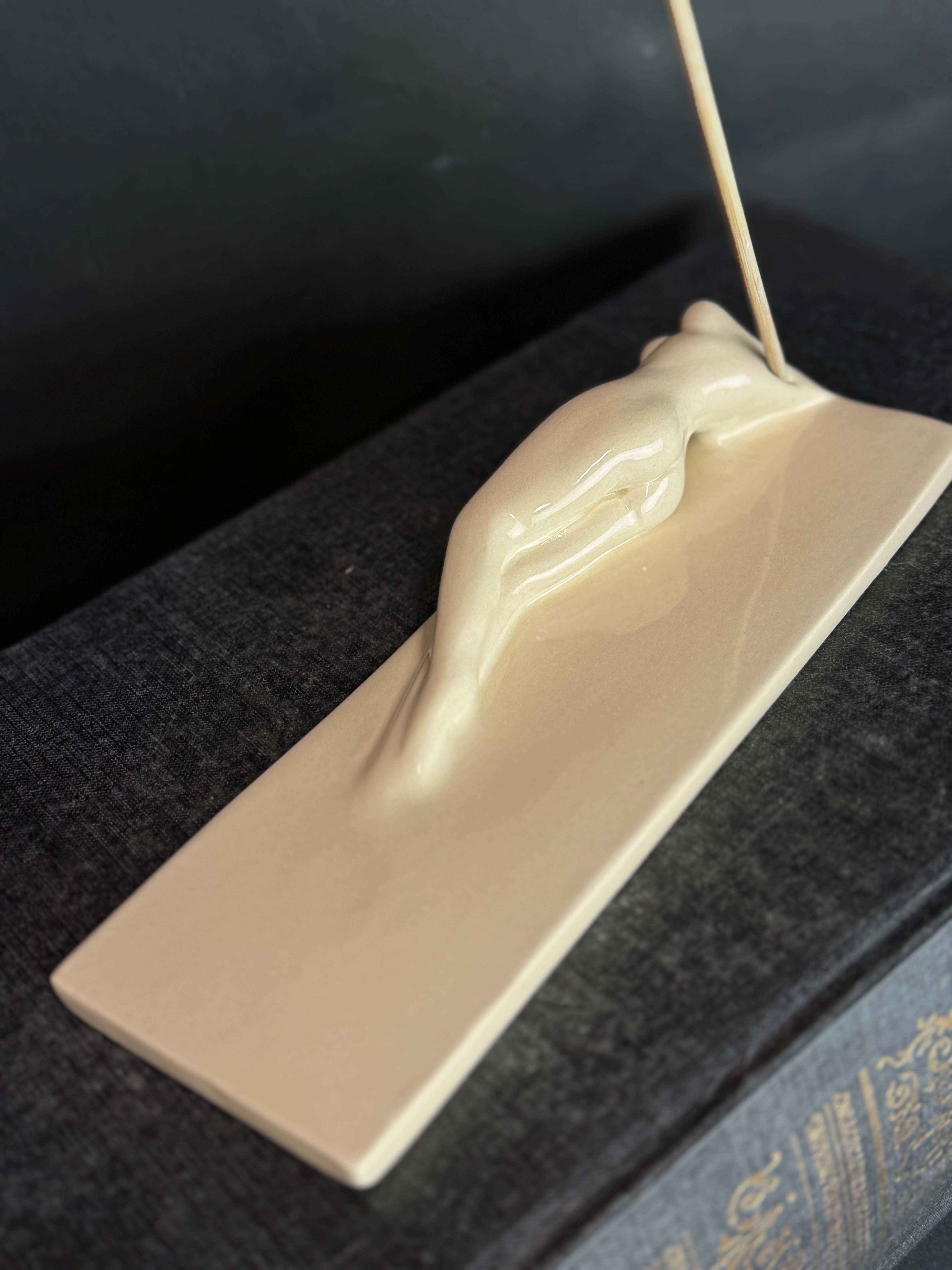 Rankų darbo provokuojanti smilkalinė su moters kūnu.