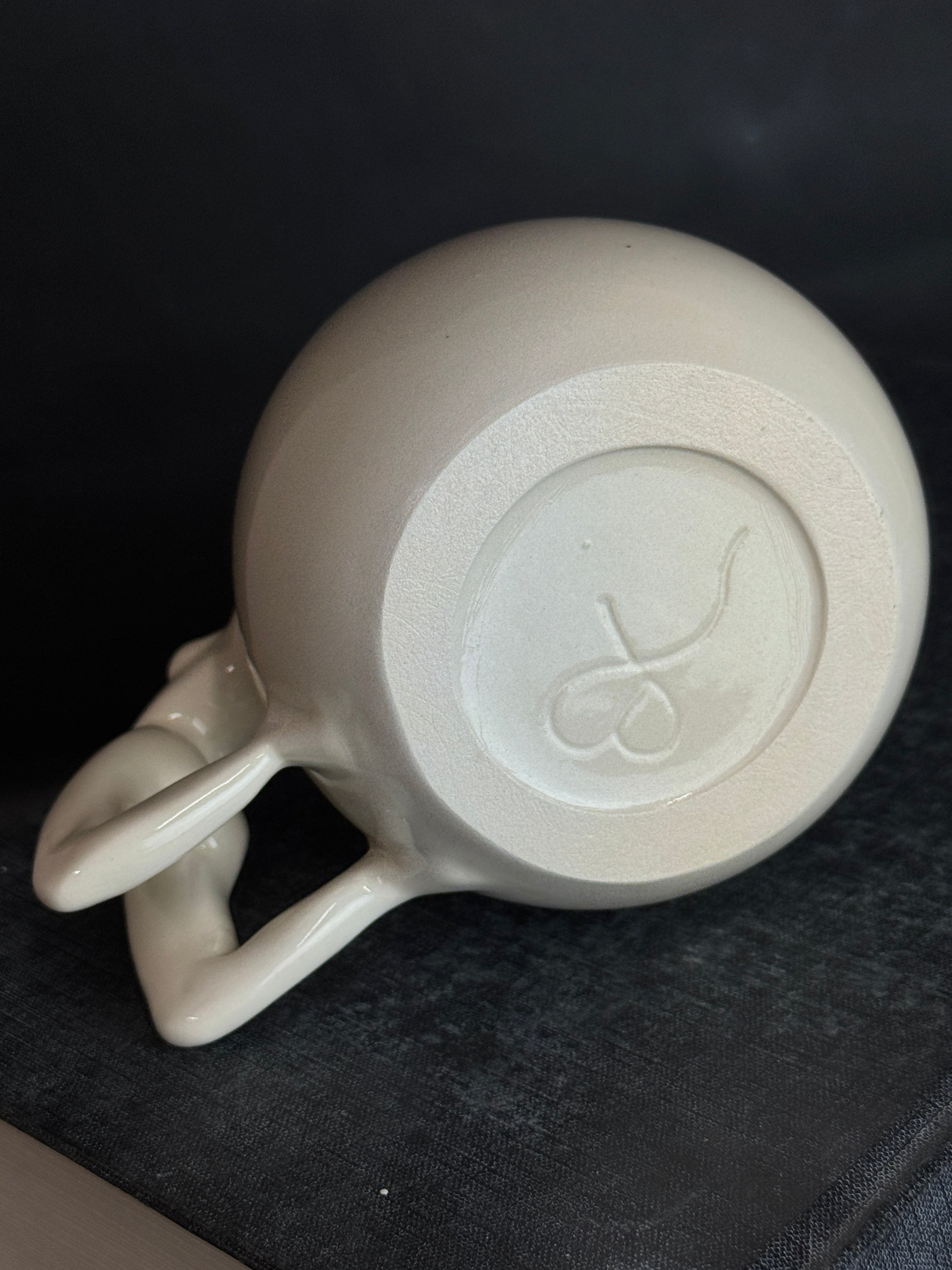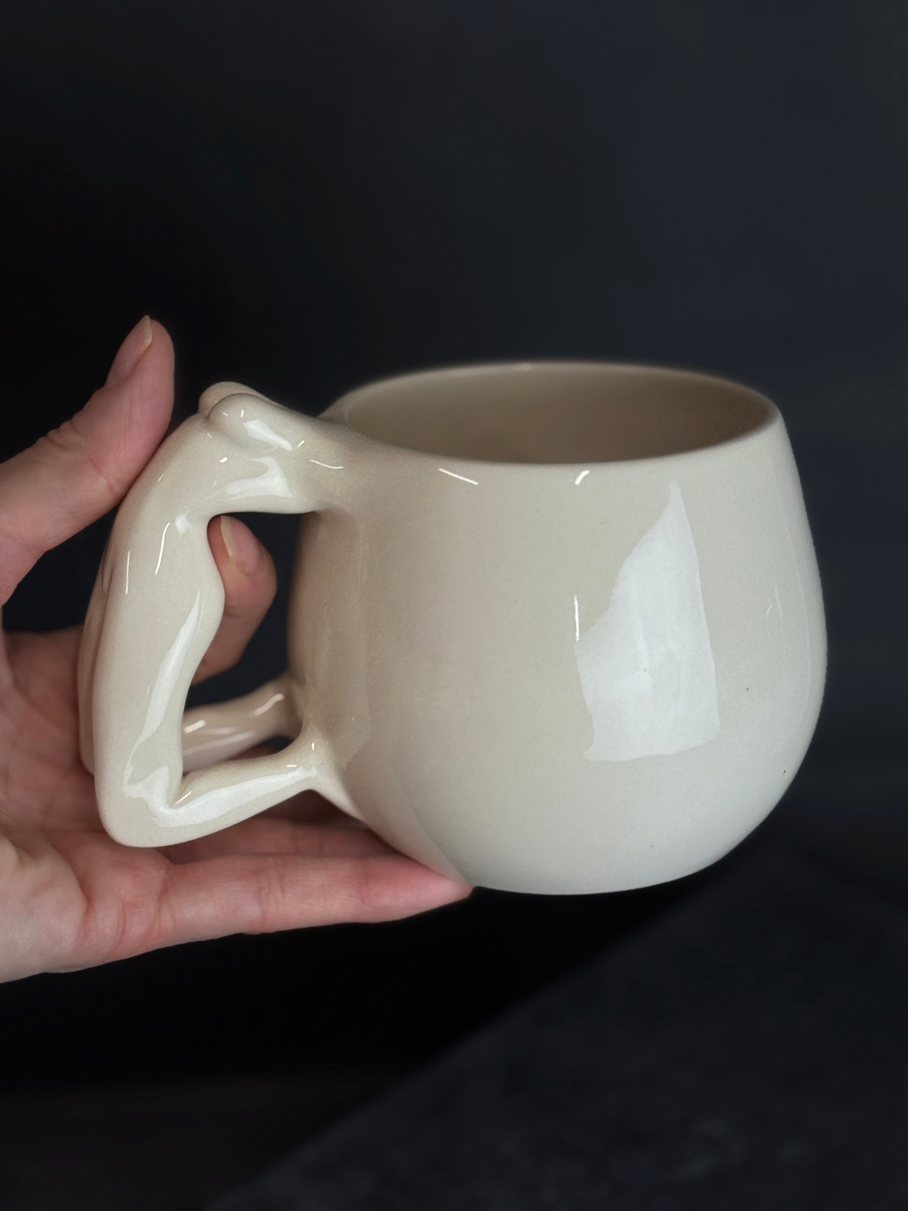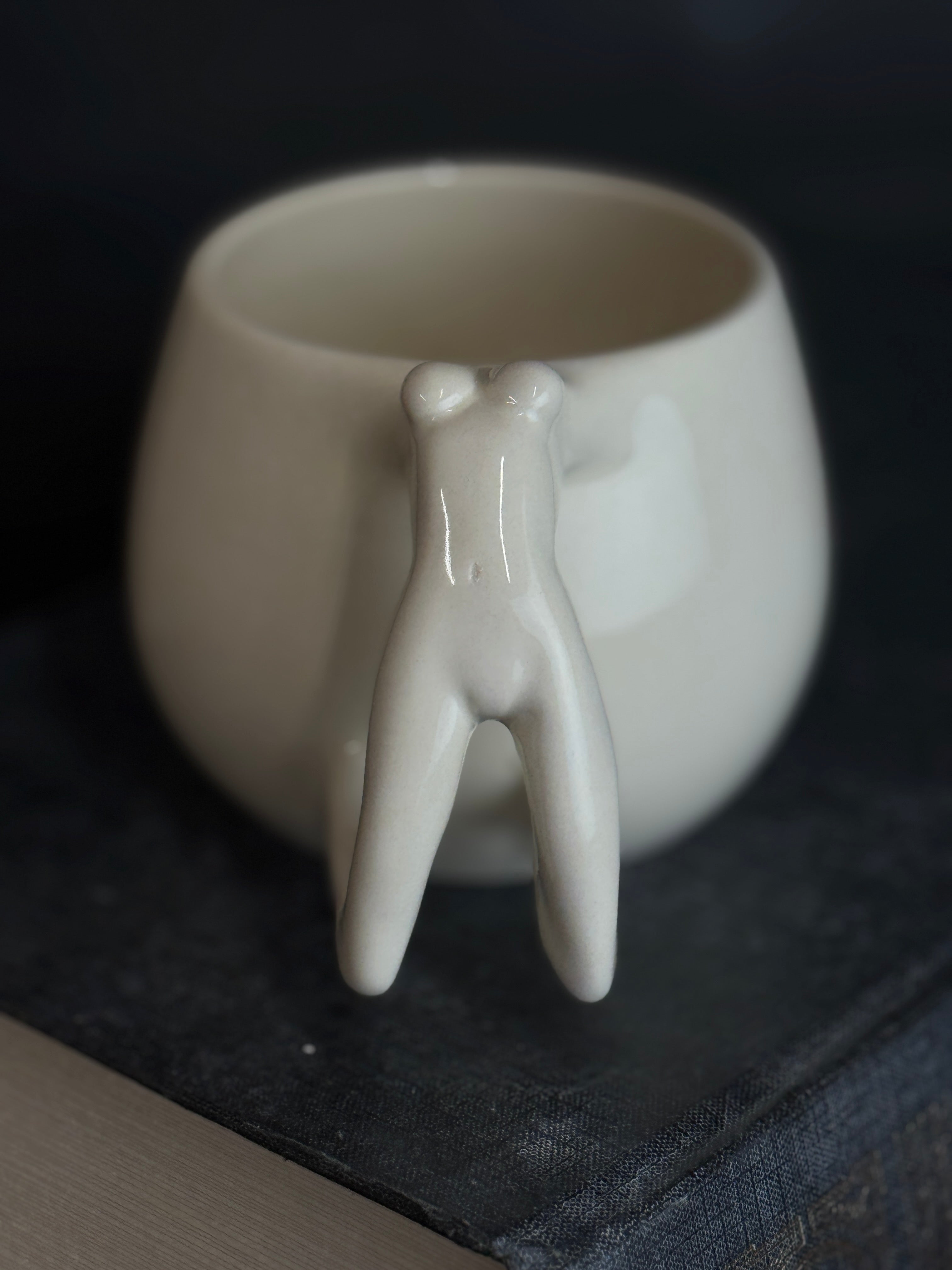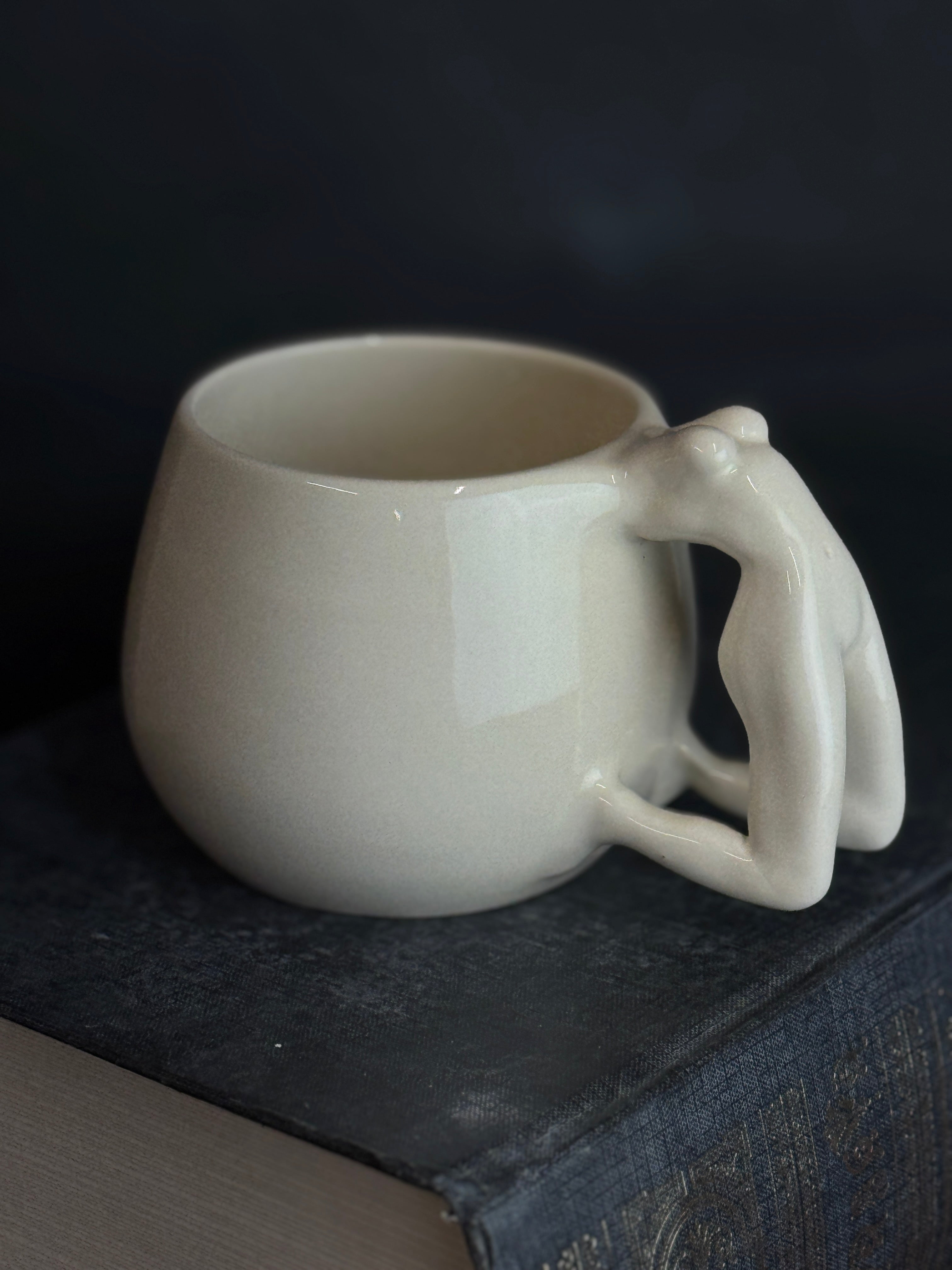 Balto molio puodelis su moters figūra. Dengtas skaidria glazūra.
