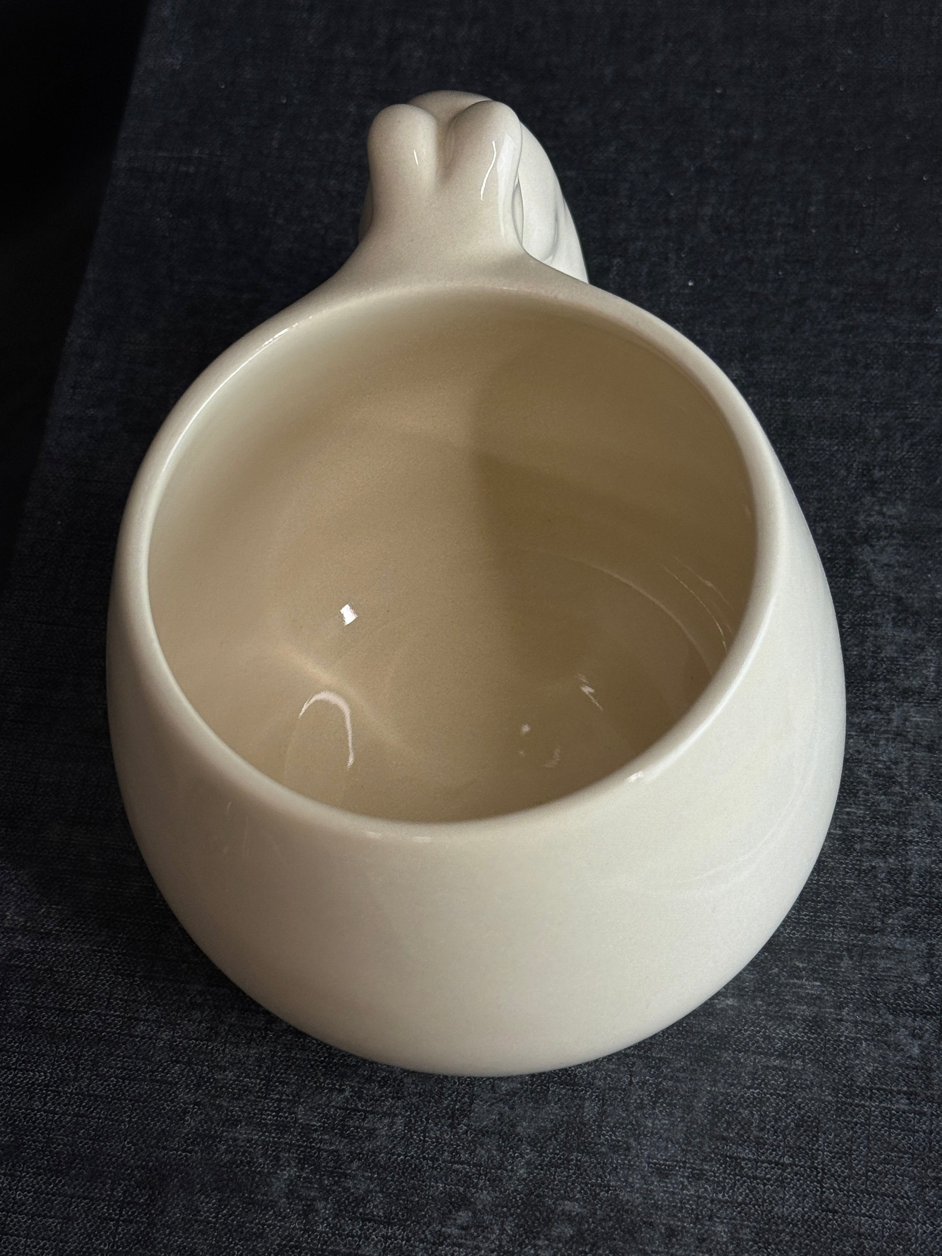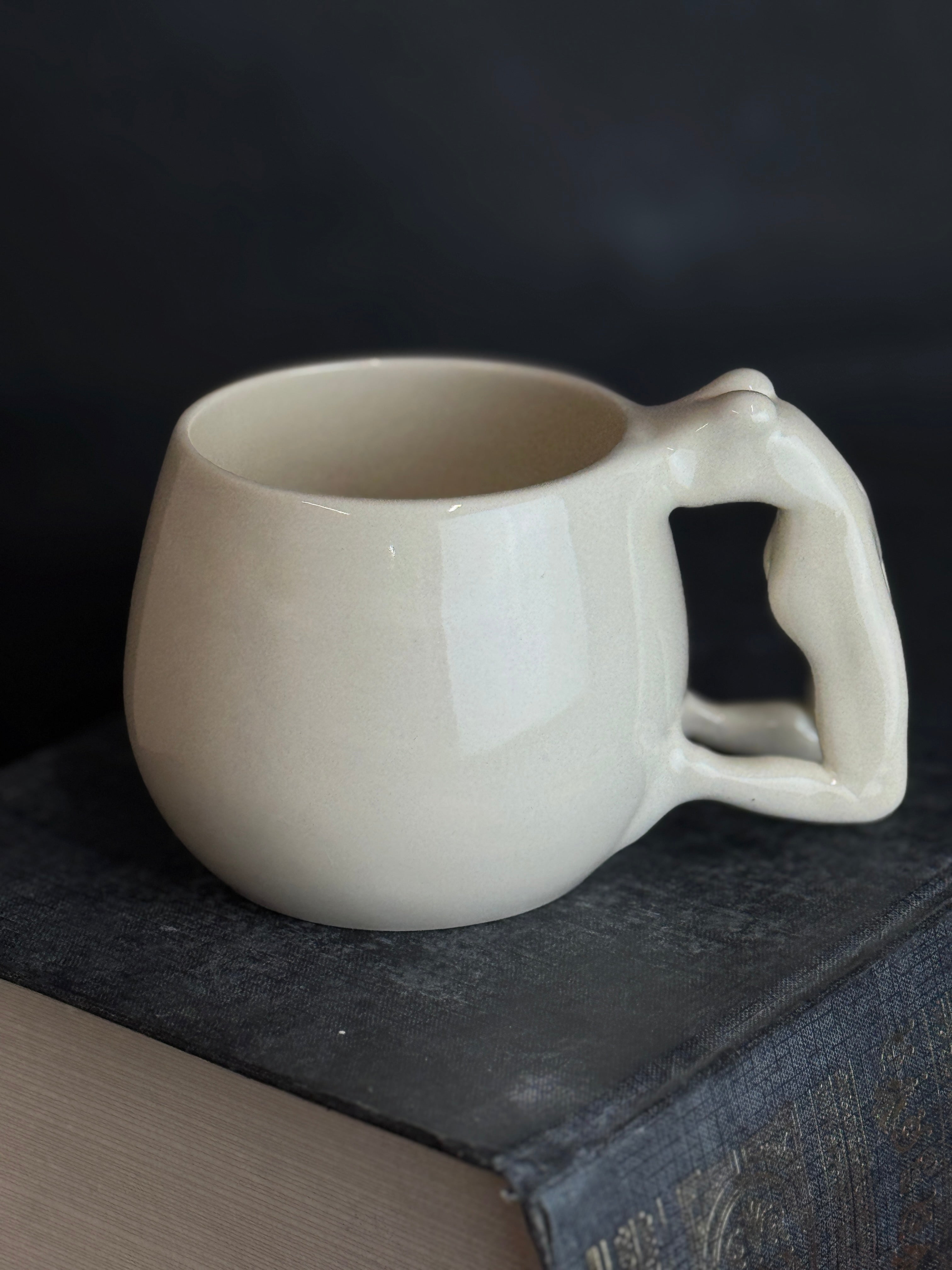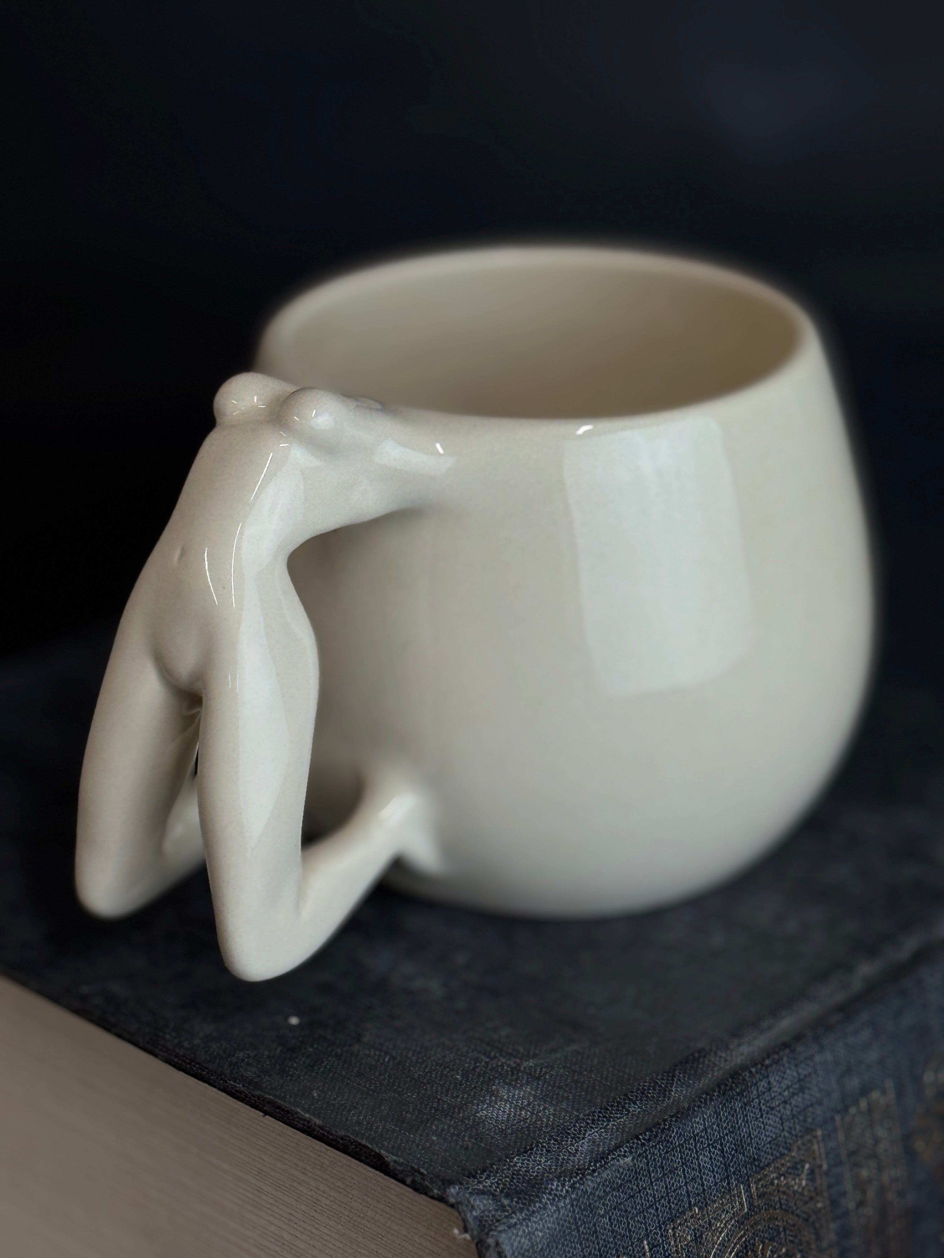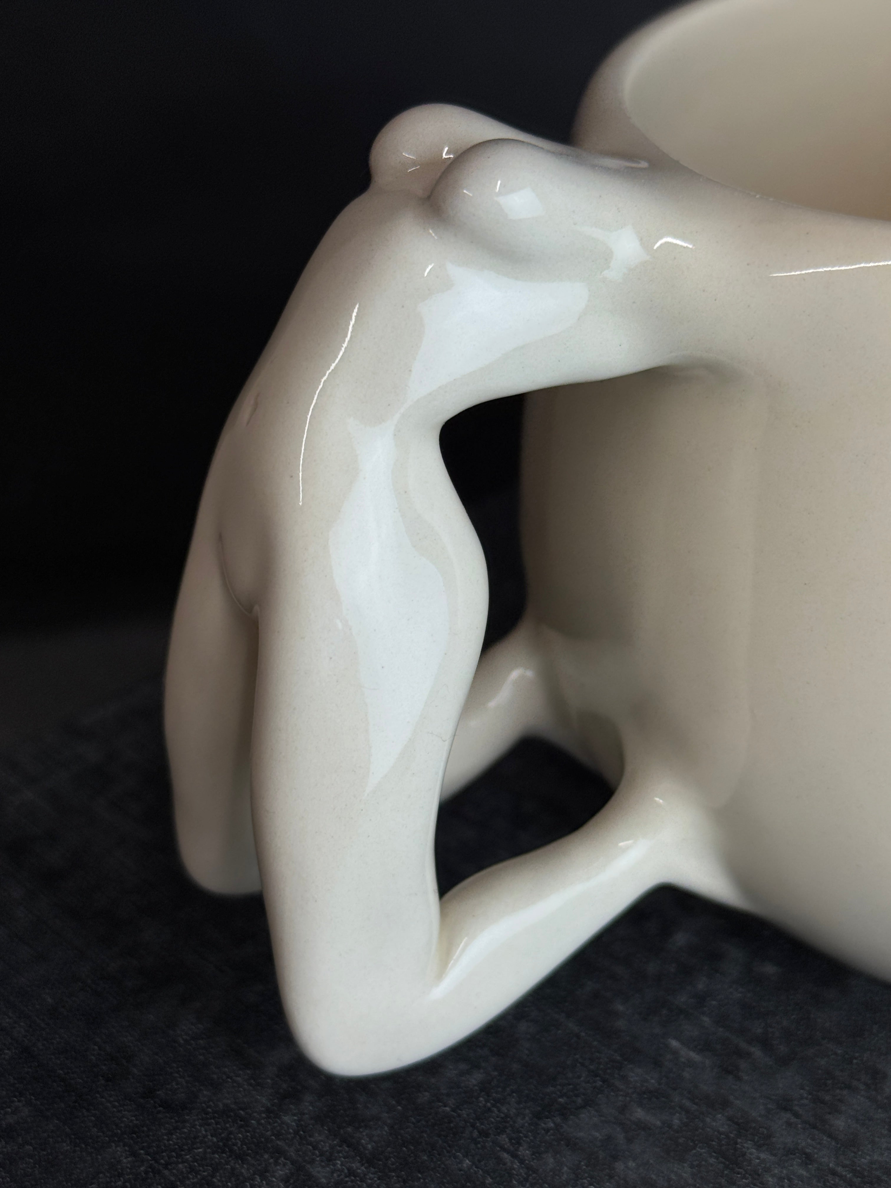 Balto molio puodelis su moters figūra. Dengtas skaidria glazūra.