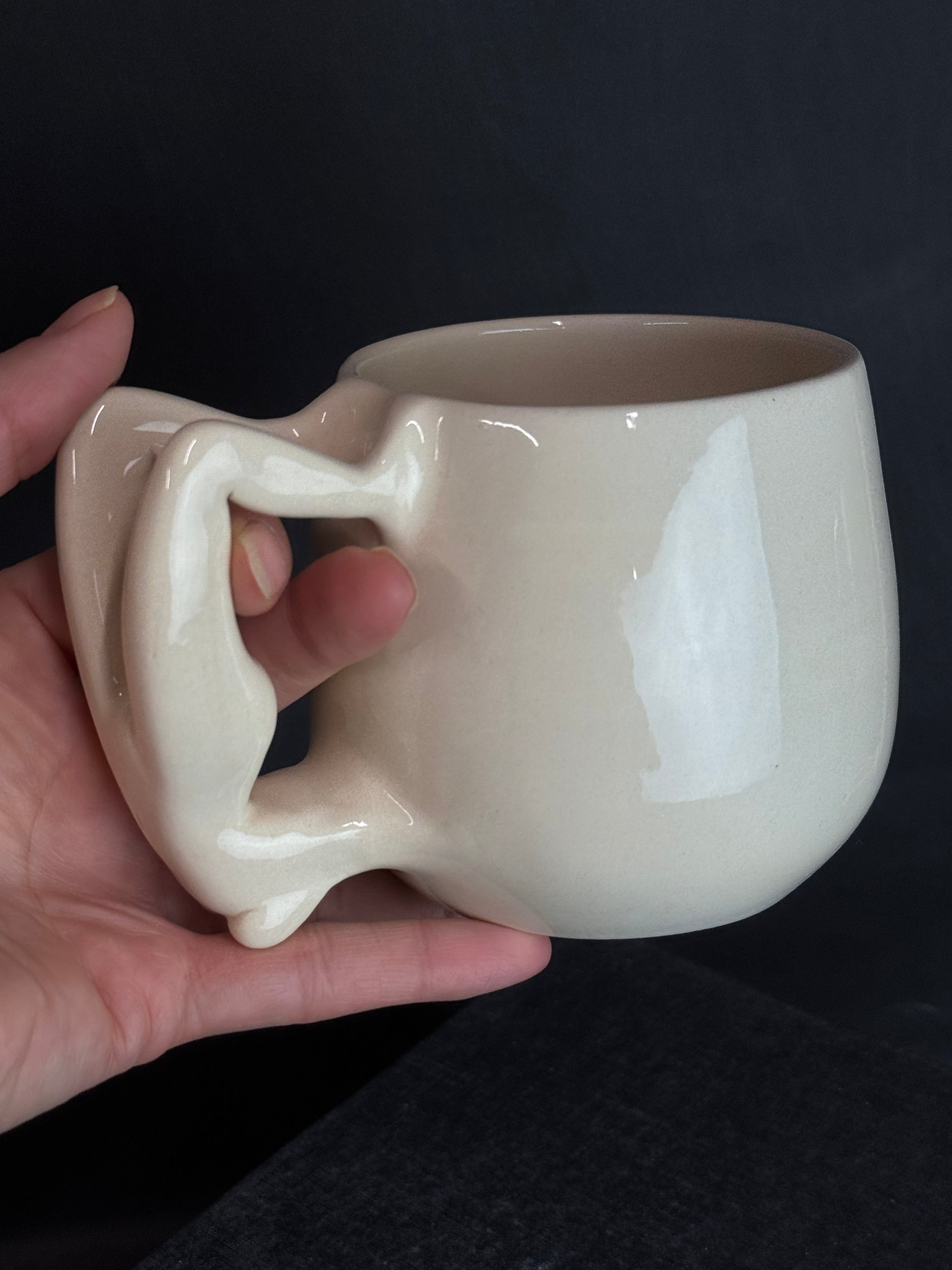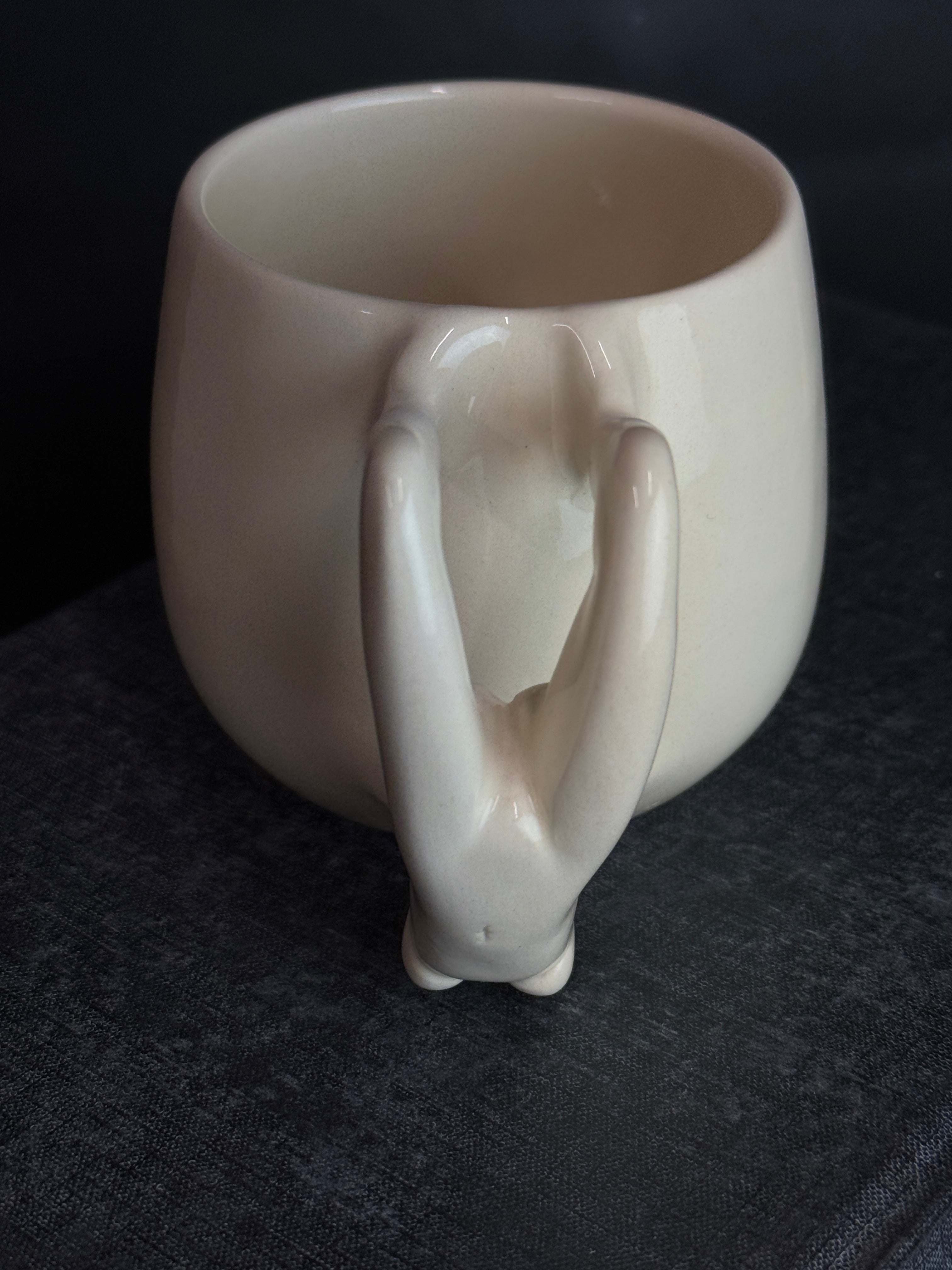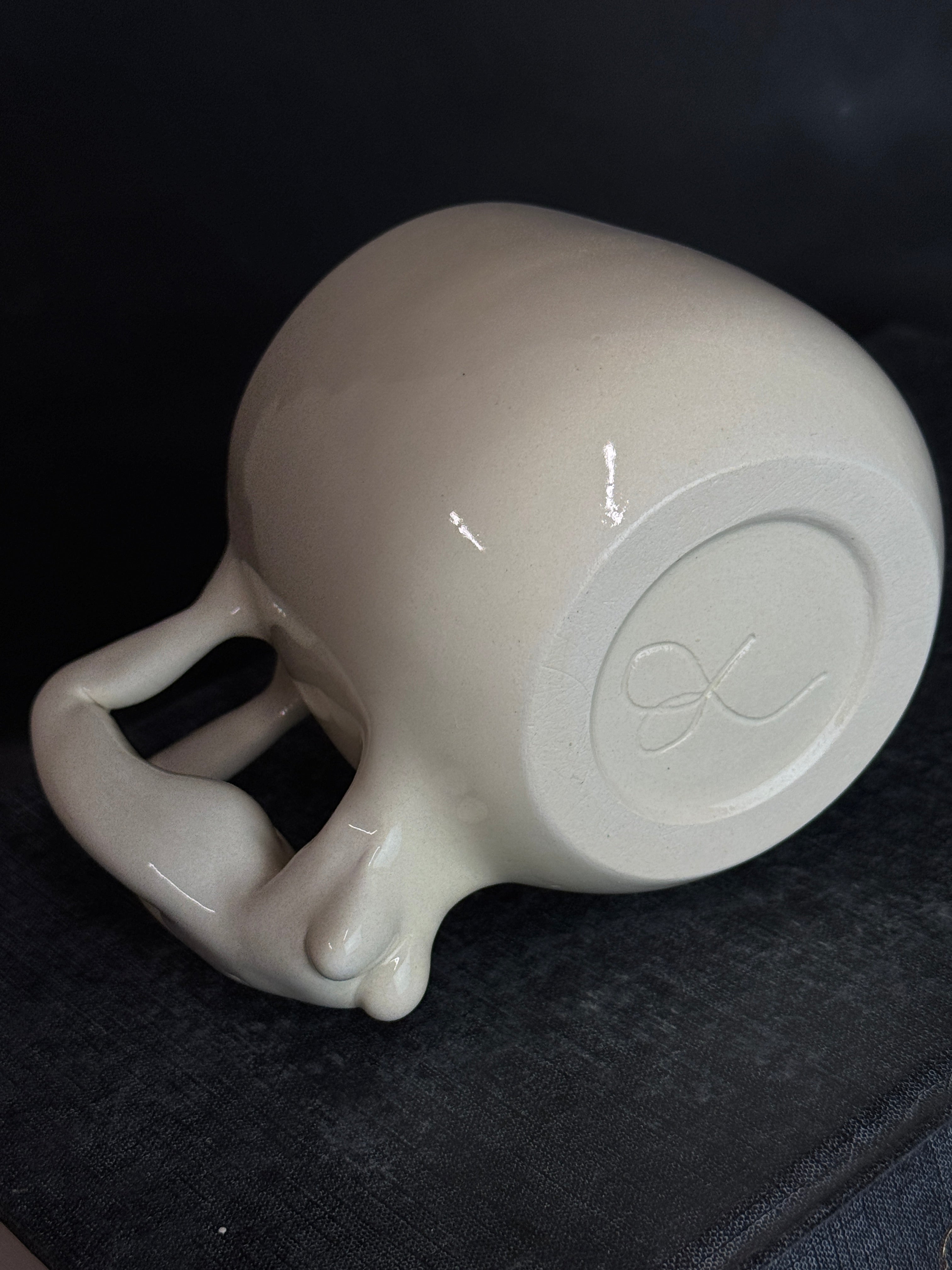 Balto molio puodelis su moters figūra. Dengtas skaidria glazūra.