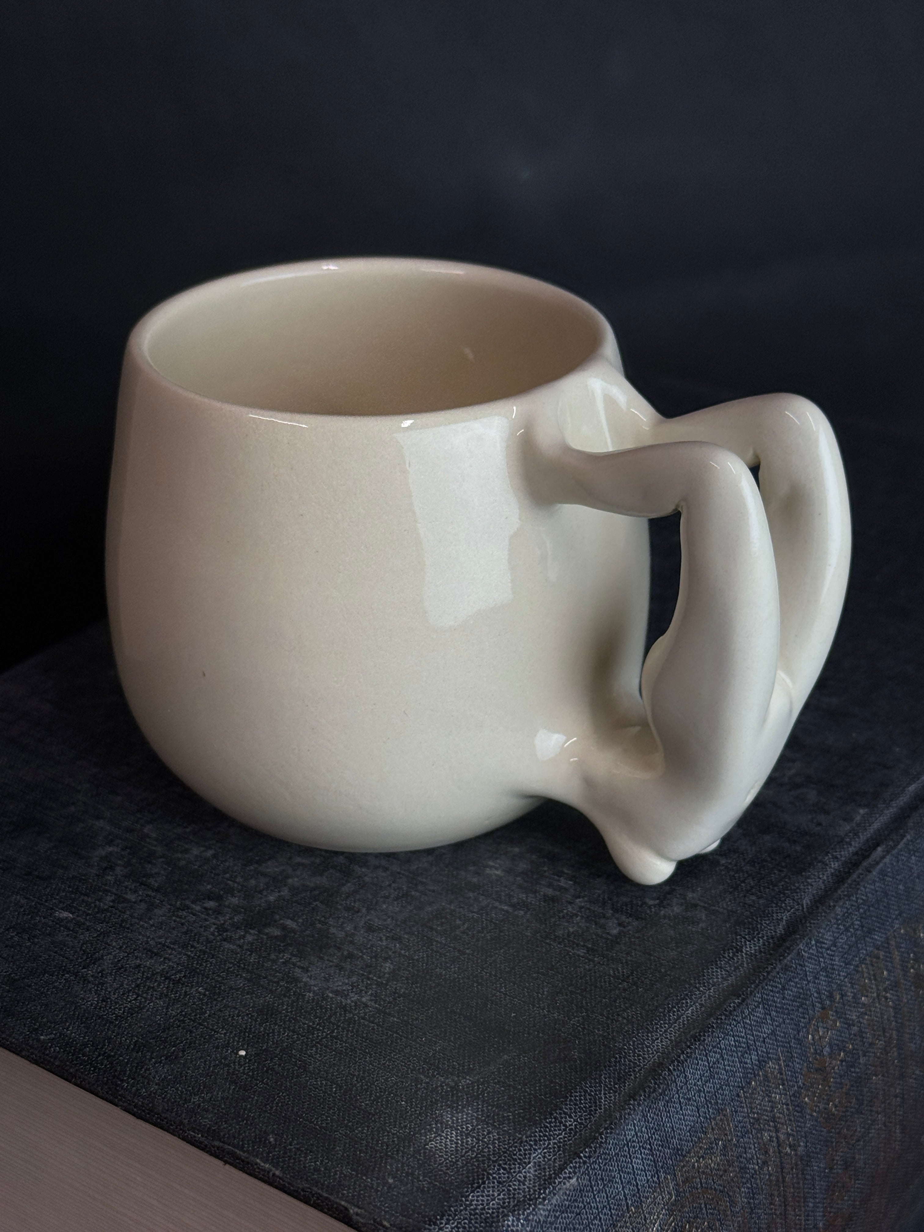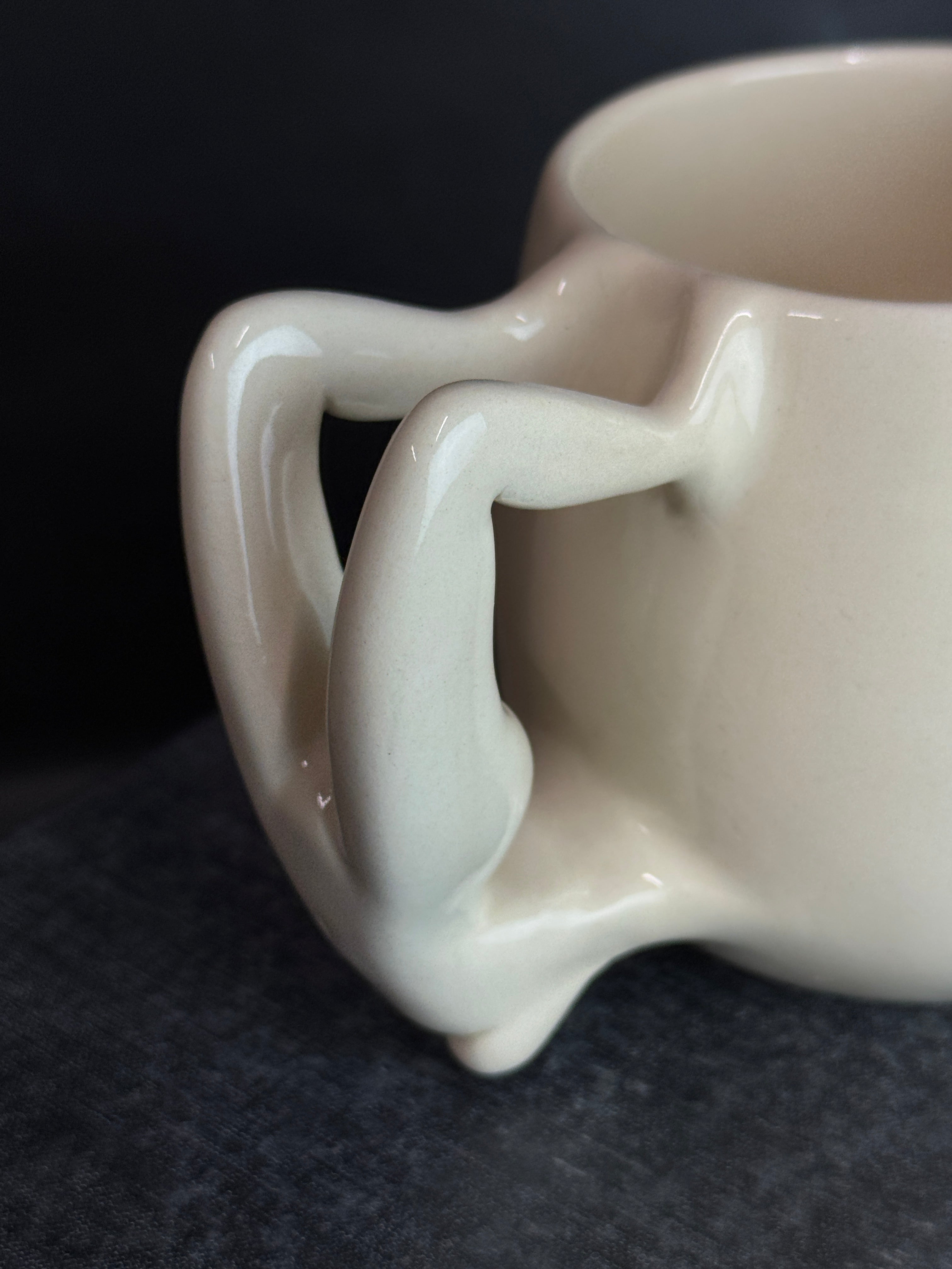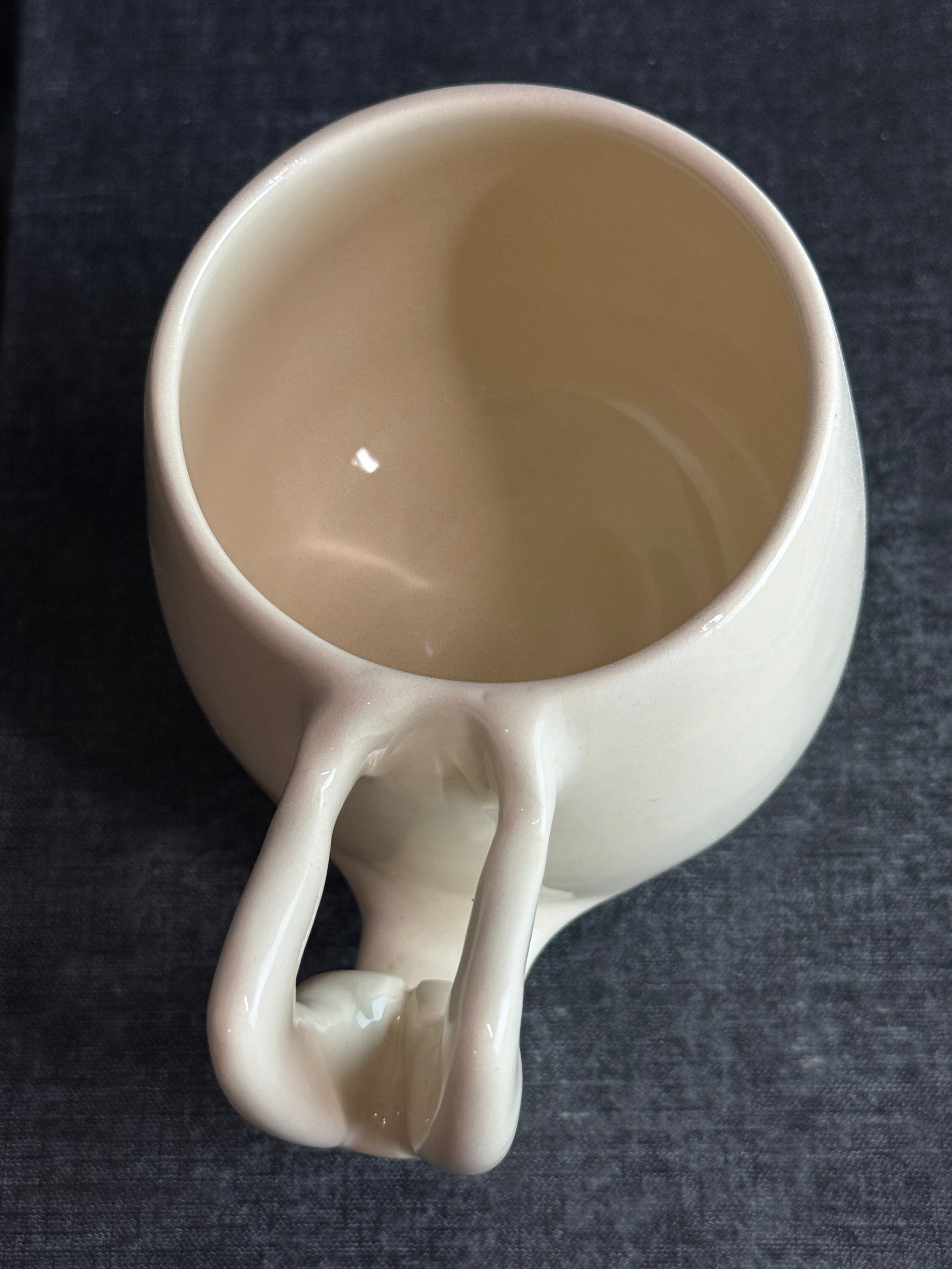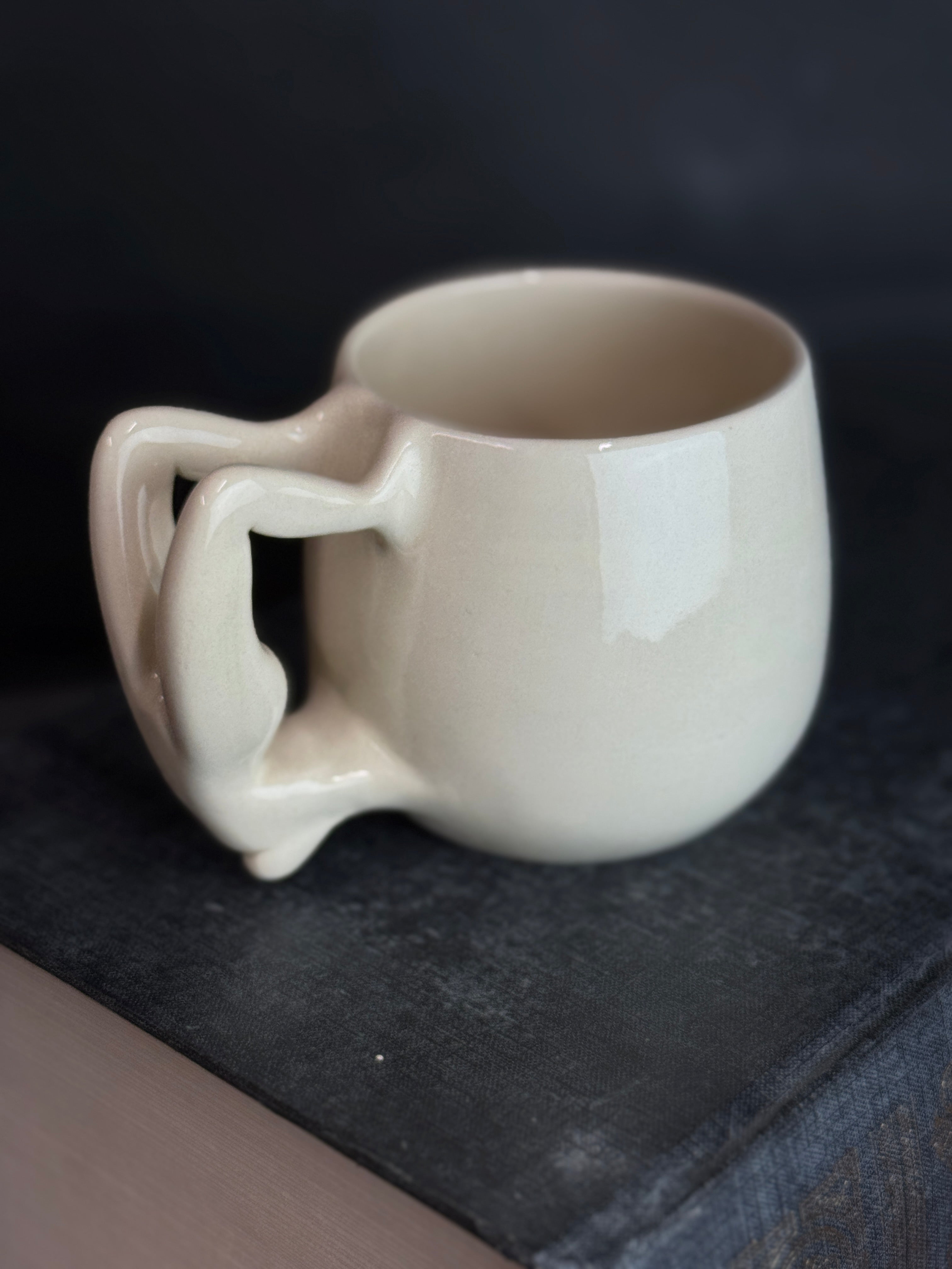 Balto molio puodelis su moters figūra. Dengtas skaidria glazūra.